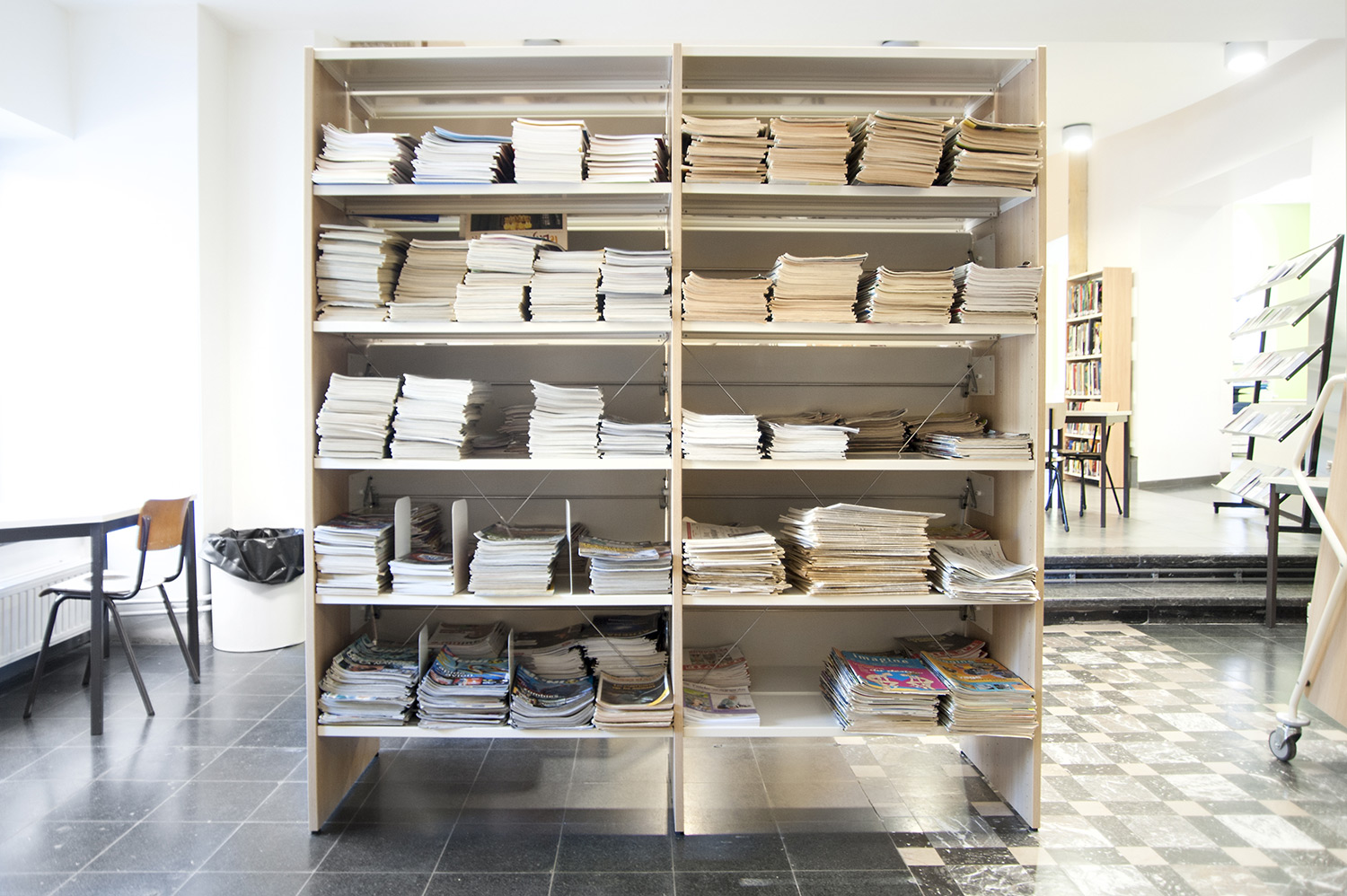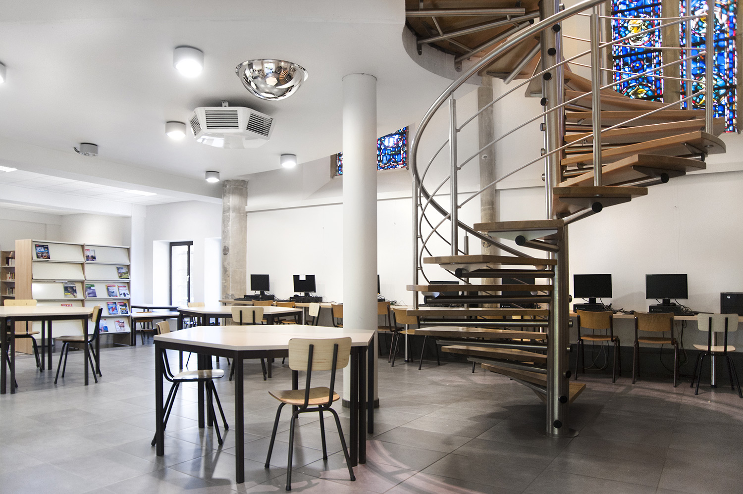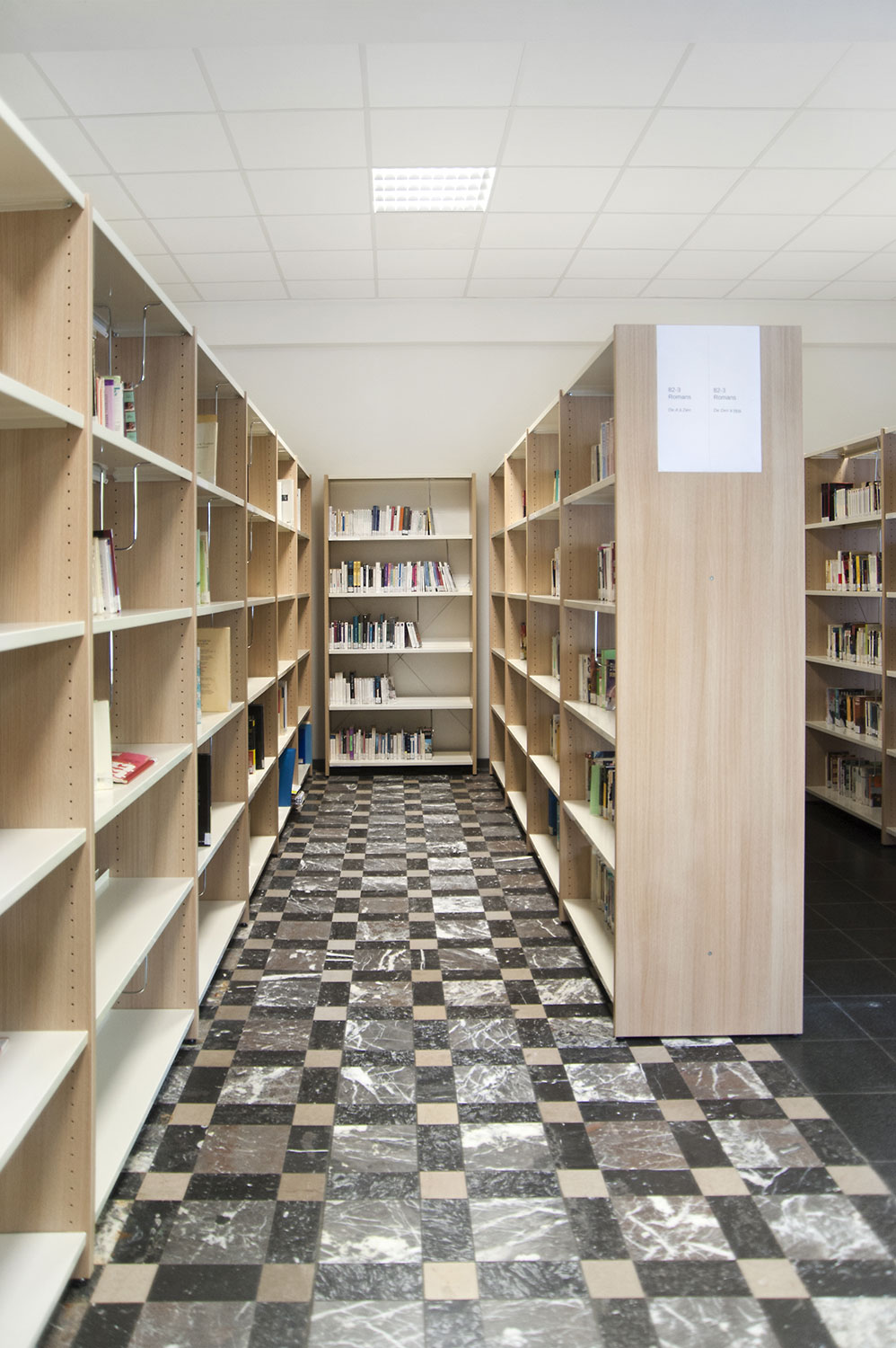 En 2010, la bibliothèque a déménagé dans une ancienne chapelle, mais le contraste entre le nouvel environnement et le mobilier vétuste était très marqué, tant au niveau pratique qu’esthétique. Deux exigences ont dû être prises en compte lors de la rénovation de l’intérieur : le cadre et le mode d’utilisation de la bibliothèque. Puisqu’elle se trouve dans une ancienne chapelle, il était très important de préserver les éléments architecturaux. Il était aussi essentiel que l’espace puisse faire office de salle de classe, parce que les professeurs enseignent parfois dans la bibliothèque pour que les étudiants puissent y chercher de la documentation.