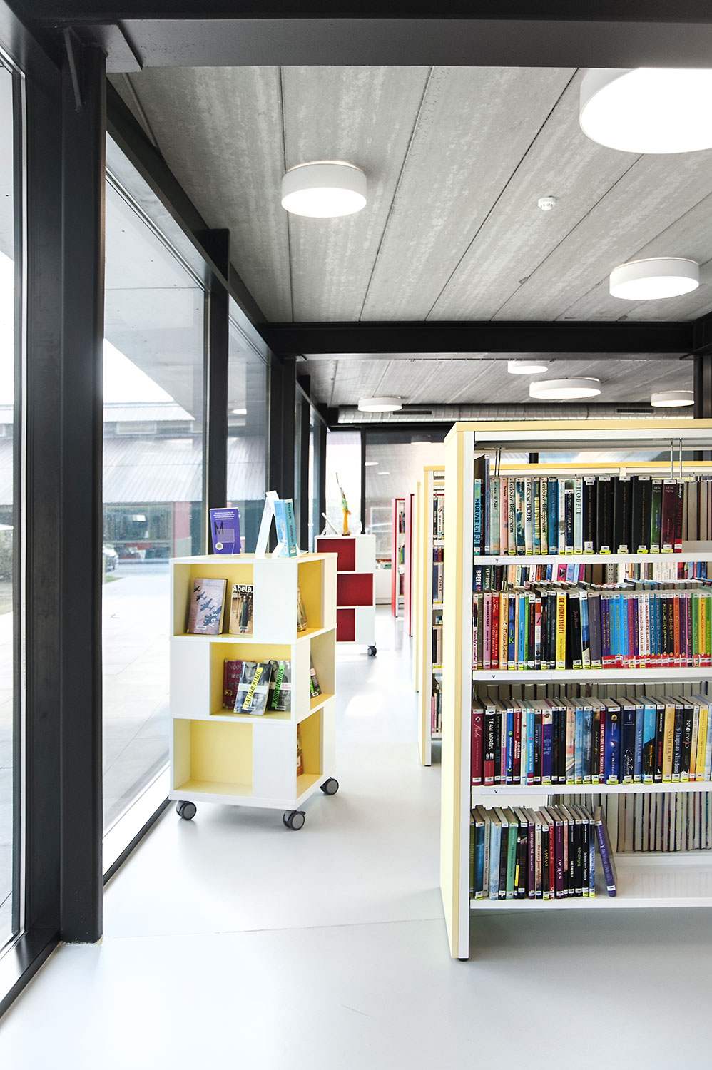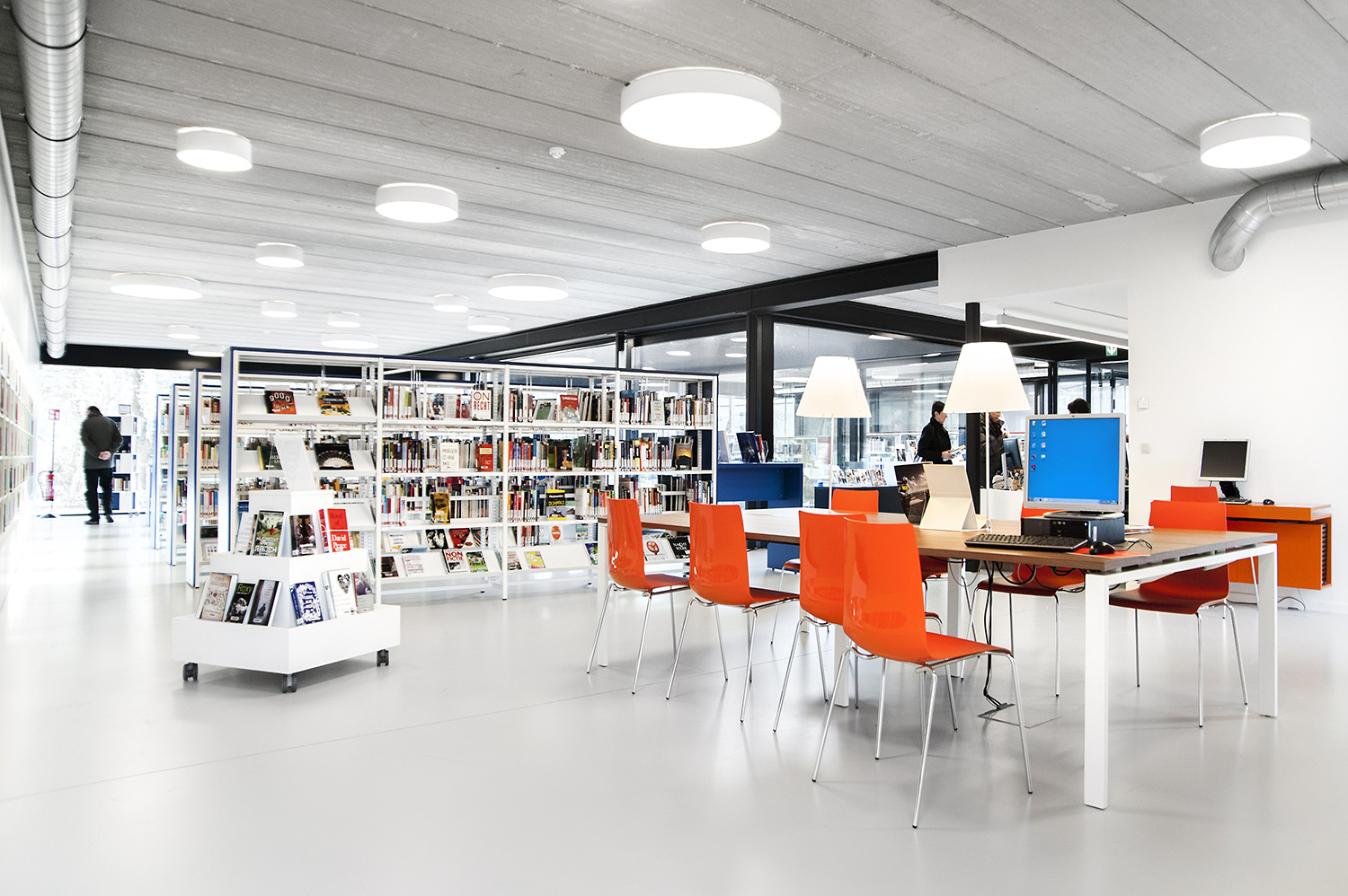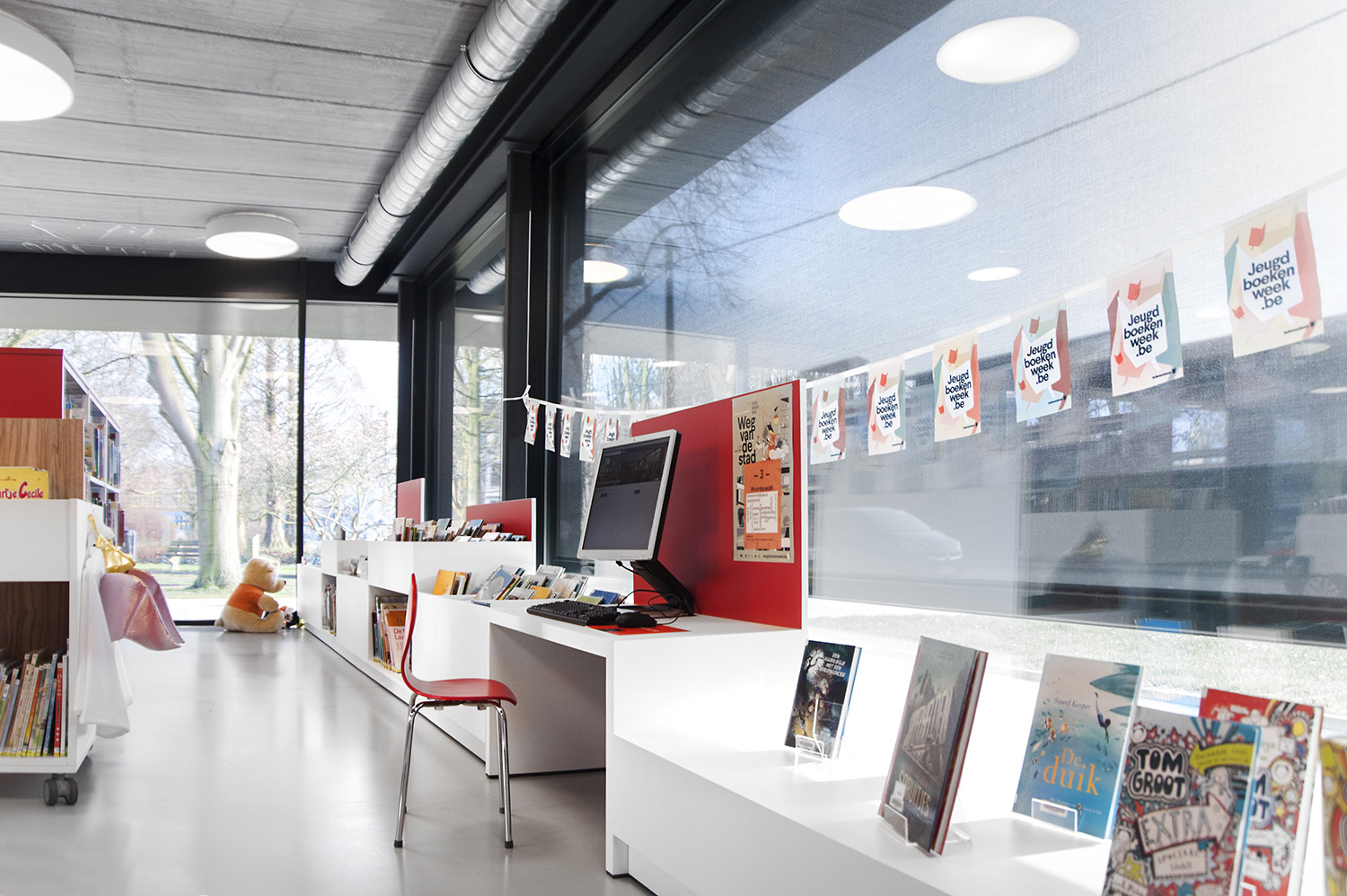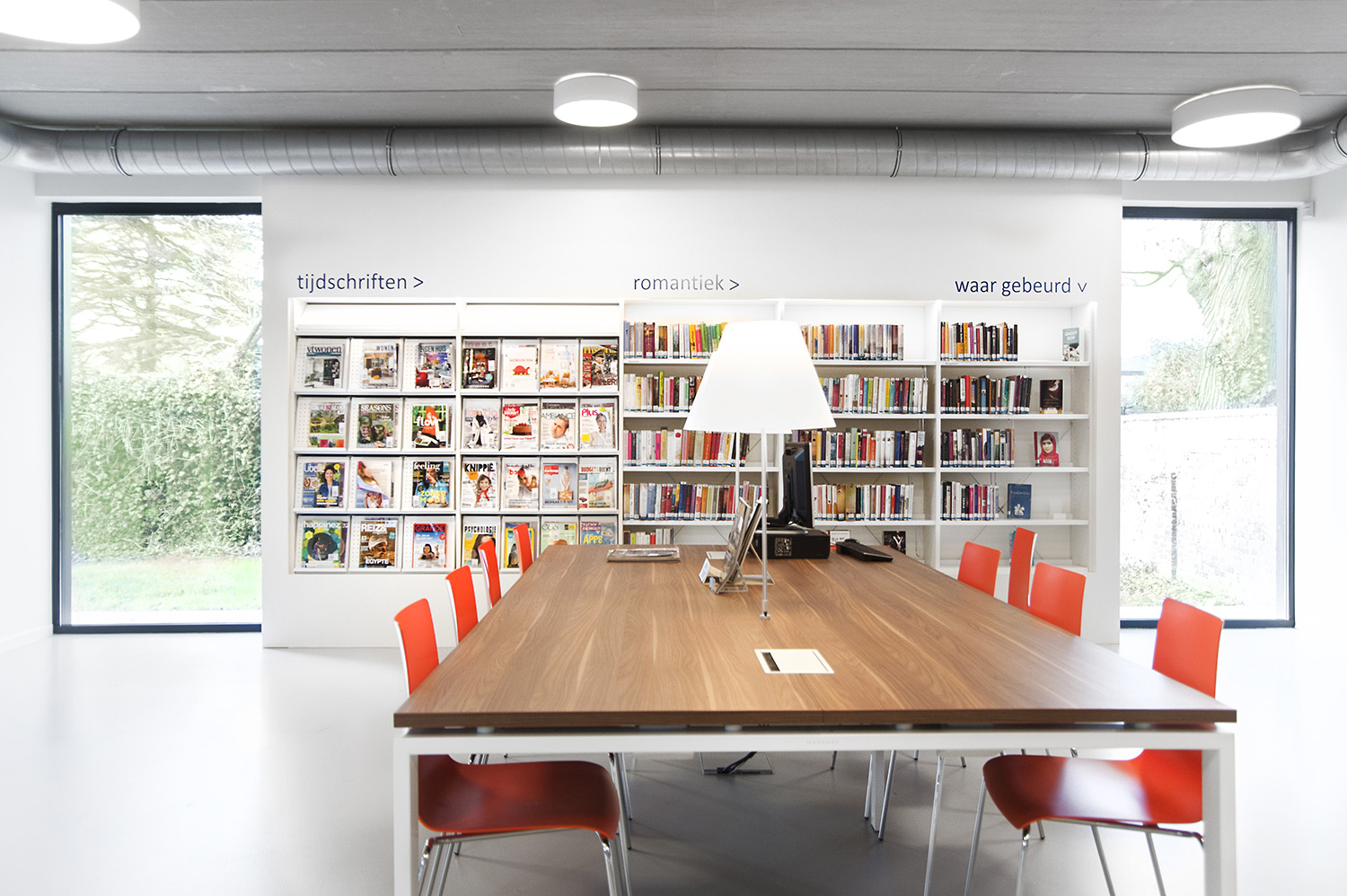 L’abondante lumière naturelle et la vue sur le parc sont les principaux atouts de cette bibliothèque agréable et intemporelle. Quelques notes colorées renvoient en outre aux différents groupes cibles et les tablettes ont été encastrées pour conserver un design minimaliste.