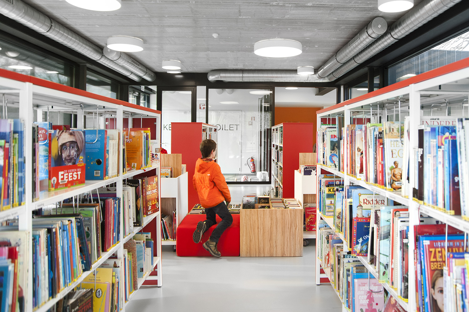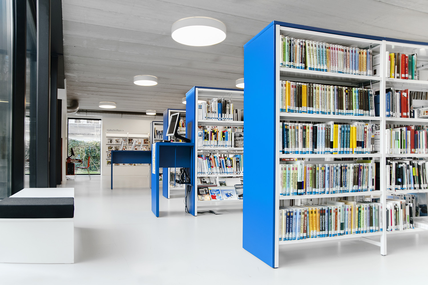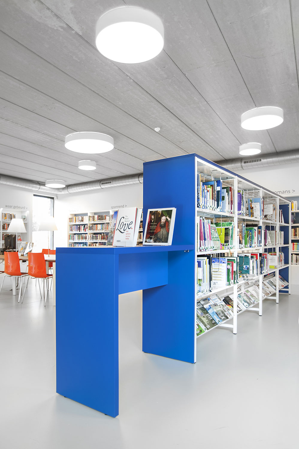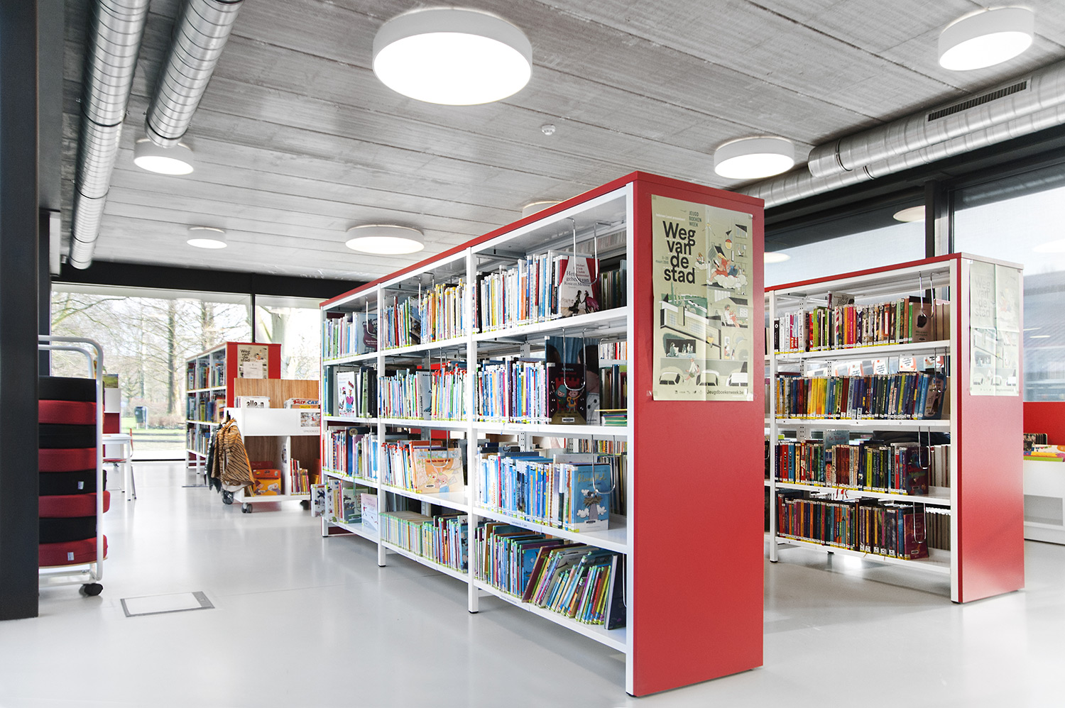 L’abondante lumière naturelle et la vue sur le parc sont les principaux atouts de cette bibliothèque agréable et intemporelle. Quelques notes colorées renvoient en outre aux différents groupes cibles et les tablettes ont été encastrées pour conserver un design minimaliste.