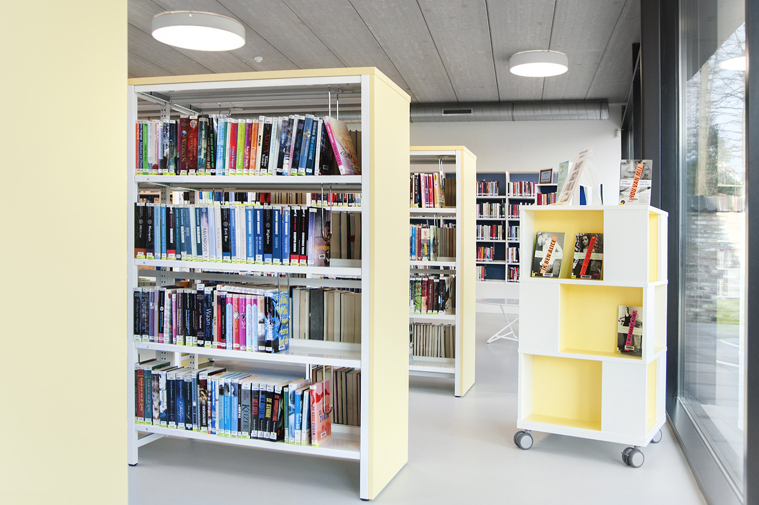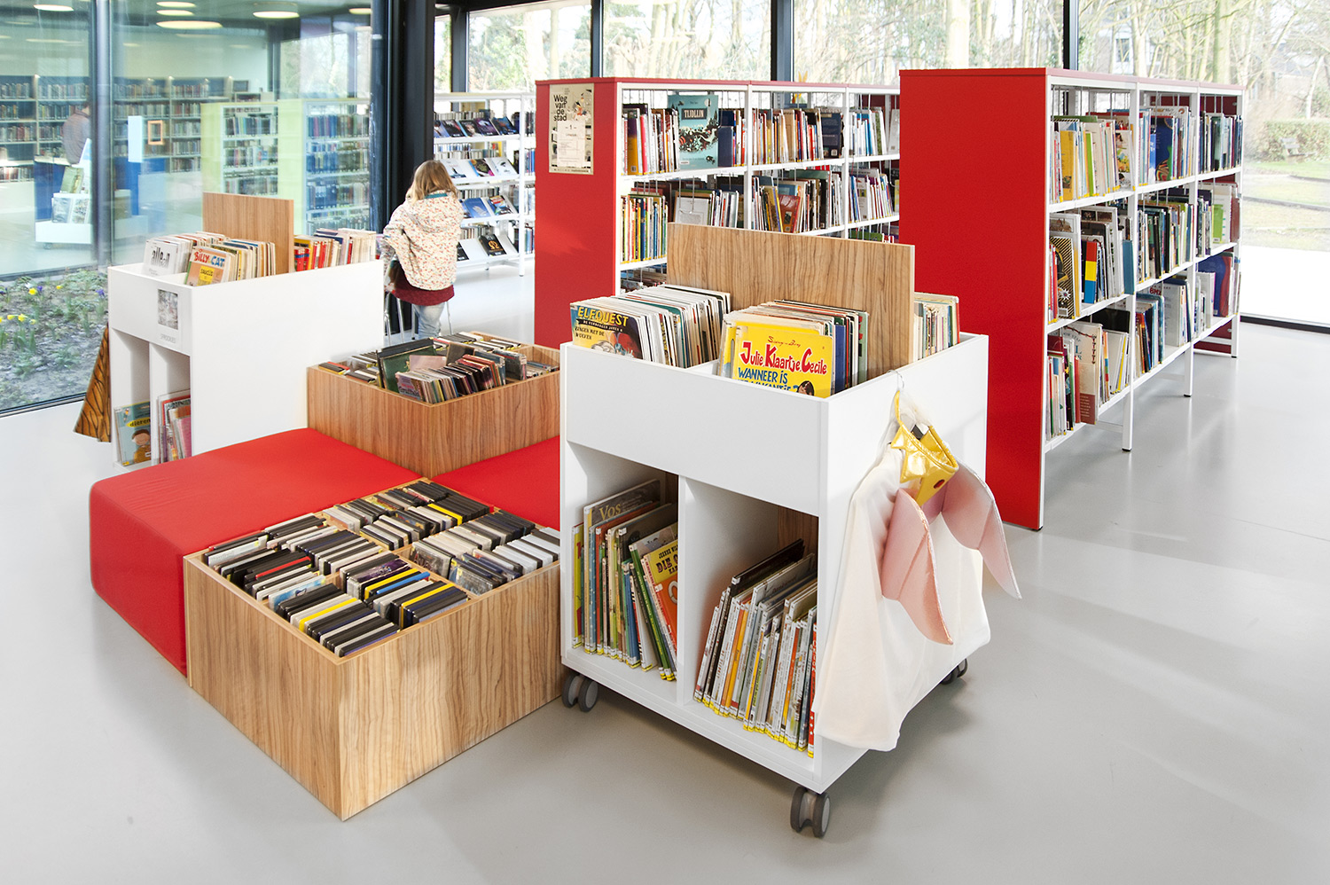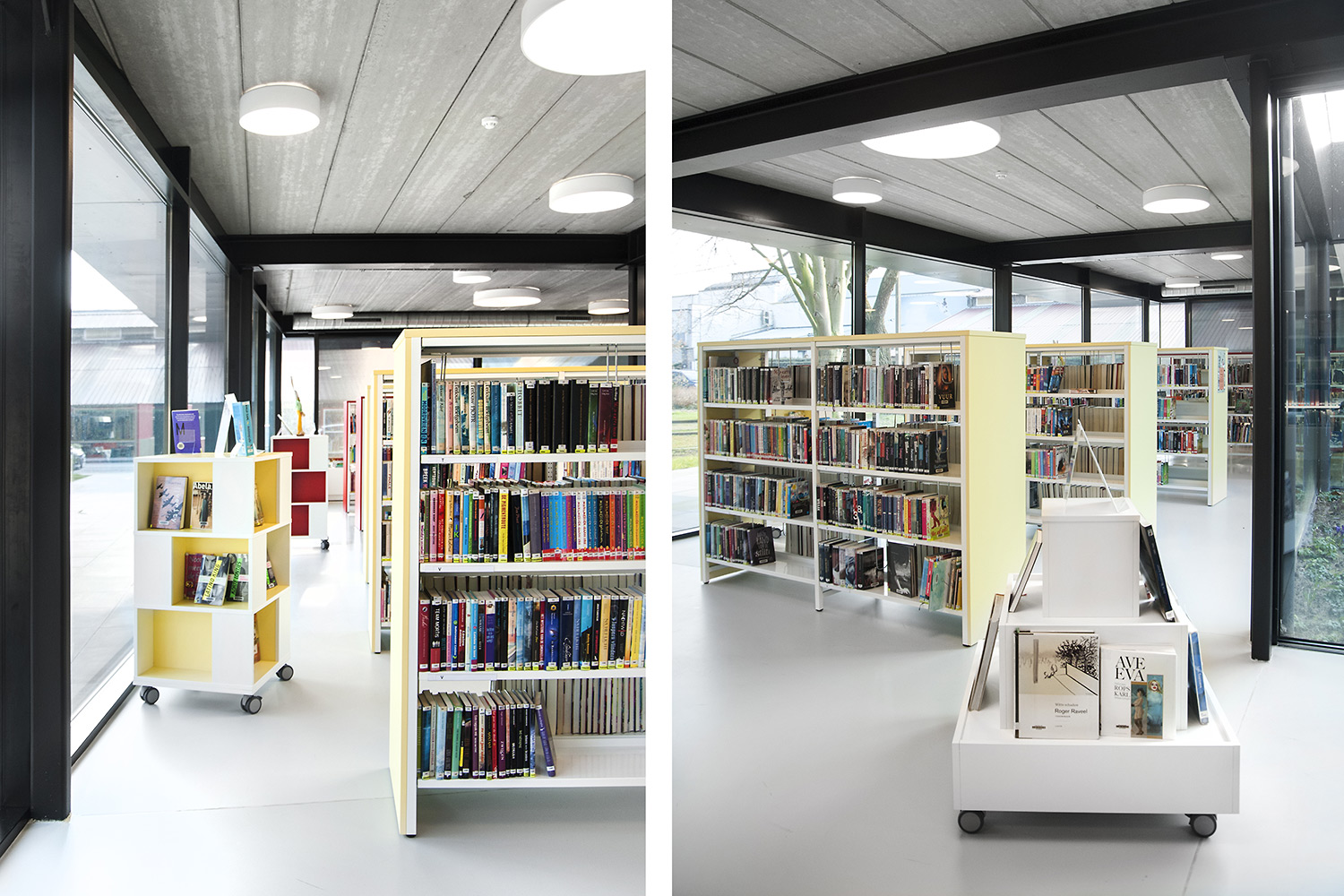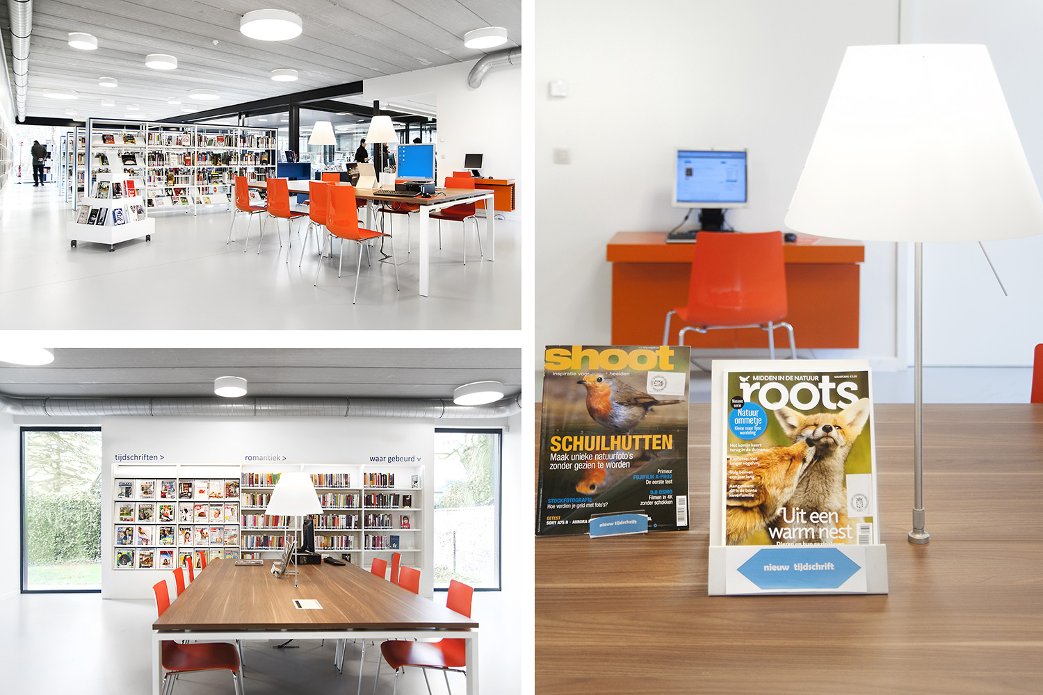 L’abondante lumière naturelle et la vue sur le parc sont les principaux atouts de cette bibliothèque agréable et intemporelle. Quelques notes colorées renvoient en outre aux différents groupes cibles et les tablettes ont été encastrées pour conserver un design minimaliste.