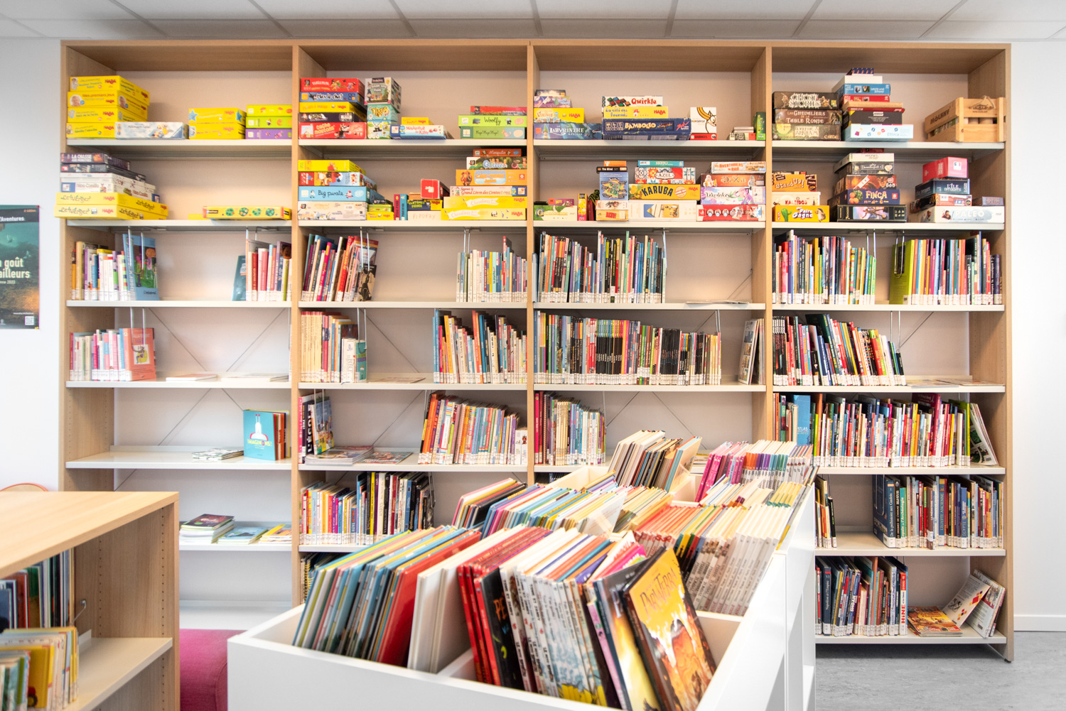 Les rayonnages sont moins nombreux qu'auparavant, ce qui permet une meilleure circulation intérieure. La bibliothèque est divisée en deux espaces distincts séparés par un corridor de circulation : un côté pour les jeunes et un côté pour les adultes. Les deux salles sont visuellement liées par la même utilisation des couleurs et des matériaux.