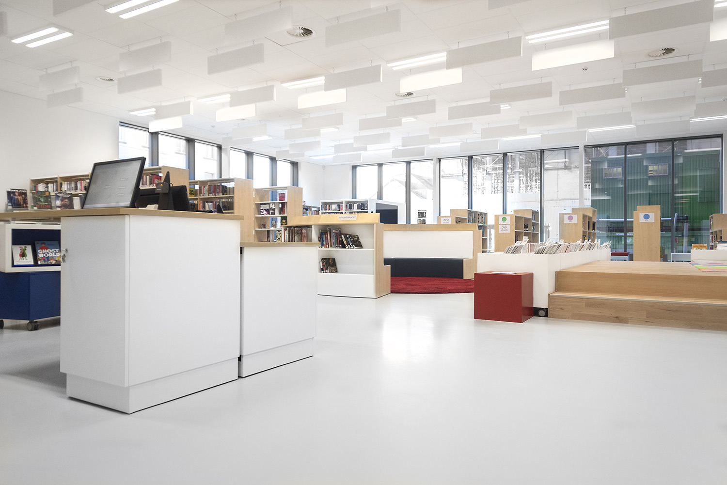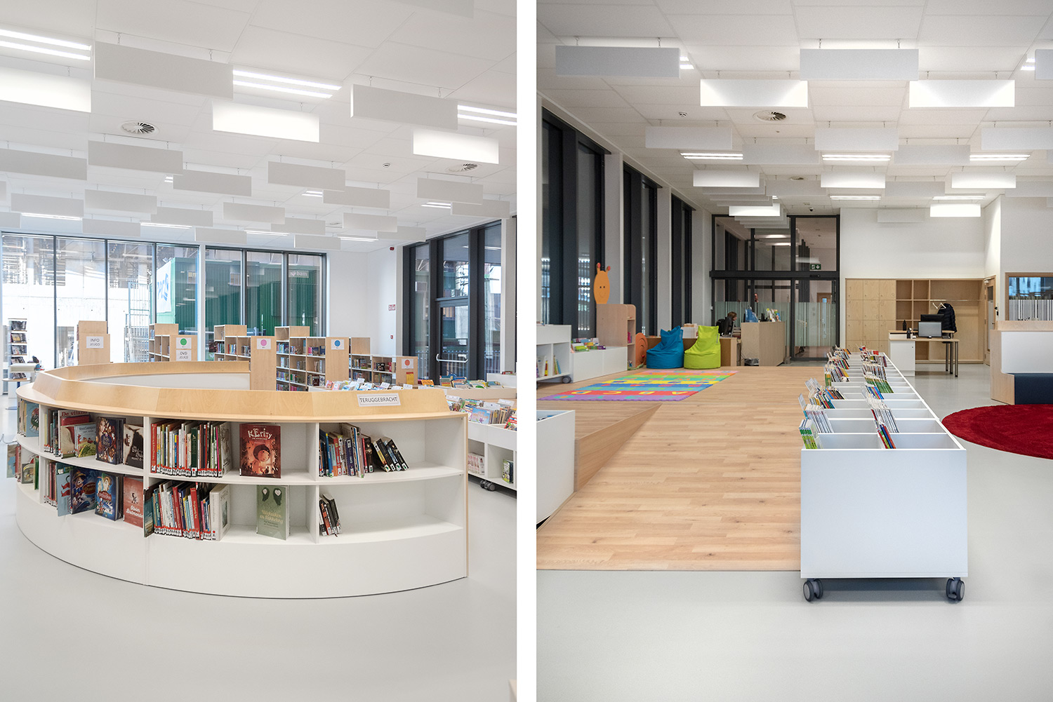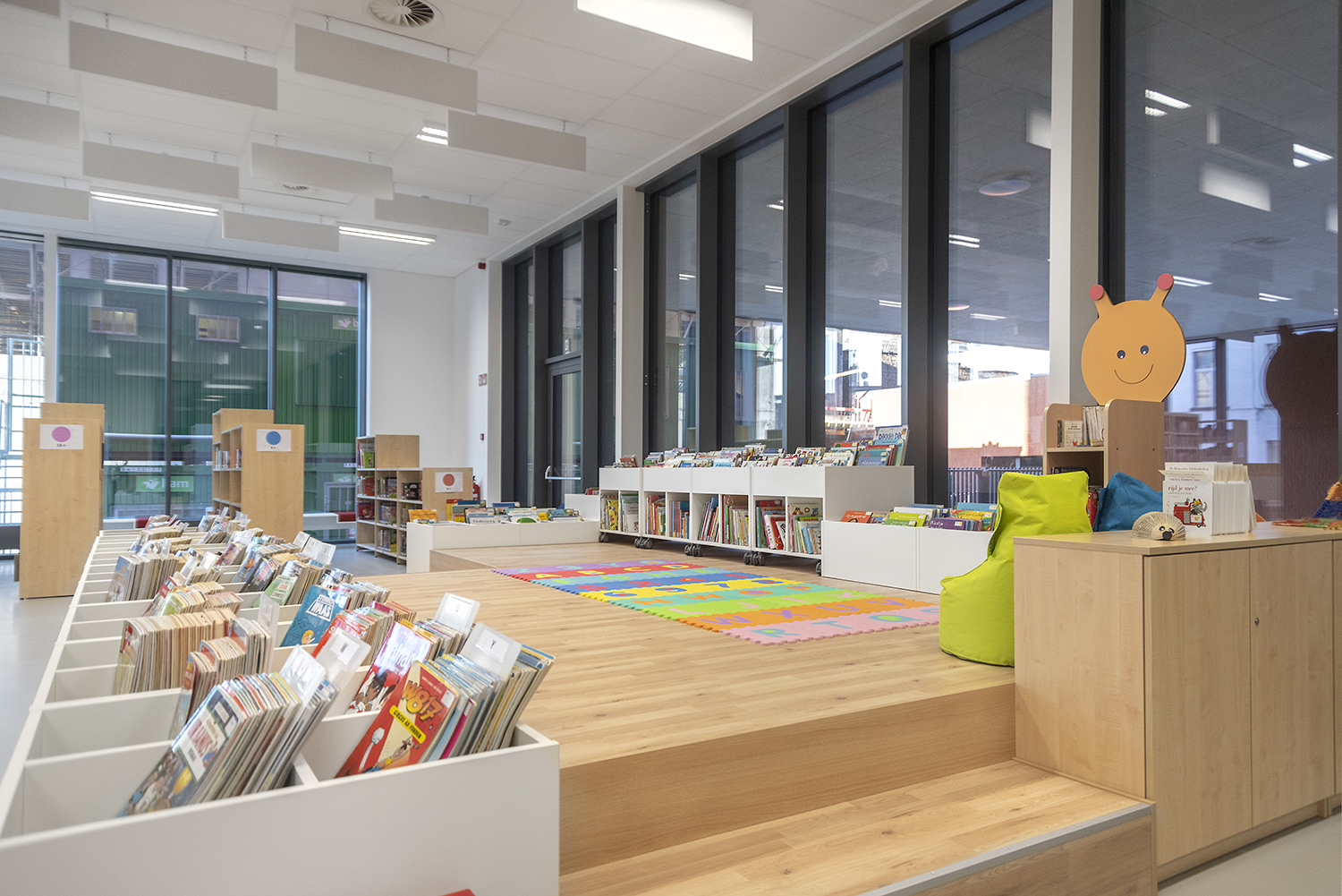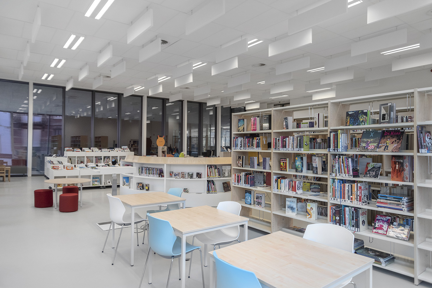 Une belle bibliothèque moderne fait partie de cette vision. La bibliothèque est intégrée dans un complexe plus vaste comprenant une salle de sport et une salle polyvalente, ce qui facilite de nouvelles collaborations. La bibliothèque fait partie de la vie quotidienne, après l'école ou le sport, on peut facilement visiter la bibliothèque. L'aménagement intérieur a été conçu sur base d’une bonne visibilité, une position logique, de nombreux sièges et la possibilité de respecter la discrétion des lecteurs. La circulation est également prise en compte : où entre le client et comment le guider de manière optimale? Le client se promène de façon logique et fluide: du coin bébé aux premiers lecteurs en passant par le Cocoon adolescent et la section adultes. En cours de route, il passe devant les bandes dessinées, les DVD, les lieux de lecture,....