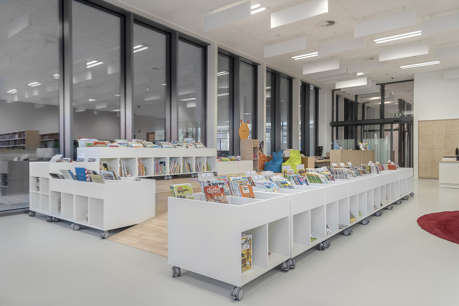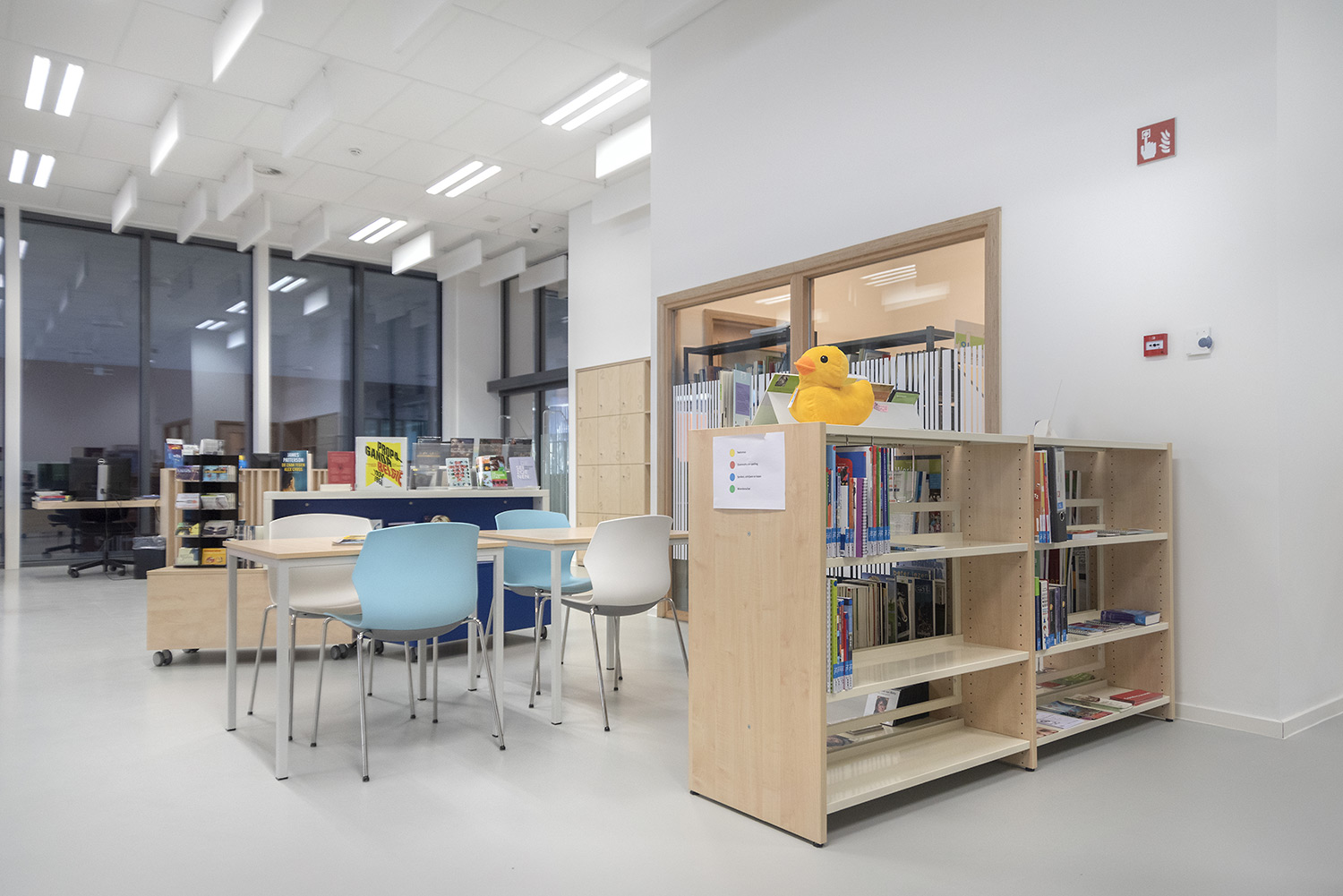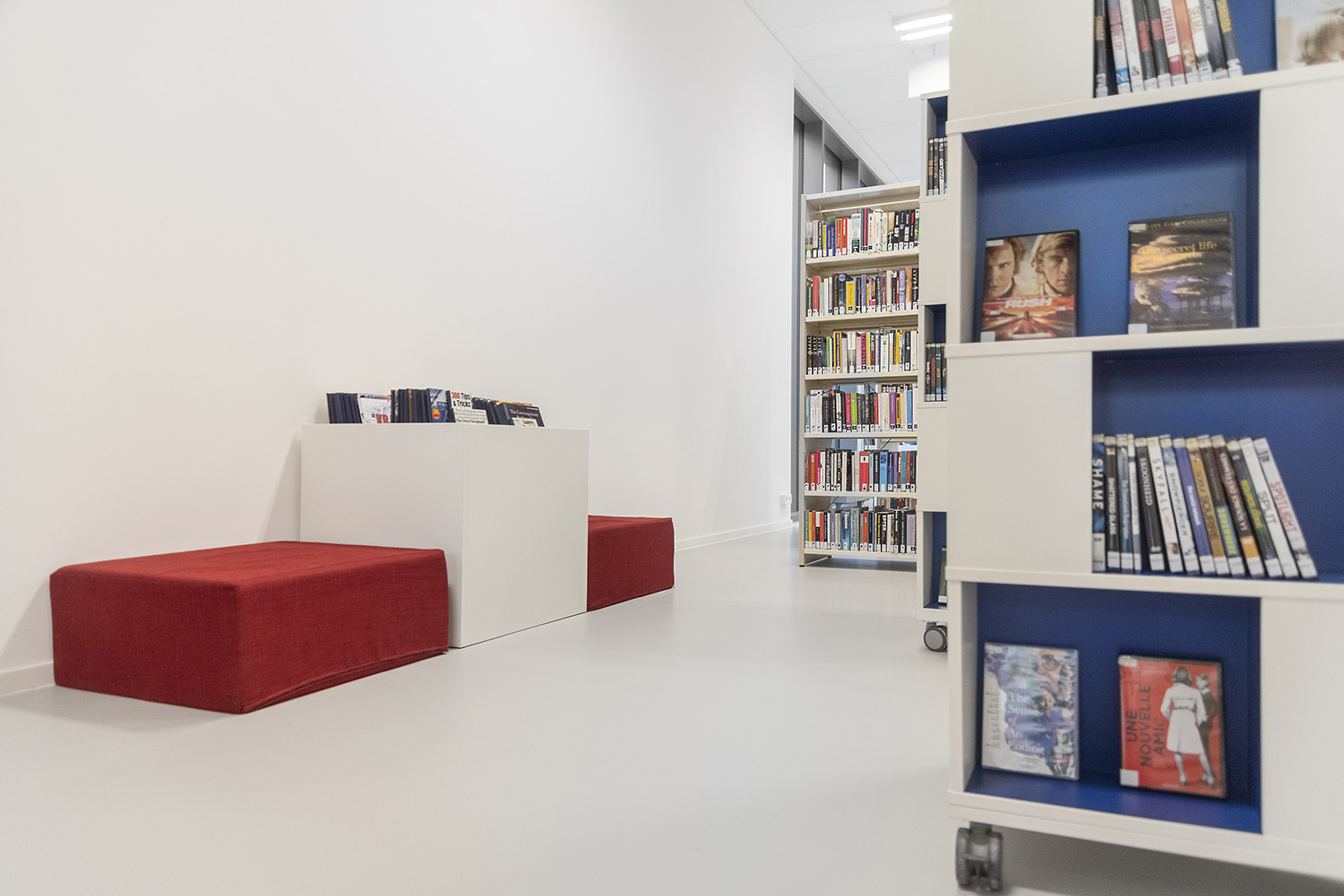 Une belle bibliothèque moderne fait partie de cette vision. La bibliothèque est intégrée dans un complexe plus vaste comprenant une salle de sport et une salle polyvalente, ce qui facilite de nouvelles collaborations. La bibliothèque fait partie de la vie quotidienne, après l'école ou le sport, on peut facilement visiter la bibliothèque. L'aménagement intérieur a été conçu sur base d’une bonne visibilité, une position logique, de nombreux sièges et la possibilité de respecter la discrétion des lecteurs. La circulation est également prise en compte : où entre le client et comment le guider de manière optimale? Le client se promène de façon logique et fluide: du coin bébé aux premiers lecteurs en passant par le Cocoon adolescent et la section adultes. En cours de route, il passe devant les bandes dessinées, les DVD, les lieux de lecture,....
