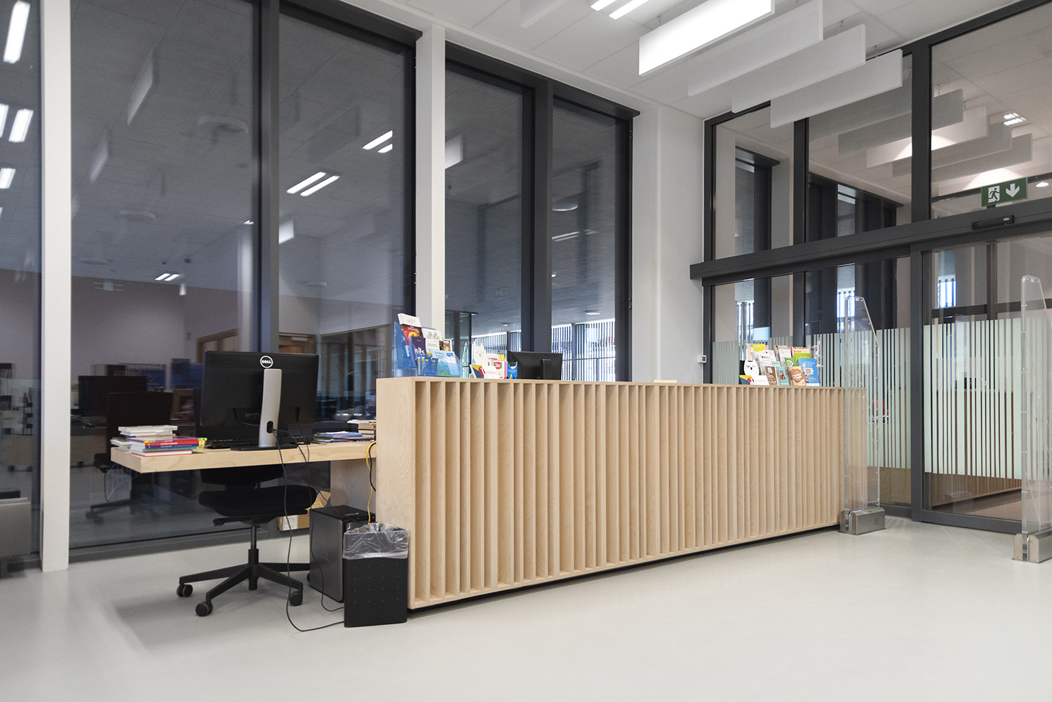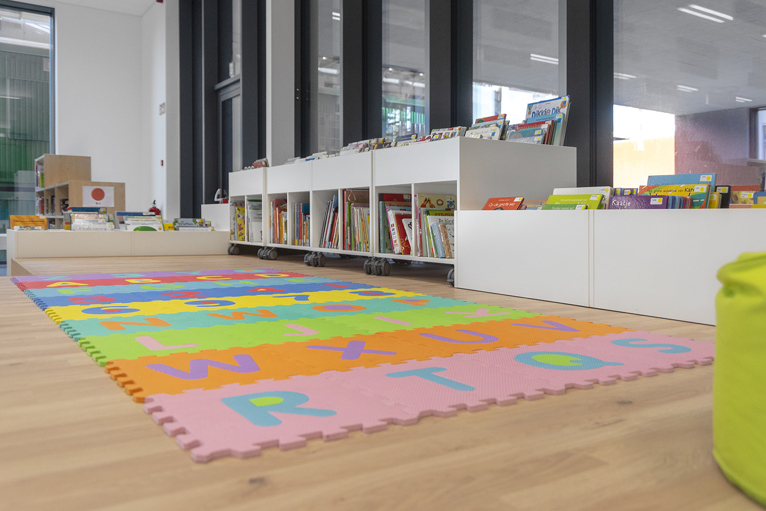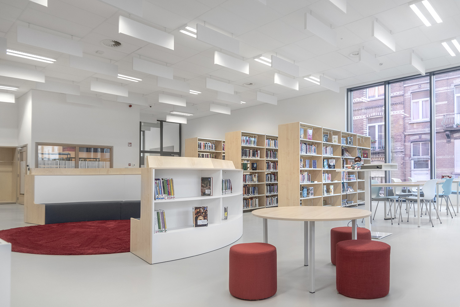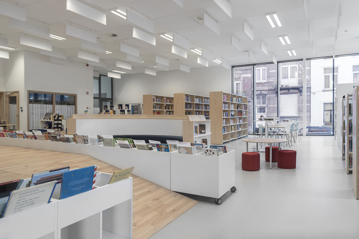 Une belle bibliothèque moderne fait partie de cette vision. La bibliothèque est intégrée dans un complexe plus vaste comprenant une salle de sport et une salle polyvalente, ce qui facilite de nouvelles collaborations. La bibliothèque fait partie de la vie quotidienne, après l'école ou le sport, on peut facilement visiter la bibliothèque. L'aménagement intérieur a été conçu sur base d’une bonne visibilité, une position logique, de nombreux sièges et la possibilité de respecter la discrétion des lecteurs. La circulation est également prise en compte : où entre le client et comment le guider de manière optimale? Le client se promène de façon logique et fluide: du coin bébé aux premiers lecteurs en passant par le Cocoon adolescent et la section adultes. En cours de route, il passe devant les bandes dessinées, les DVD, les lieux de lecture,....