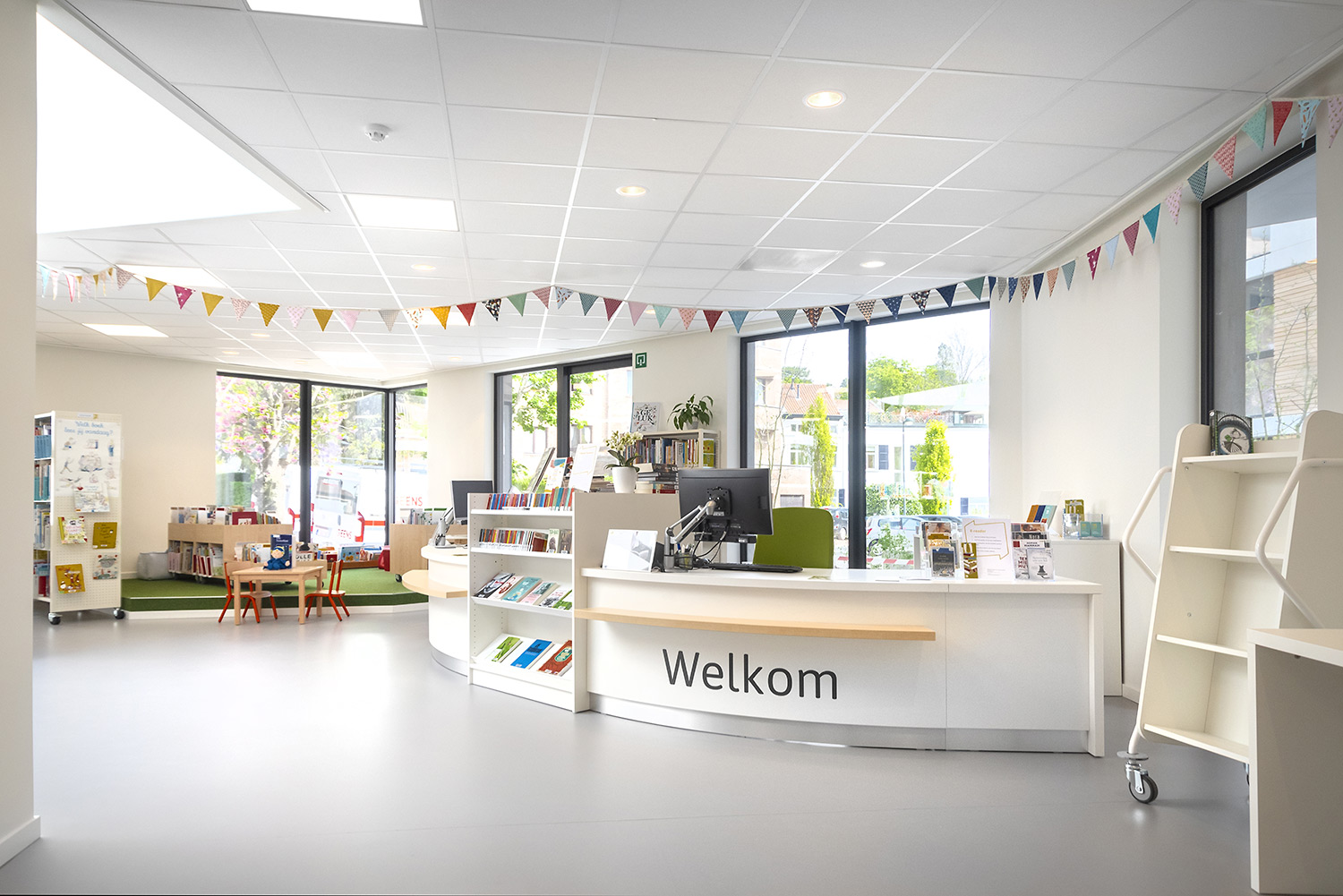 Pour la nouvelle bibliothèque, on a choisi résolument pour l'harmonie des couleurs: murs et supports blancs, des touches en bois de bouleau. Les visiteurs apprécient la lumière du jour, l'esthétique et le confort de l'intérieur chaleureux et aiment bien rester un peu plus longtemps. La bibliothèque comme un salon chaleureux en ville ...