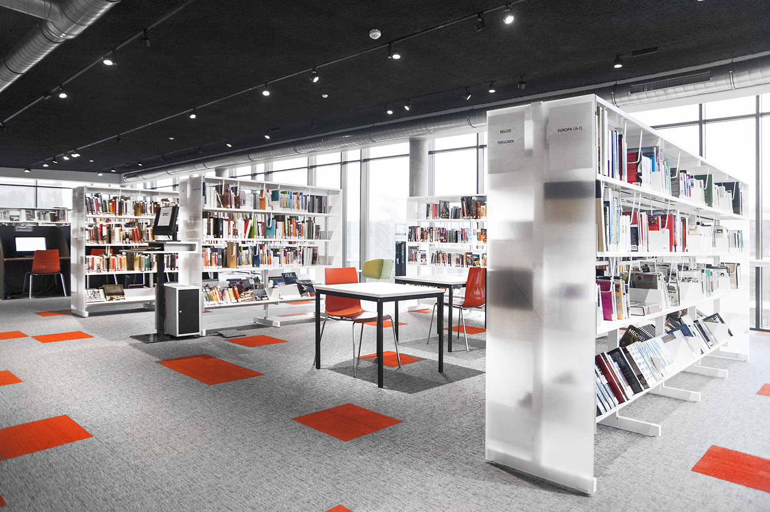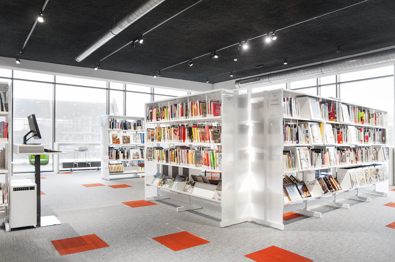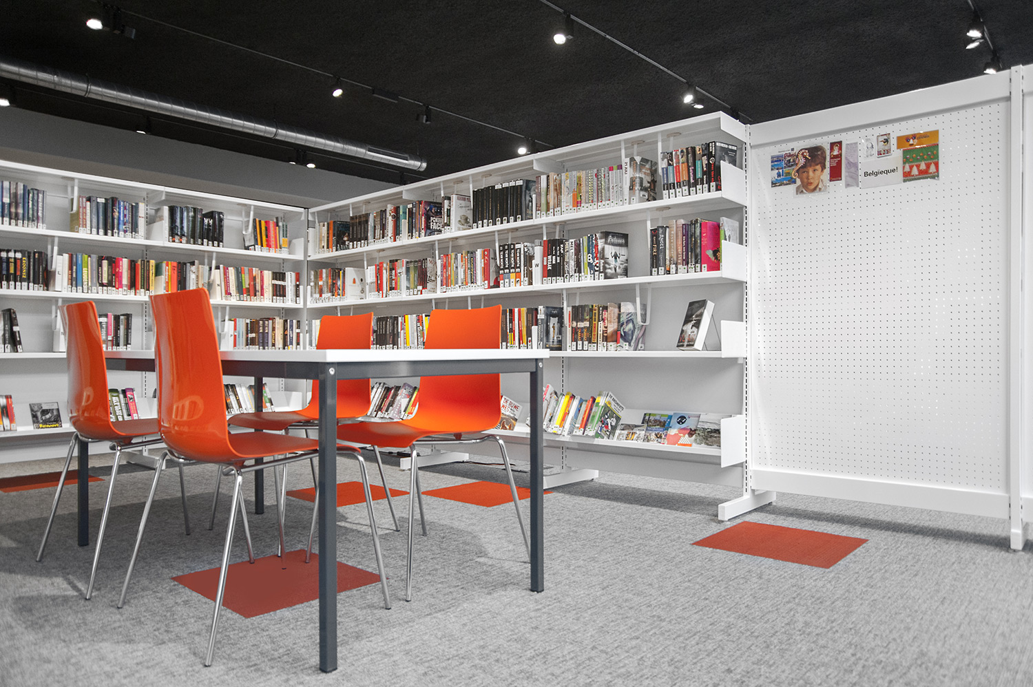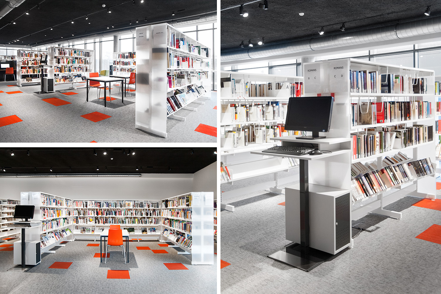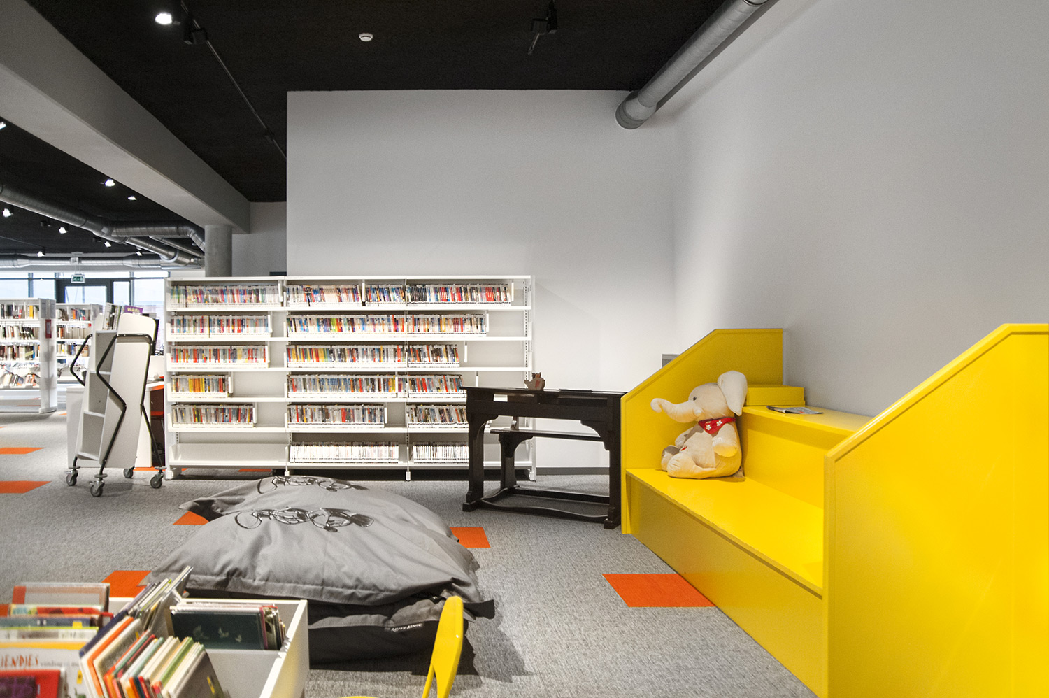 Les rayonnages ergonomiques, la zone et les sièges pour enfants ainsi que les espaces de lecture et de travail ont fait l’objet d’une attention toute particulière. Le plafond noir contraste avec l’ameublement blanc qui, grâce à sa physionomie peu élevée et rectiligne, module confortablement l’espace.