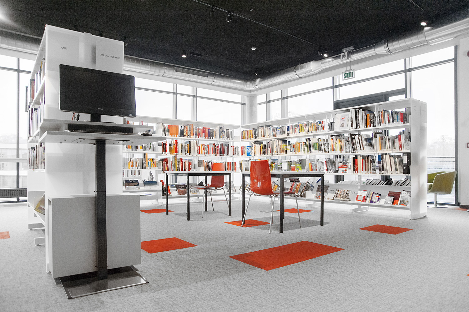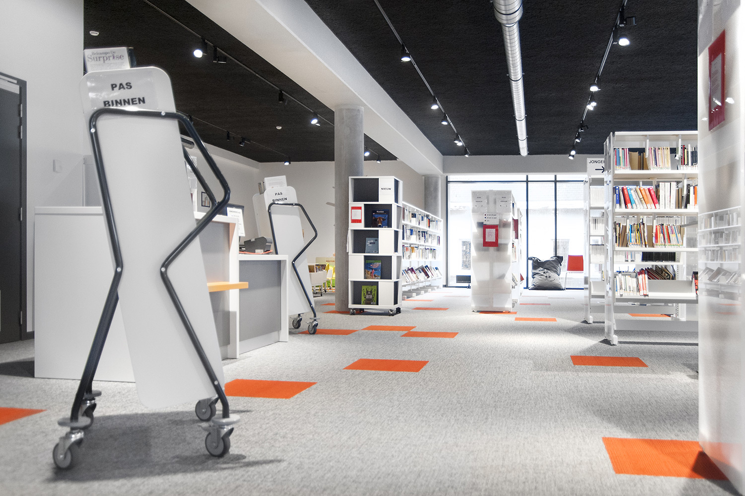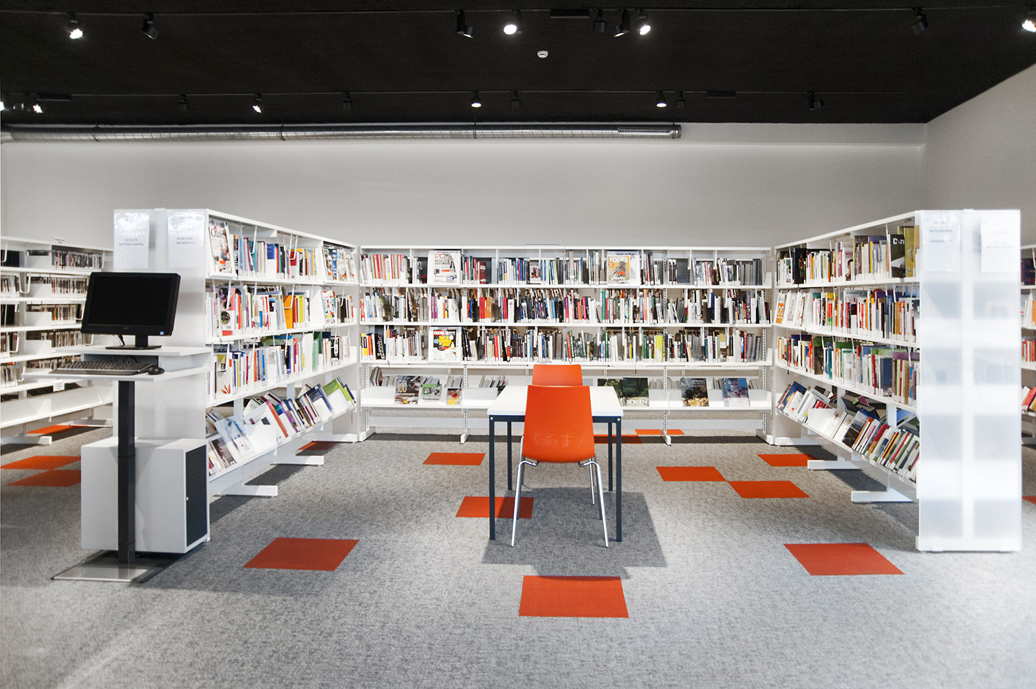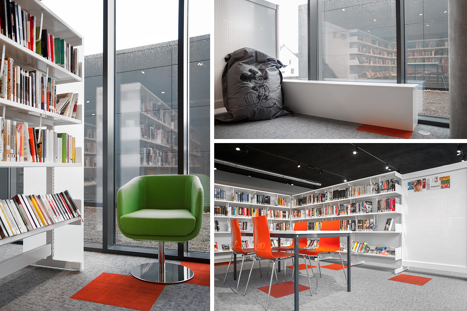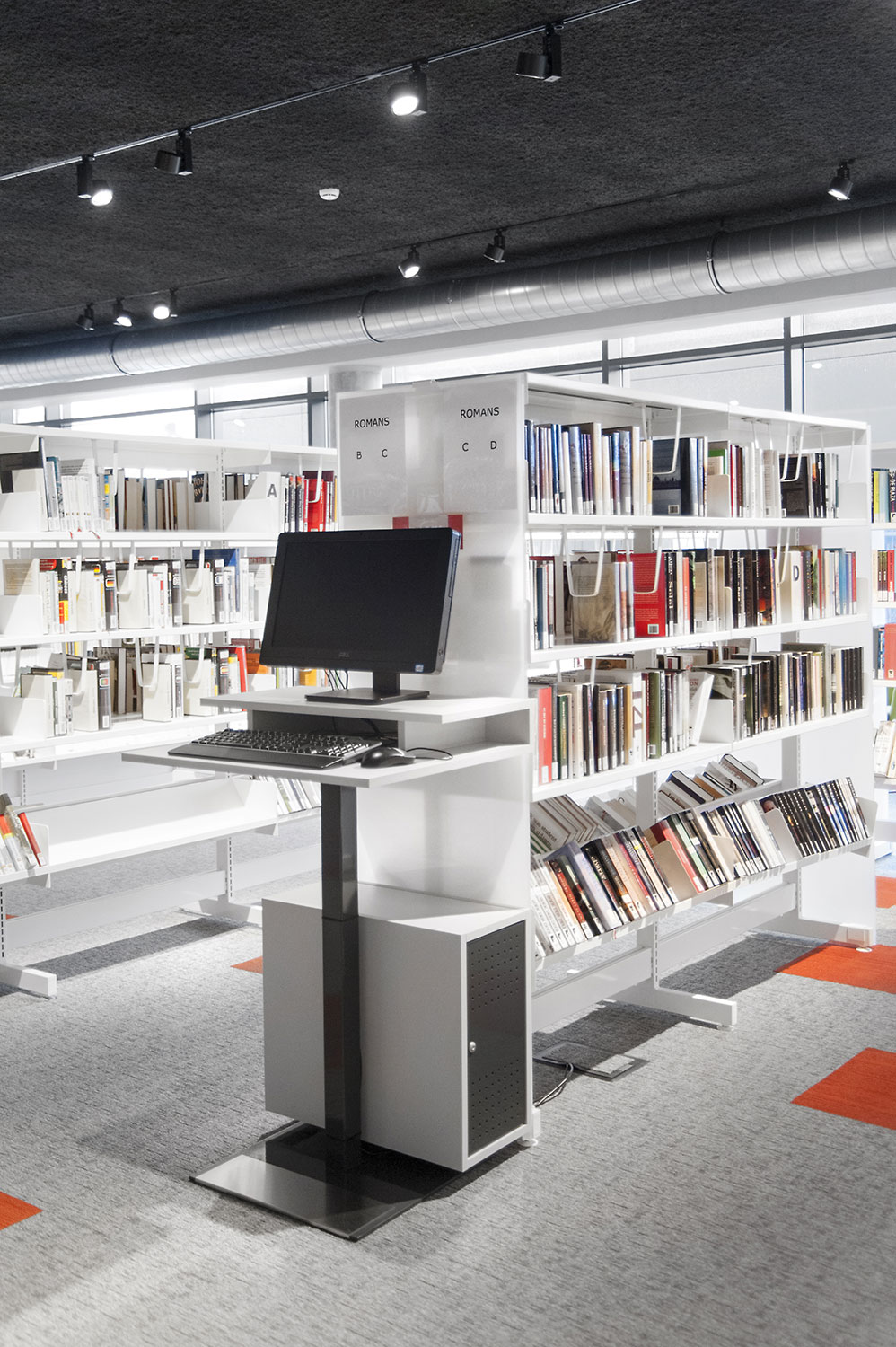 Les rayonnages ergonomiques, la zone et les sièges pour enfants ainsi que les espaces de lecture et de travail ont fait l’objet d’une attention toute particulière. Le plafond noir contraste avec l’ameublement blanc qui, grâce à sa physionomie peu élevée et rectiligne, module confortablement l’espace.