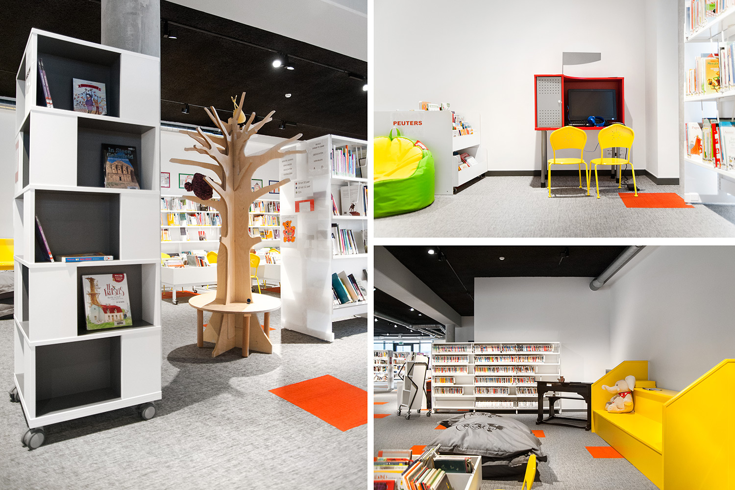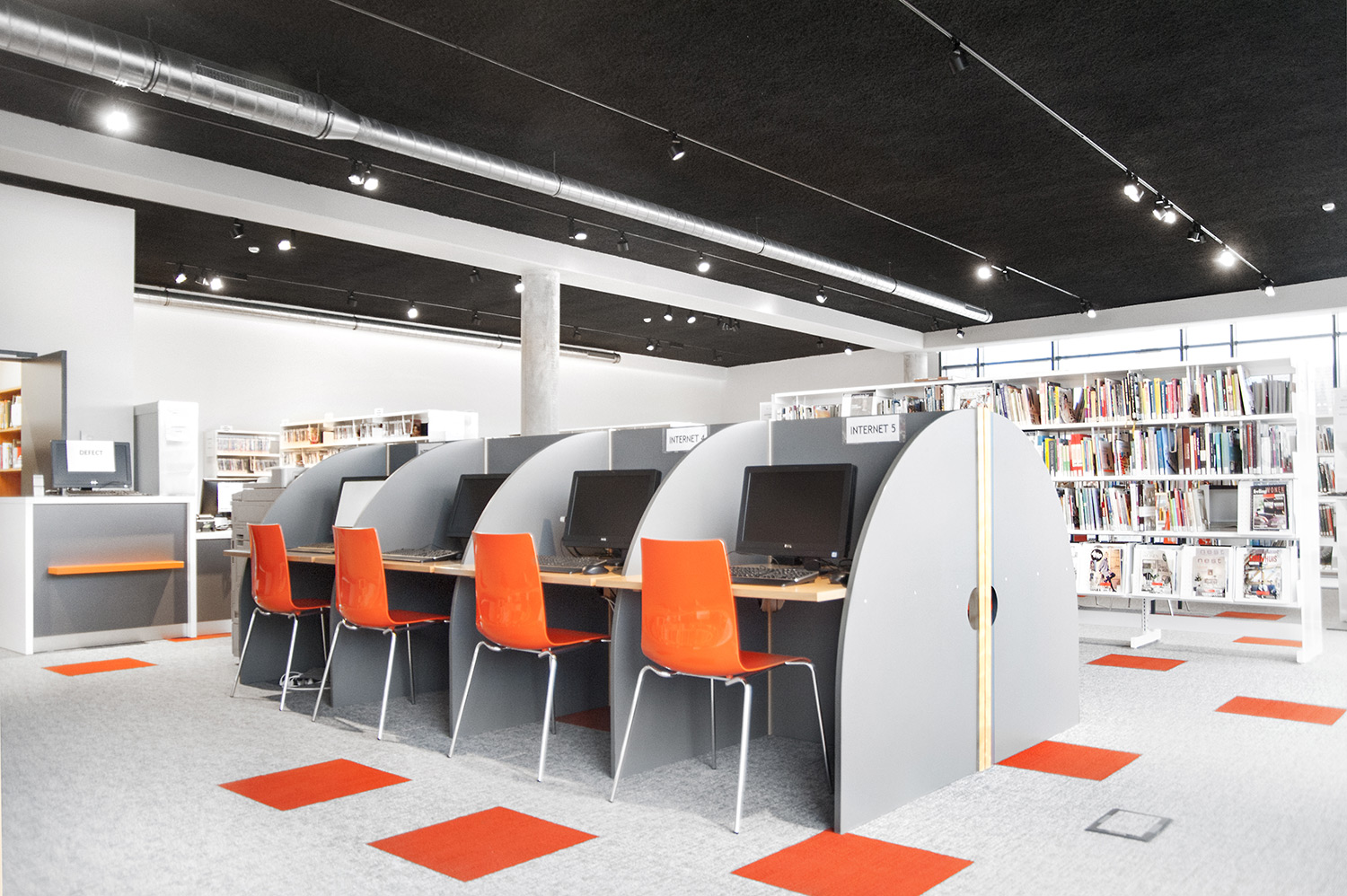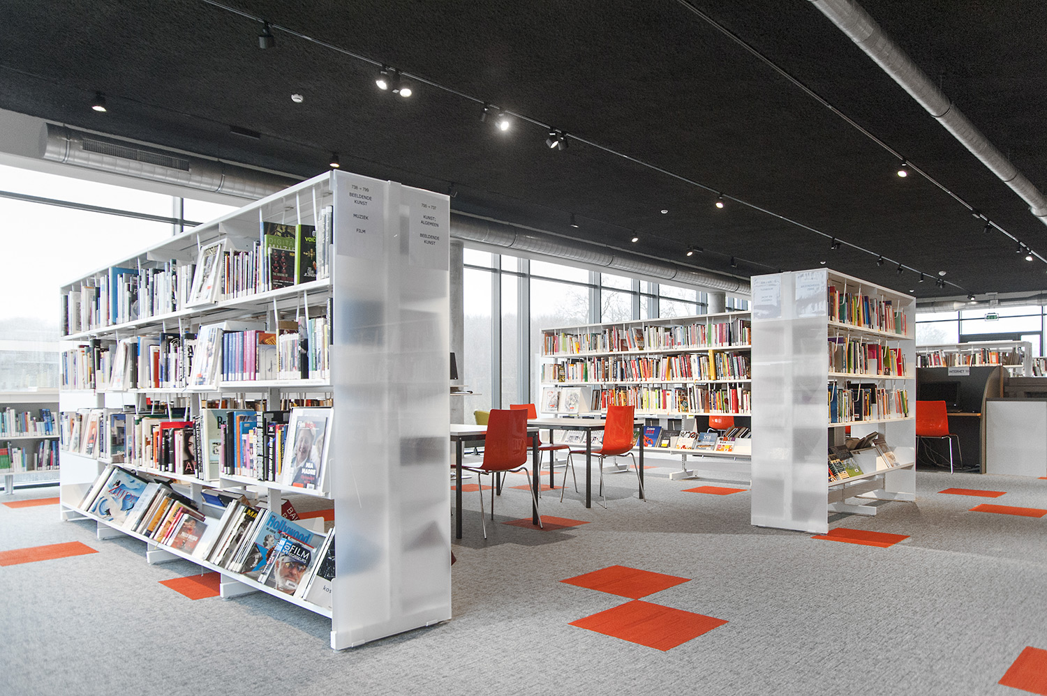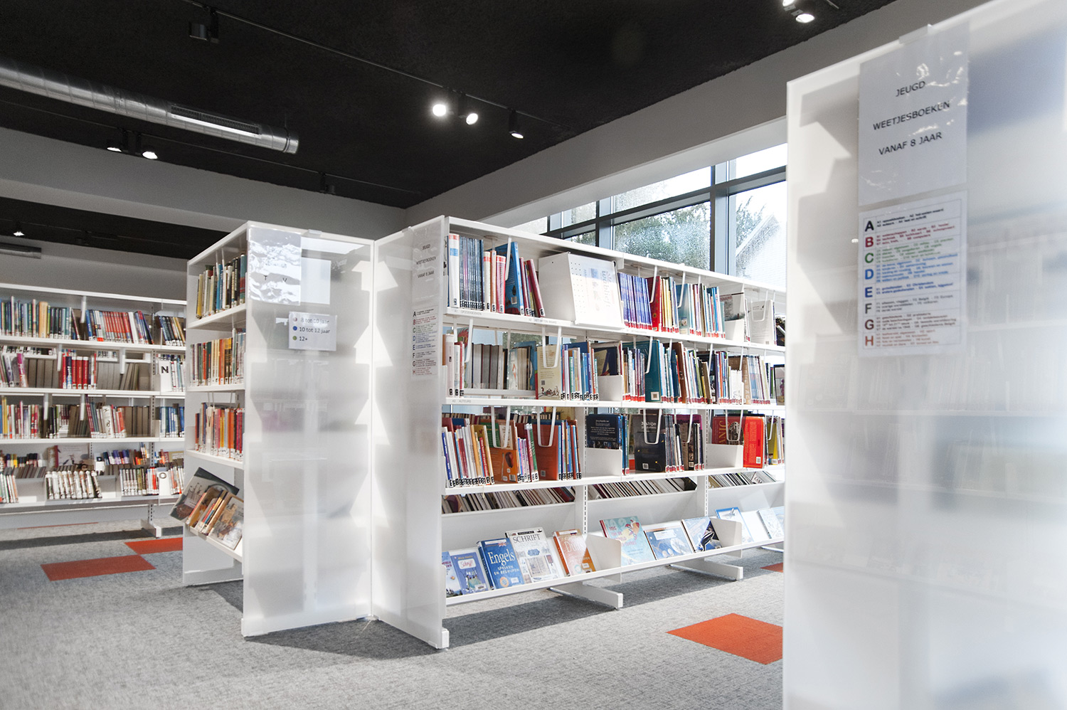 Les rayonnages ergonomiques, la zone et les sièges pour enfants ainsi que les espaces de lecture et de travail ont fait l’objet d’une attention toute particulière. Le plafond noir contraste avec l’ameublement blanc qui, grâce à sa physionomie peu élevée et rectiligne, module confortablement l’espace.