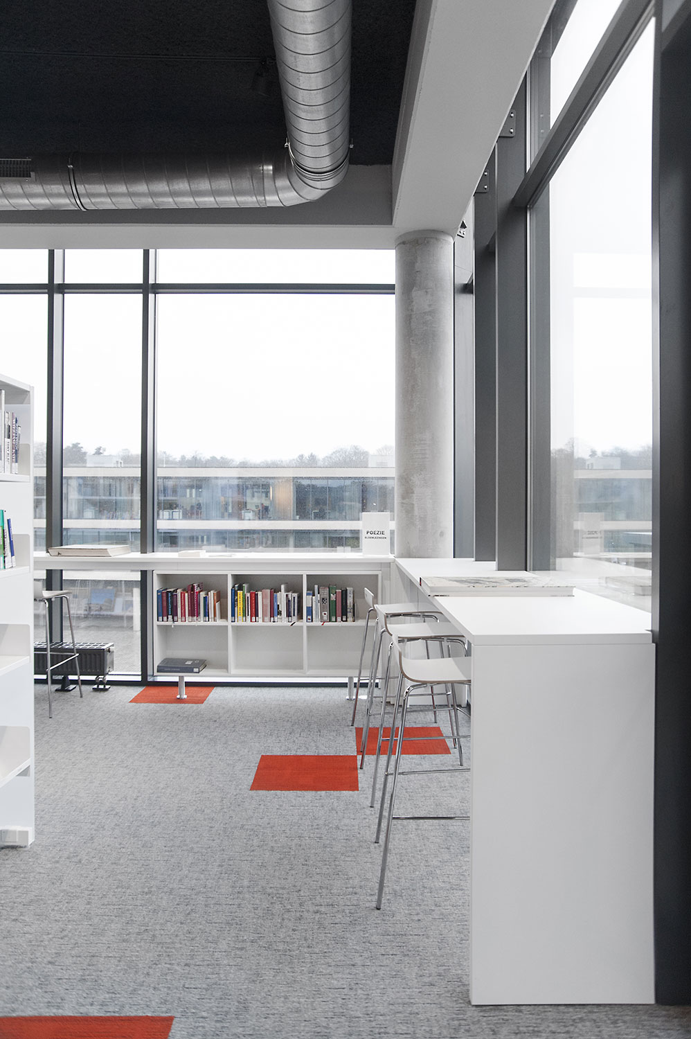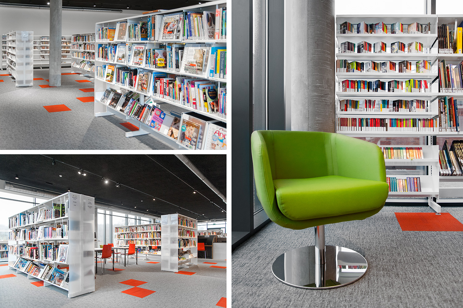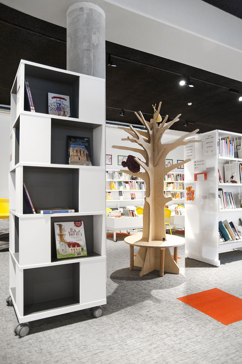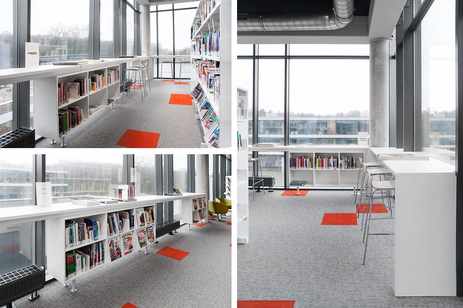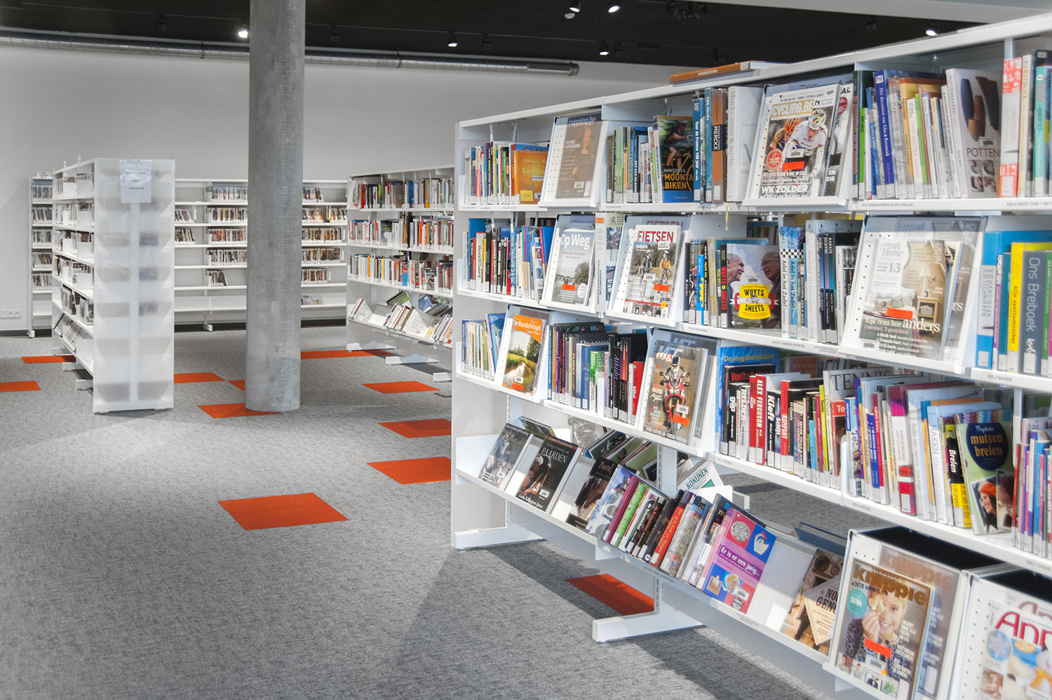 Les rayonnages ergonomiques, la zone et les sièges pour enfants ainsi que les espaces de lecture et de travail ont fait l’objet d’une attention toute particulière. Le plafond noir contraste avec l’ameublement blanc qui, grâce à sa physionomie peu élevée et rectiligne, module confortablement l’espace.