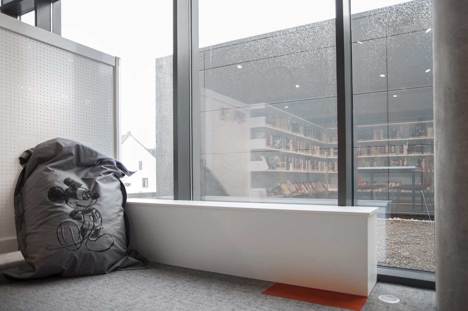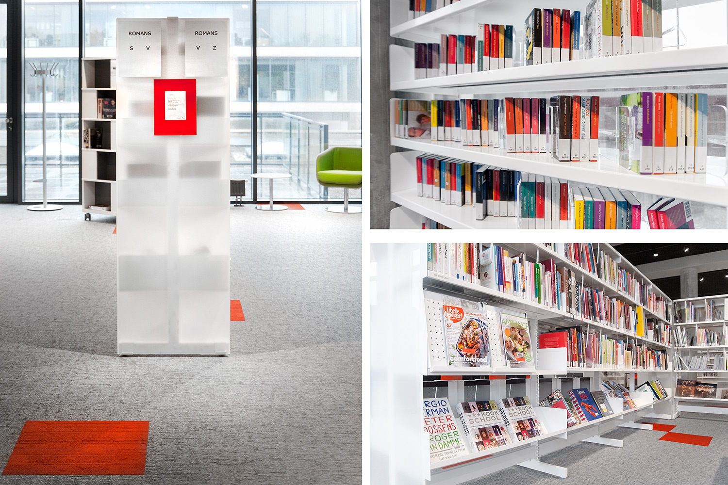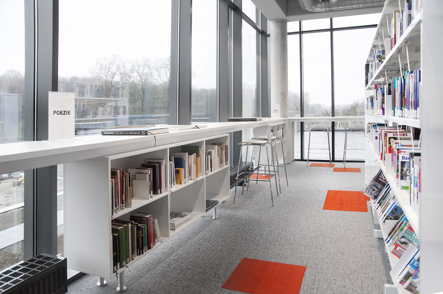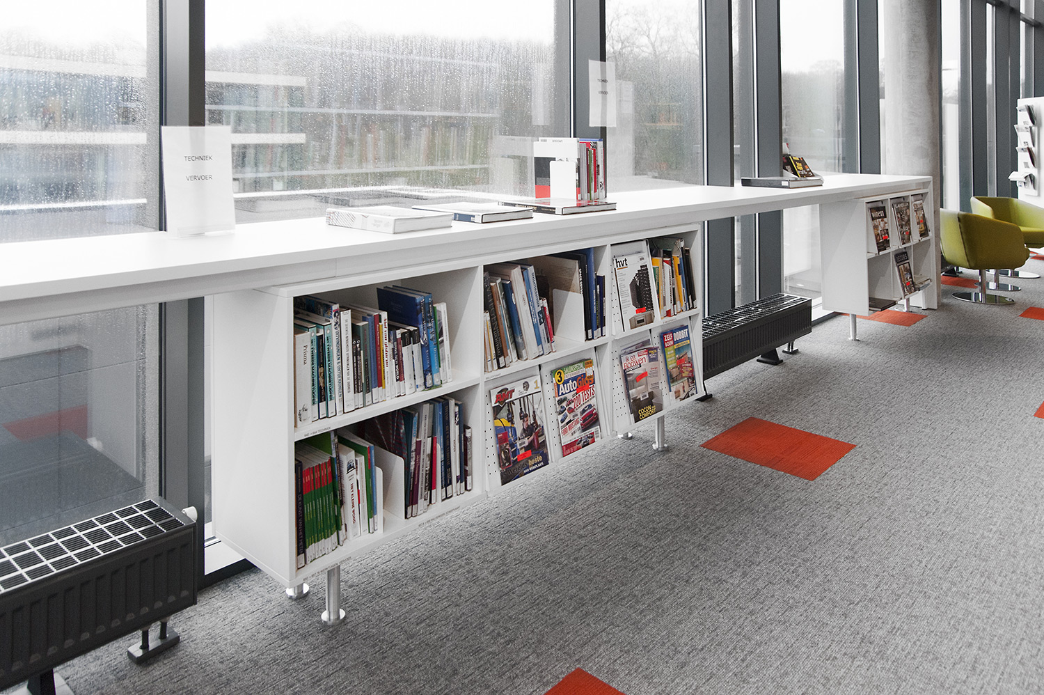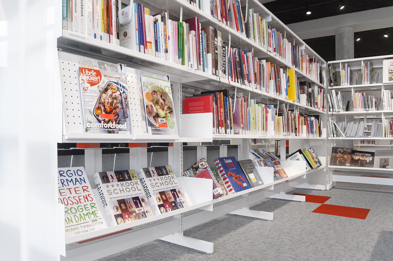 Les rayonnages ergonomiques, la zone et les sièges pour enfants ainsi que les espaces de lecture et de travail ont fait l’objet d’une attention toute particulière. Le plafond noir contraste avec l’ameublement blanc qui, grâce à sa physionomie peu élevée et rectiligne, module confortablement l’espace.