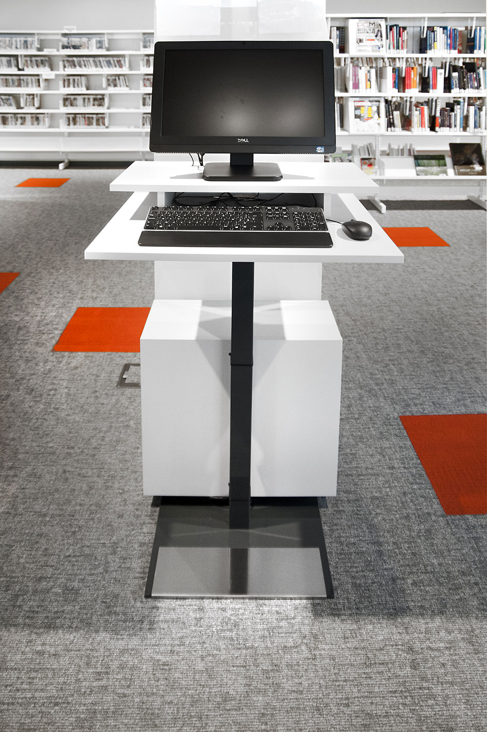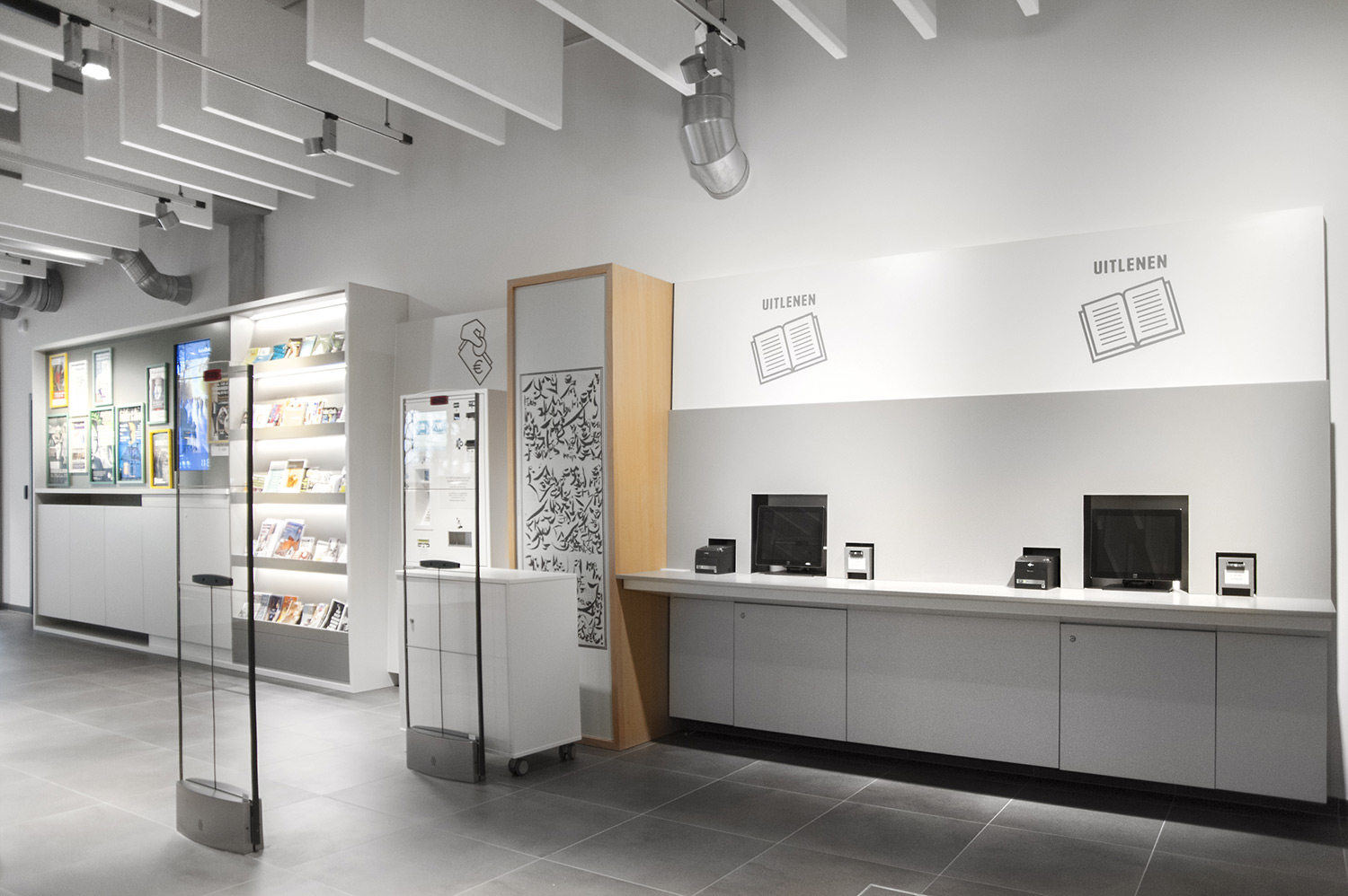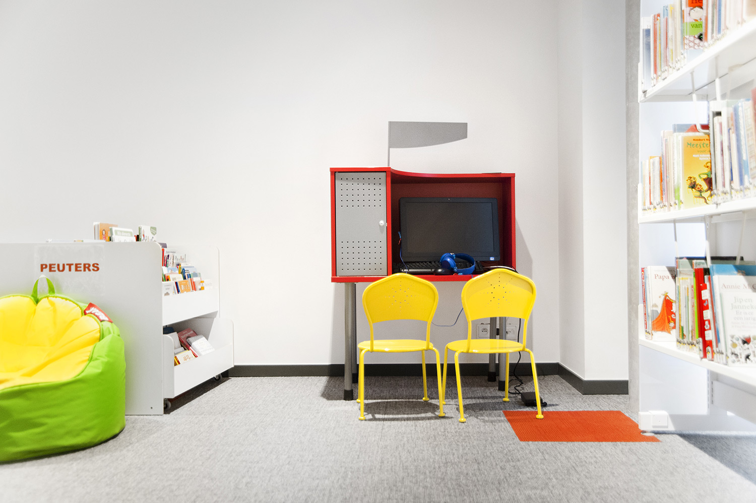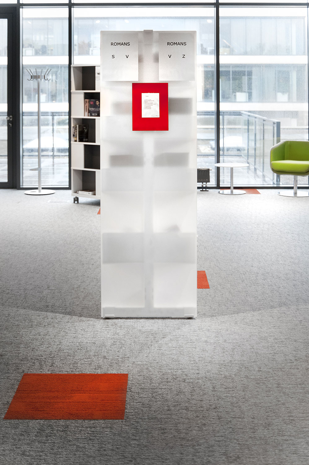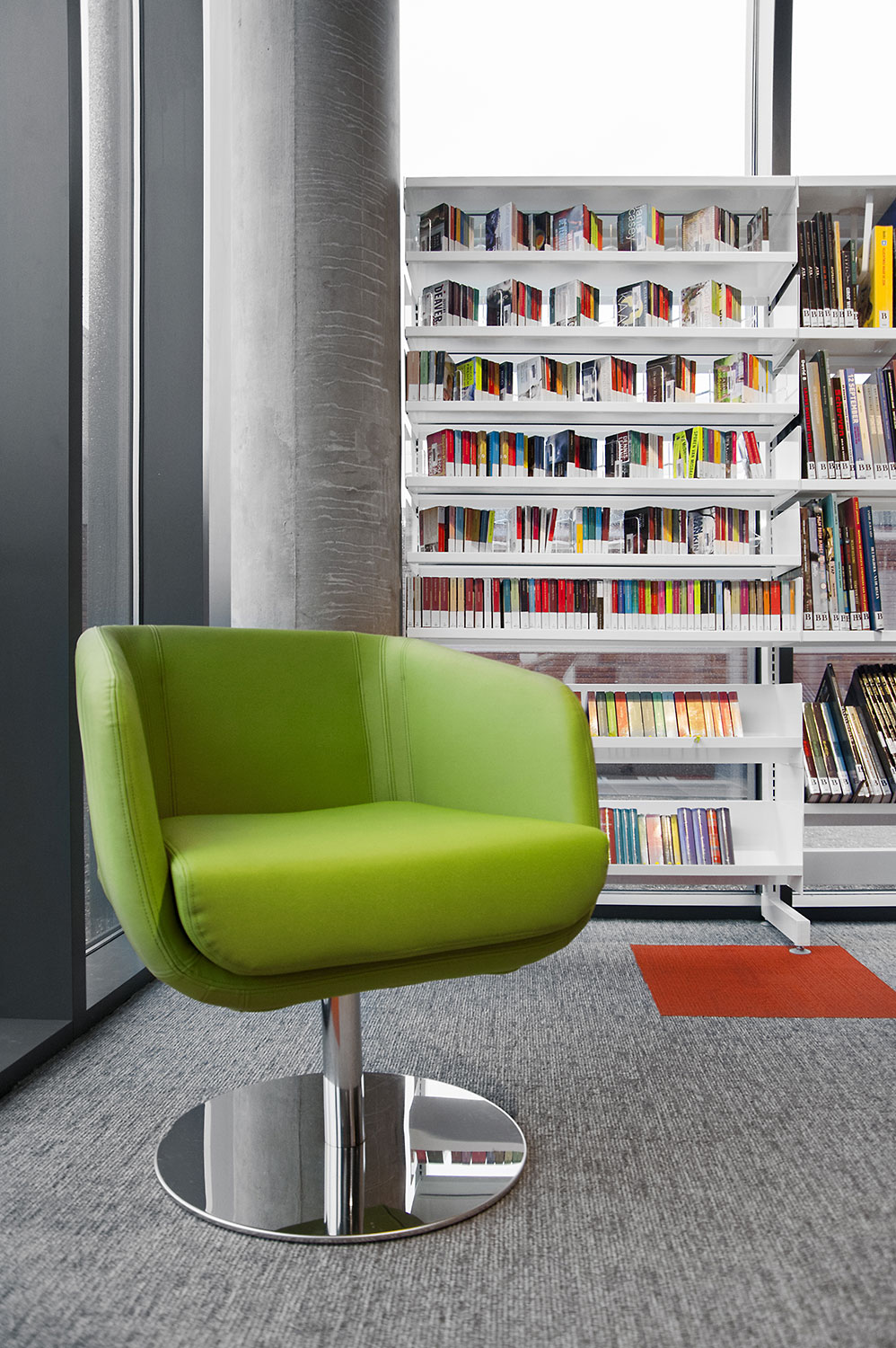 Les rayonnages ergonomiques, la zone et les sièges pour enfants ainsi que les espaces de lecture et de travail ont fait l’objet d’une attention toute particulière. Le plafond noir contraste avec l’ameublement blanc qui, grâce à sa physionomie peu élevée et rectiligne, module confortablement l’espace.