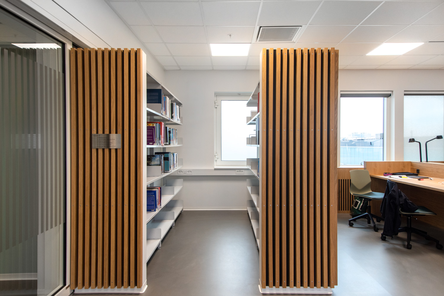 La chaleur du bois contraste avec le verre et le béton du bâtiment. Au fil des ans, le bois se patinera, ce qui donnera une apparence " authentique " et singulière. Nous avons également fourni les systèmes d'étagères courbes ainsi que les grandes tables de travail en chêne où les étudiants peuvent s'asseoir, soit en groupe, soit individuellement. Tout le câblage a été soigneusement dissimulé dans la structure des tables. Les séparations entre les tables créent des espaces de calme et de concentration. Les étudiants travaillent dans un environnement agréable et confortable où les matériaux chaleureux et la lumière naturelle produisent un très bel effet.