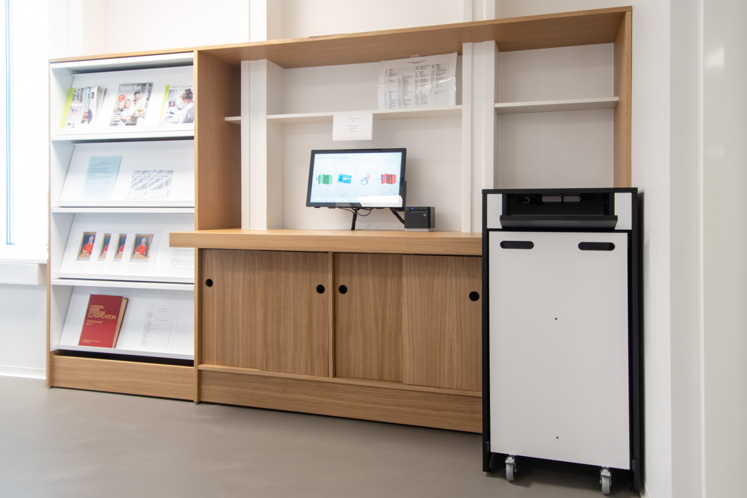 Avec notre fidèle partenaire Bygholm Inventar & Møbelsnedkeri, nous avons imaginé et fabriqué un mobilier spécial en chêne qui donne à la bibliothèque l'aspect d'une belle unité enveloppante et chaleureuse et le sentiment d'être assis comme "en extérieur".