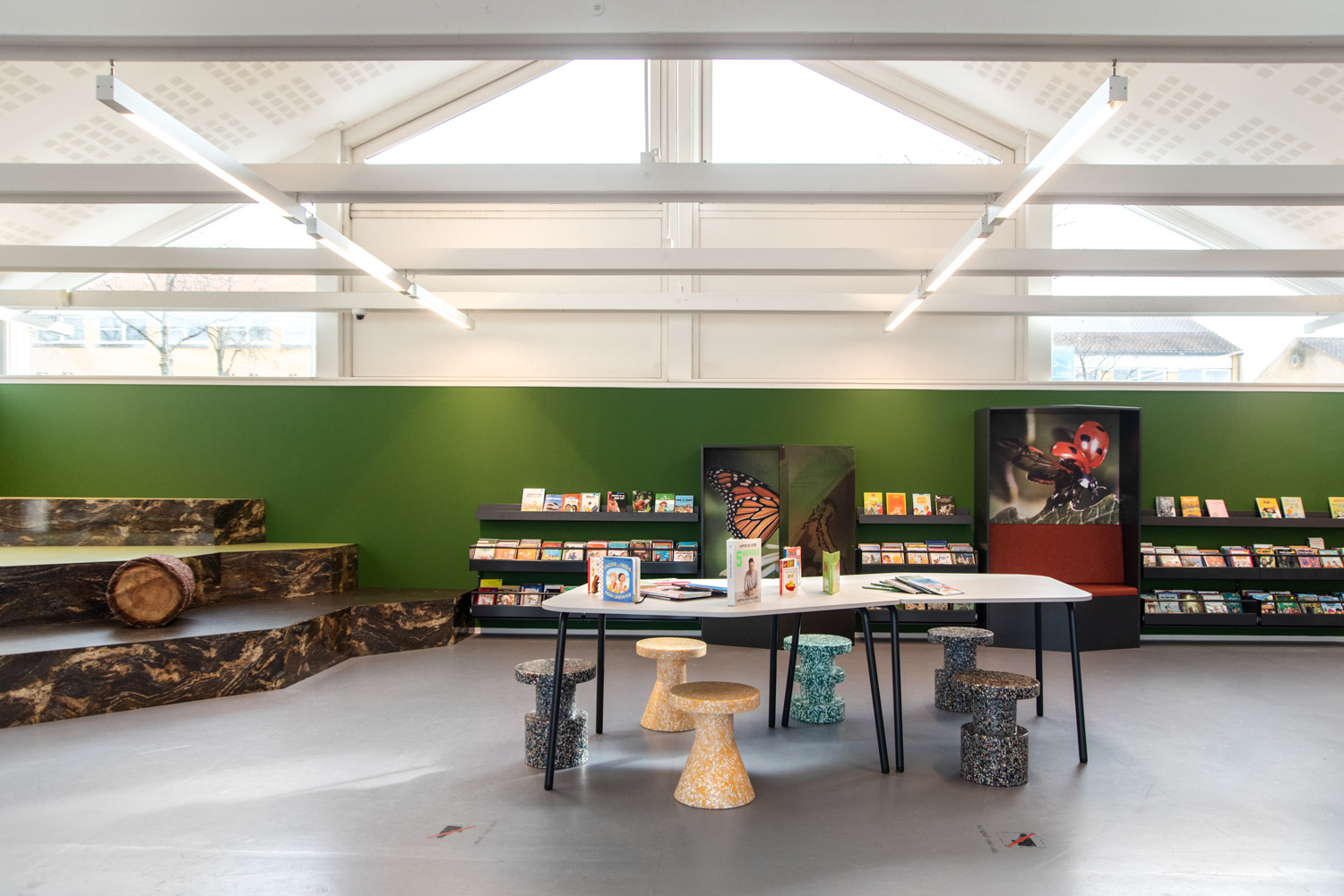 Les bacs à livres et les rayonnages existants ont été associés à des "niches" de lecture pentagonale, produites sur mesure, de manière à créer des univers organiques à l'intérieur de la salle. Un grand podium, joliment décoré pour l'heure du conte, est régulièrement investi par de petits ou grands groupes d'enfants. Tandis que les plus petits jouent sur le tapis sensoriel, d'autres profitent du calme dans le coin des assises souples et confortables.