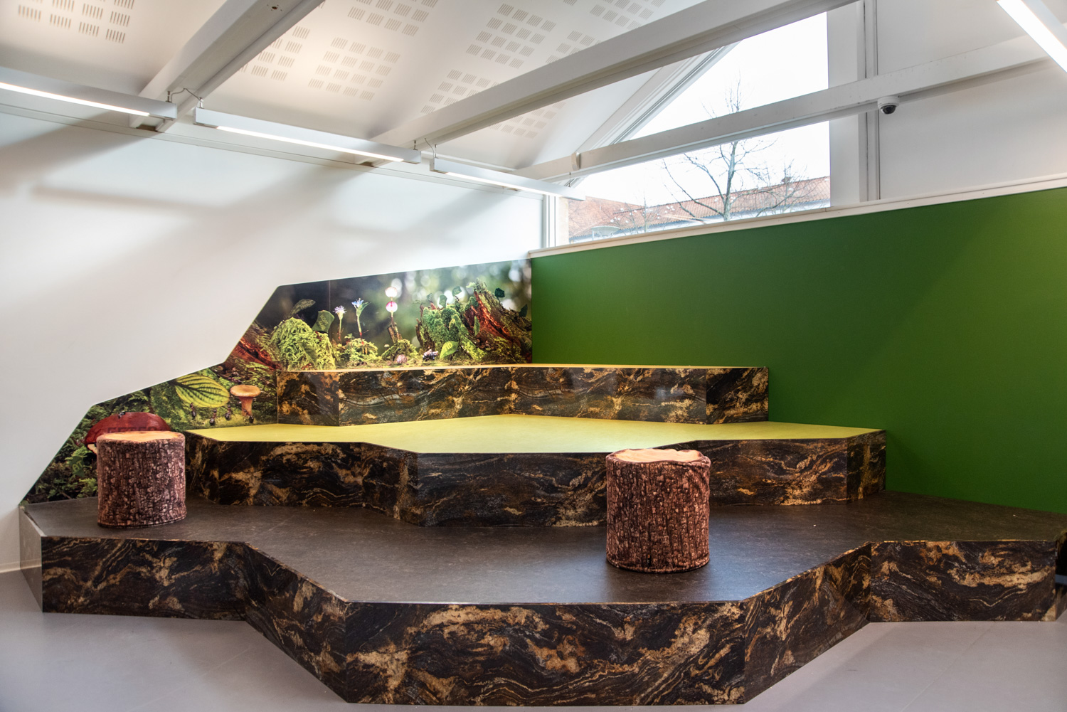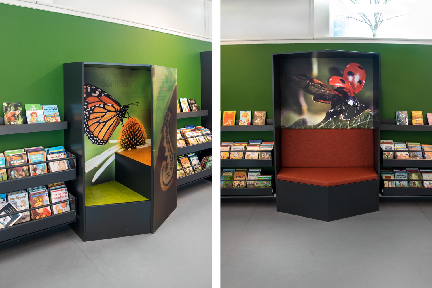 Au sein de la bibliothèque de Halsnæs, des illustrations étonnantes d'insectes et de scènes naturelles permettent aux enfants de profiter de la magie des lieux et d'en étudier les détails de très près. Vous trouverez aussi dans les décors graphiques des chansons enfantines bien connues et "les 120 mots" que les fourmis transportent avec elles. Ainsi, les éléments de la nature (conception biophilique) sont combinés au développement du langage, à l'intérêt pour la lecture, à l'immersion et à la perception.