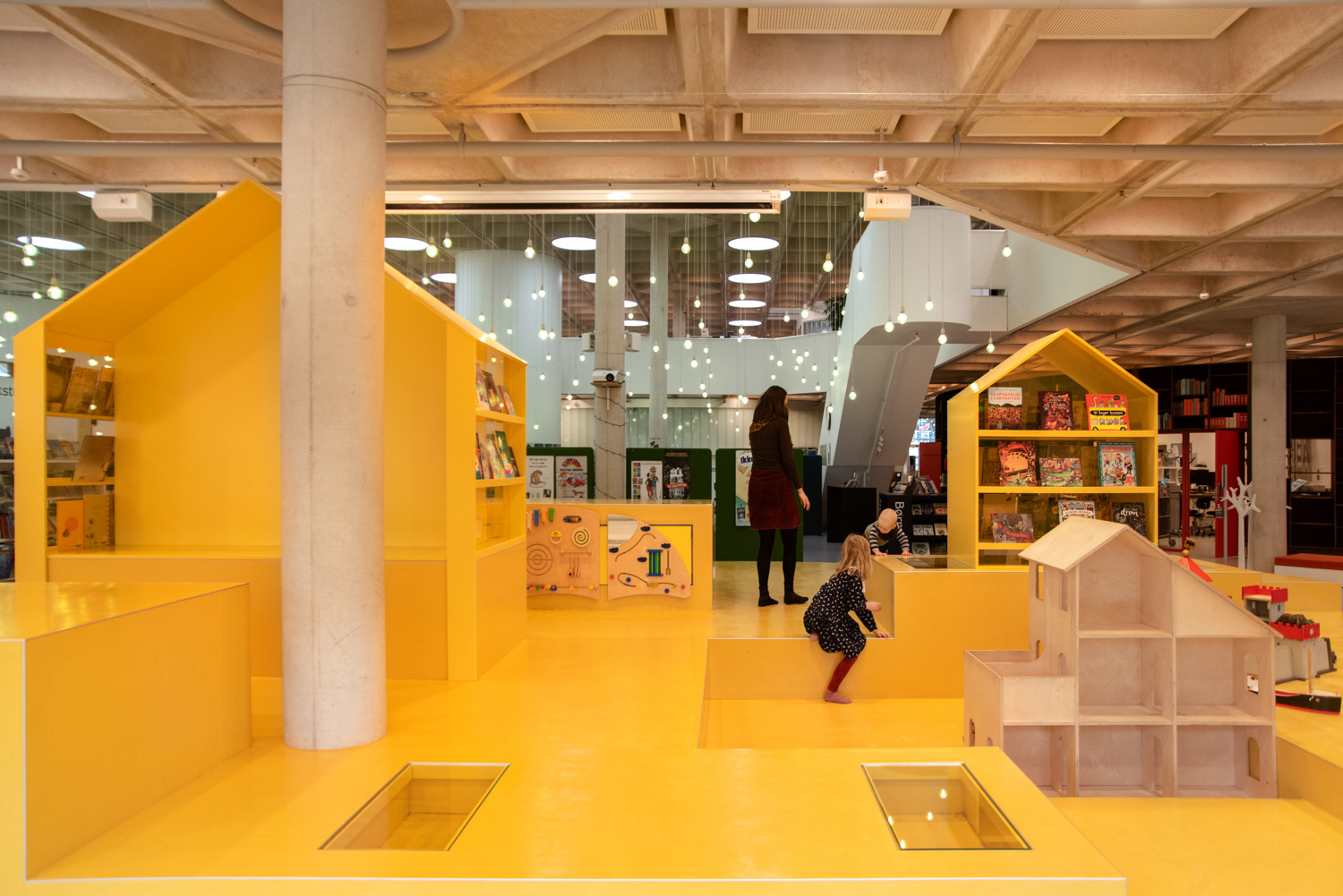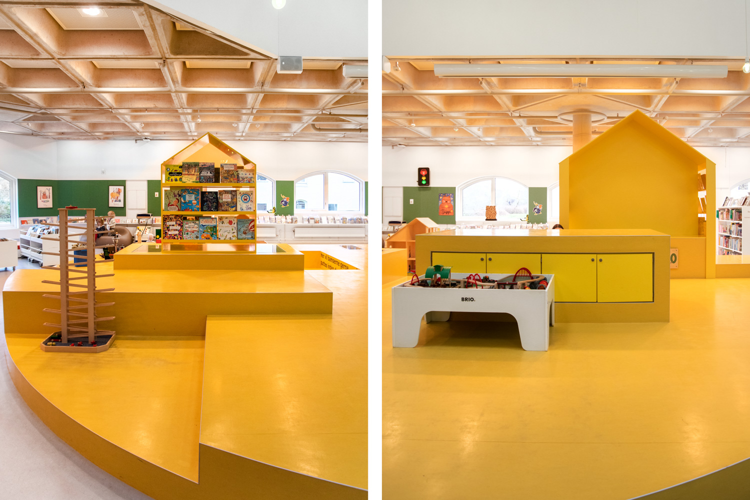 Deux grandes maisons ont été construites sur l’immense « fromage » jaune mêlant des niches de lecture, des rangements et un espace d’exposition. L’ancien espace pour l’heure du conte situé au milieu de la bibliothèque a été transformé en un océan bleu profond où un grand papier peint avec un décor spécialement conçu et un rideau d’algues marine donnent l’impression d’être sous la mer. Dans le même temps, les enfants peuvent chercher des hippocampes, des poissons ou bien jouer à trouver la jeune anémone.