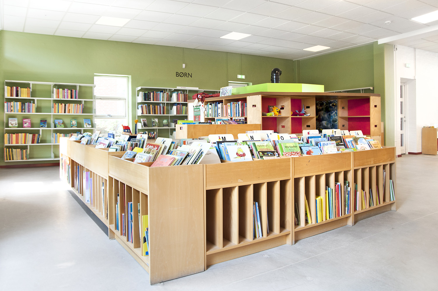 Dans la zone réservée aux enfants, les rayonnages en bois existants ont été disposés de sorte à former une grotte équipée d’un périscope grâce auquel les petits peuvent combiner exploration et amusement.