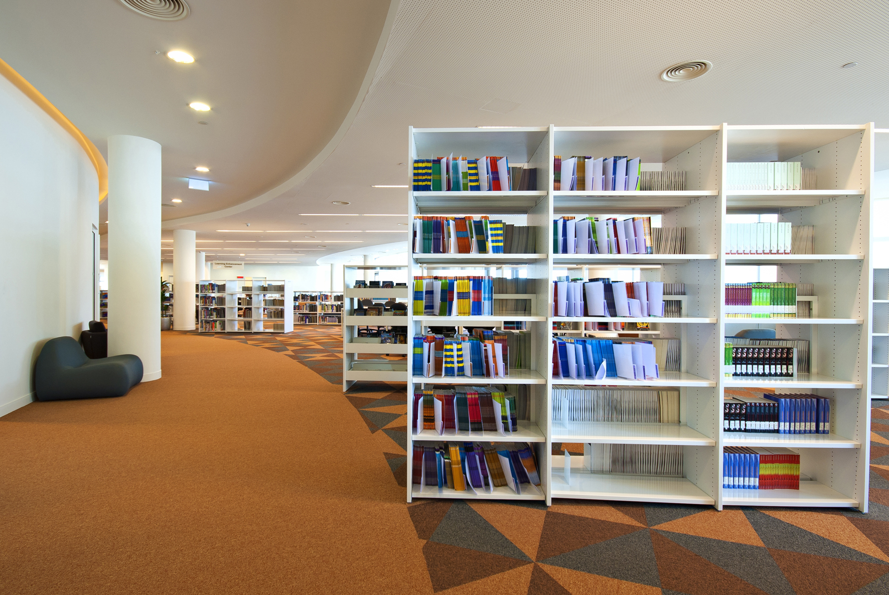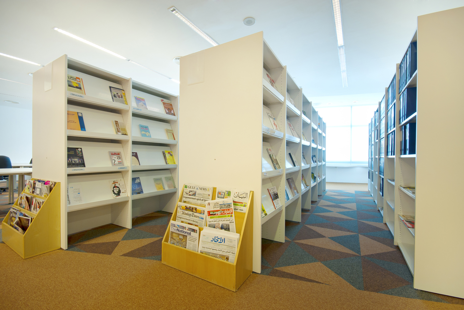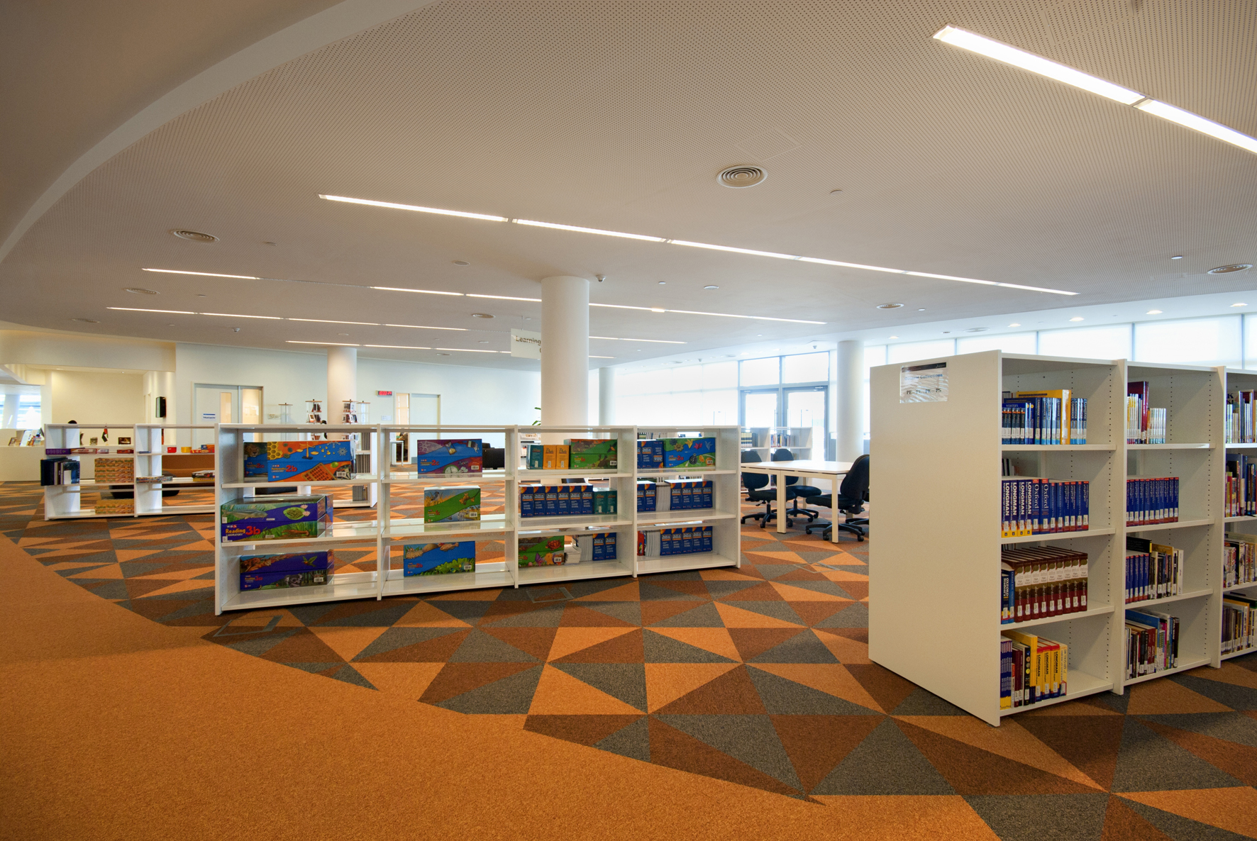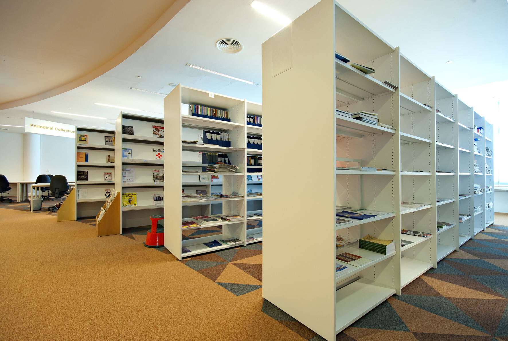 Le bâtiment de la bibliothèque comporte quatre étages et a été conçu comme un amphithéâtre, en s’inspirant du design de la bibliothèque du Congrès, aux États-Unis. L’entrée donne directement sur un vaste espace à la fois apaisant et lumineux, équipé de mobilier de bibliothèque Slimline de BCI dans une teinte blanche épurée. Une oasis de 18 000 m² dédiée entièrement à la connaissance et à l’information.