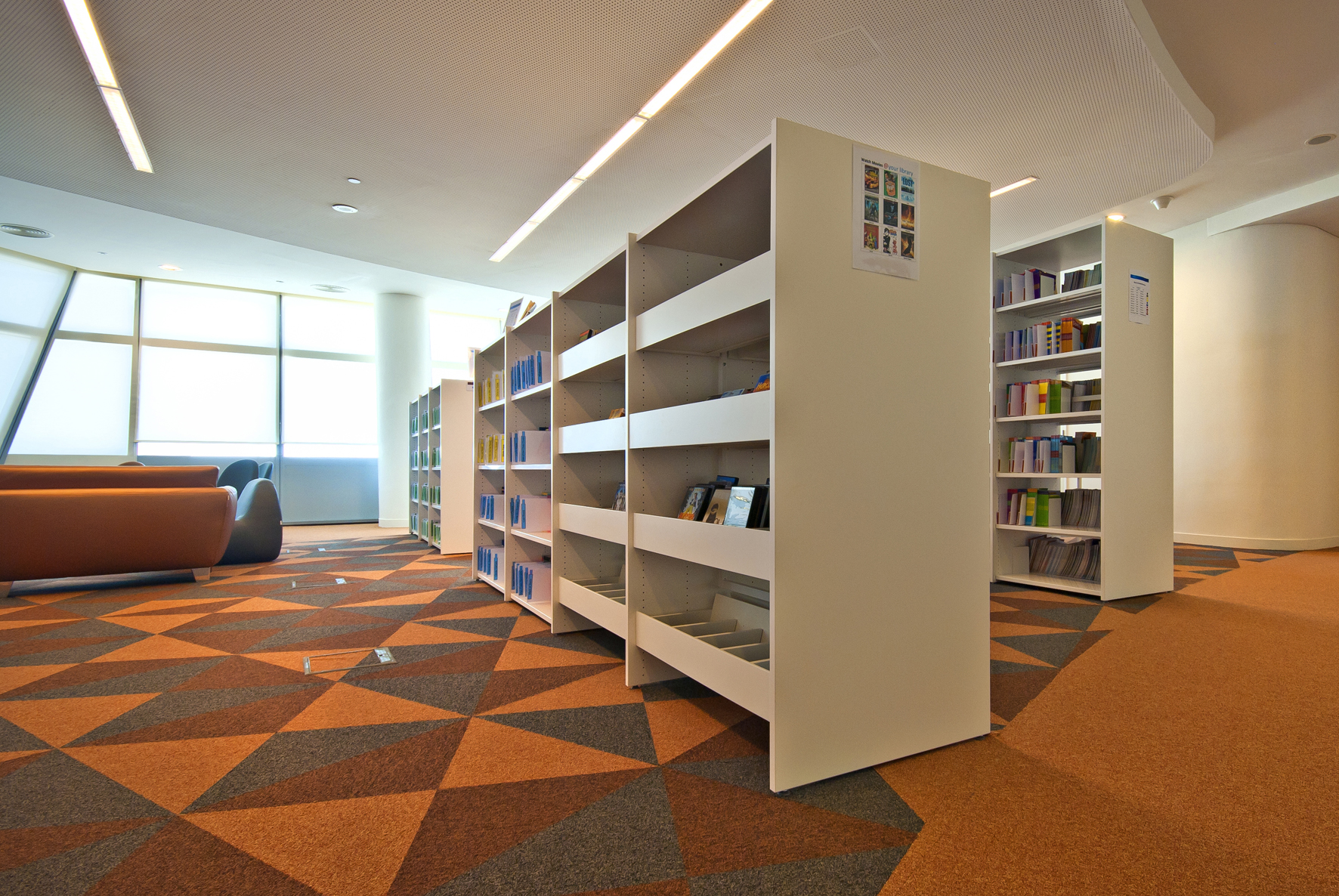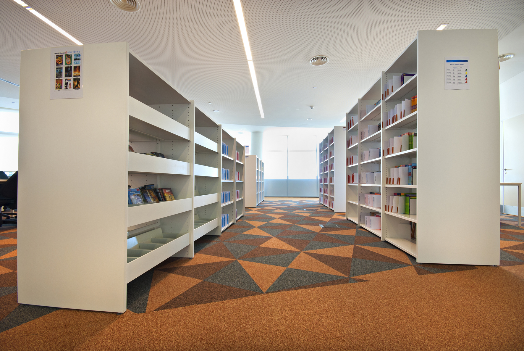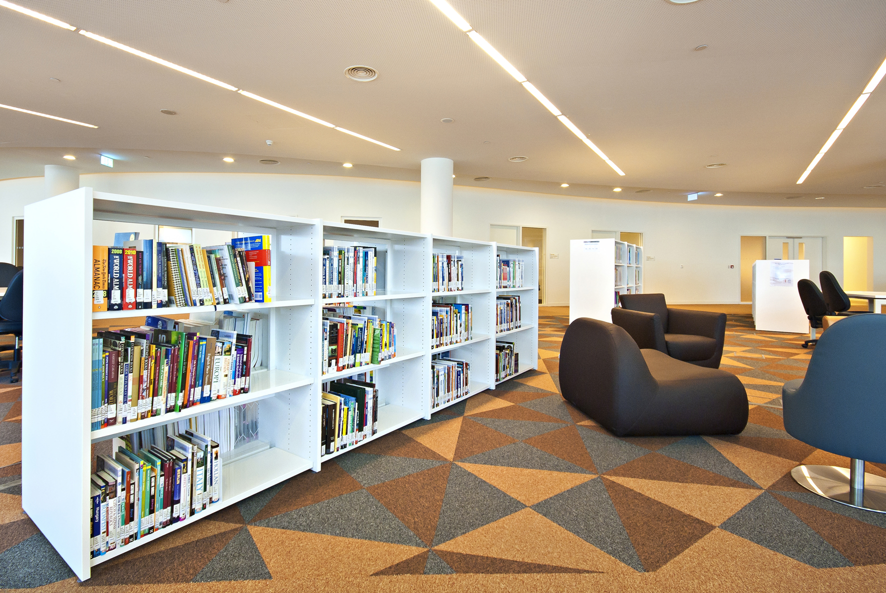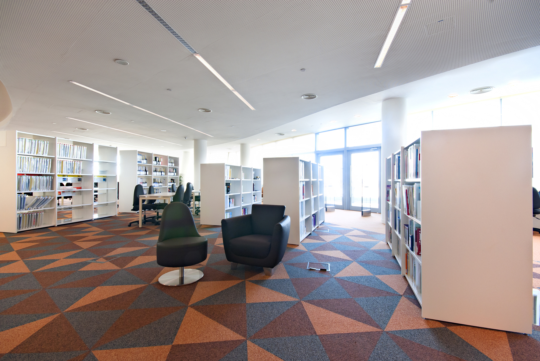 Le bâtiment de la bibliothèque comporte quatre étages et a été conçu comme un amphithéâtre, en s’inspirant du design de la bibliothèque du Congrès, aux États-Unis. L’entrée donne directement sur un vaste espace à la fois apaisant et lumineux, équipé de mobilier de bibliothèque Slimline de BCI dans une teinte blanche épurée. Une oasis de 18 000 m² dédiée entièrement à la connaissance et à l’information.
