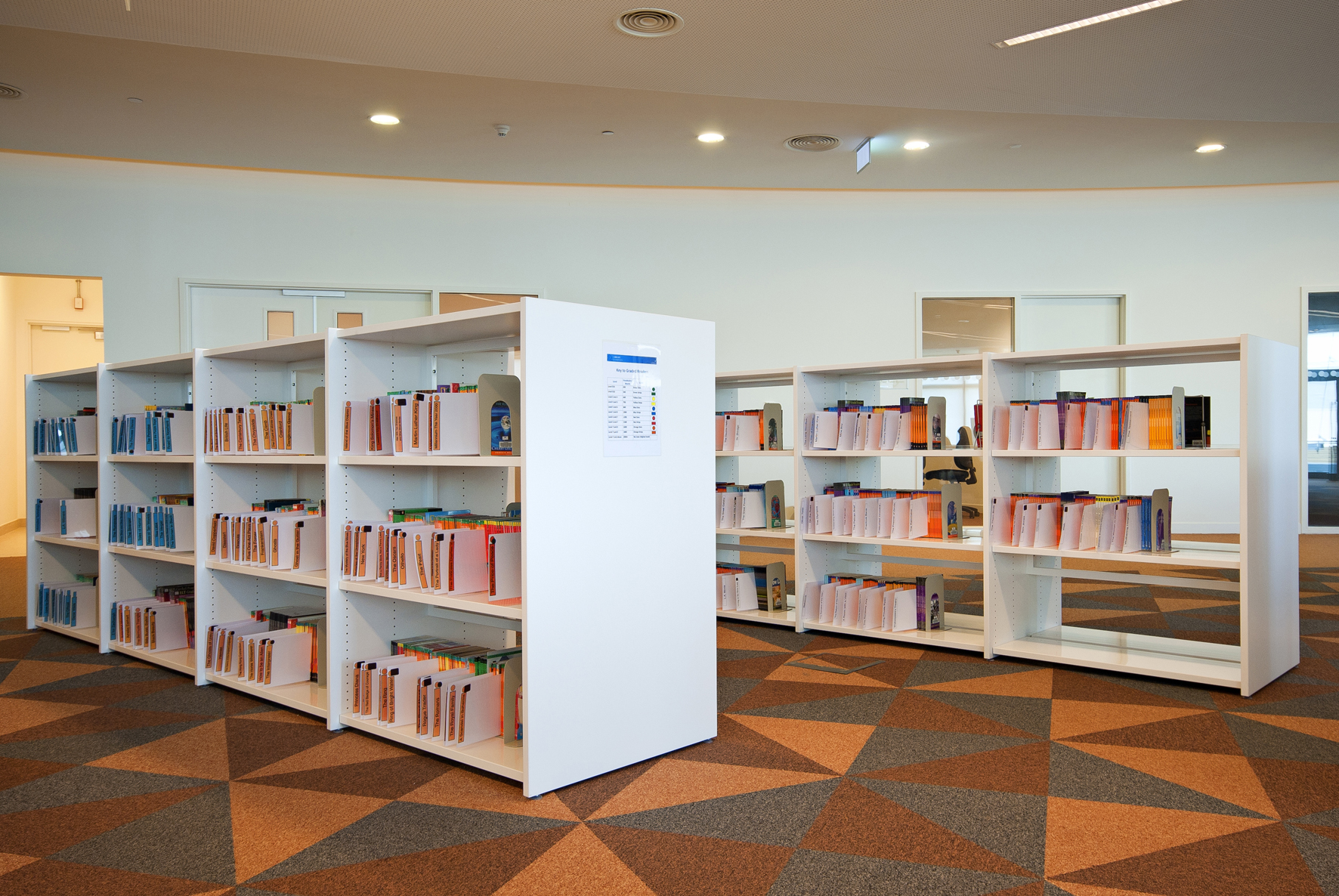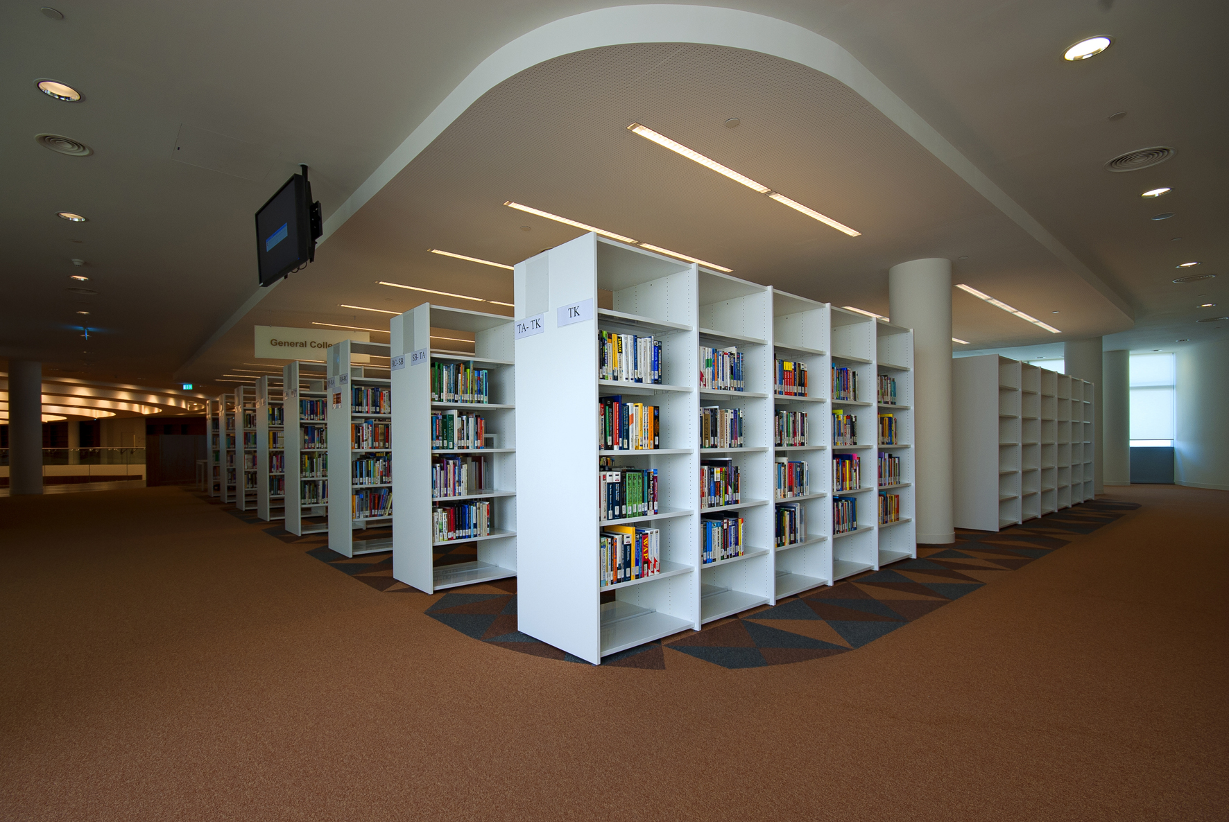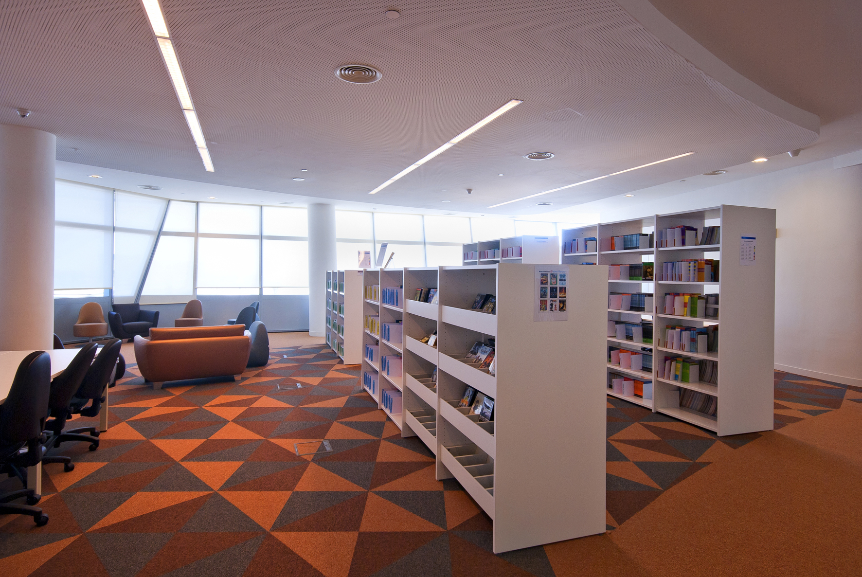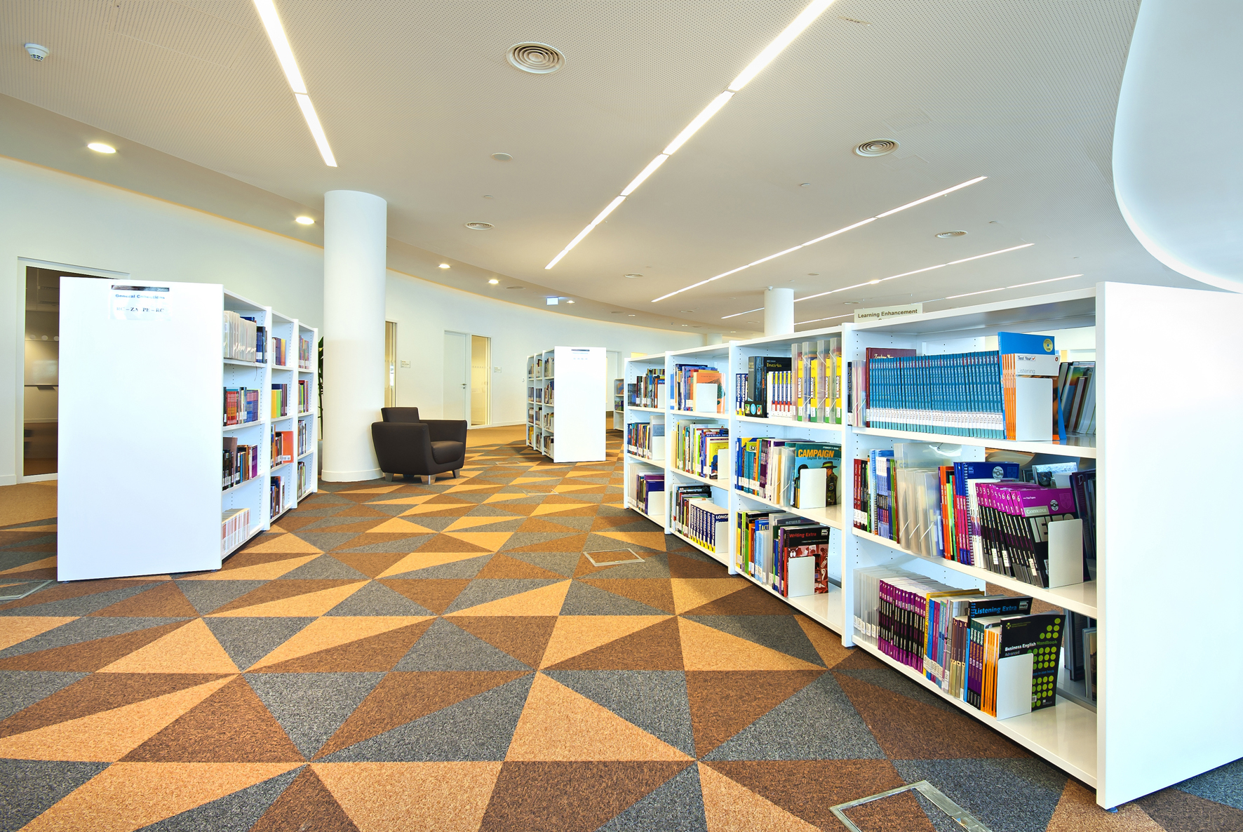 Le bâtiment de la bibliothèque comporte quatre étages et a été conçu comme un amphithéâtre, en s’inspirant du design de la bibliothèque du Congrès, aux États-Unis. L’entrée donne directement sur un vaste espace à la fois apaisant et lumineux, équipé de mobilier de bibliothèque Slimline de BCI dans une teinte blanche épurée. Une oasis de 18 000 m² dédiée entièrement à la connaissance et à l’information.