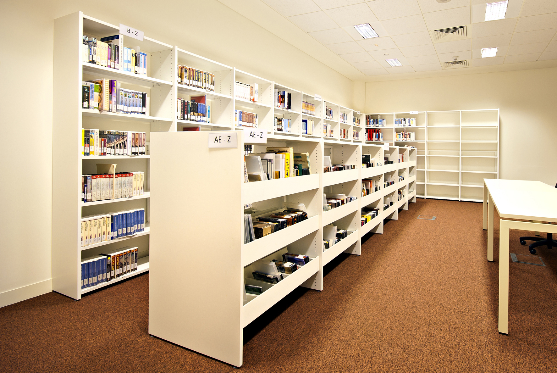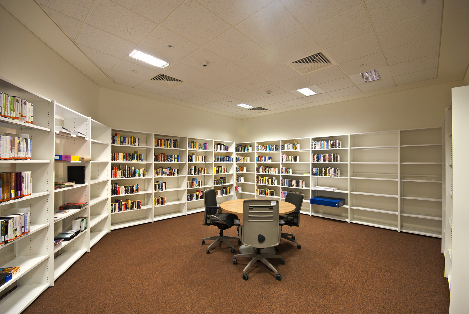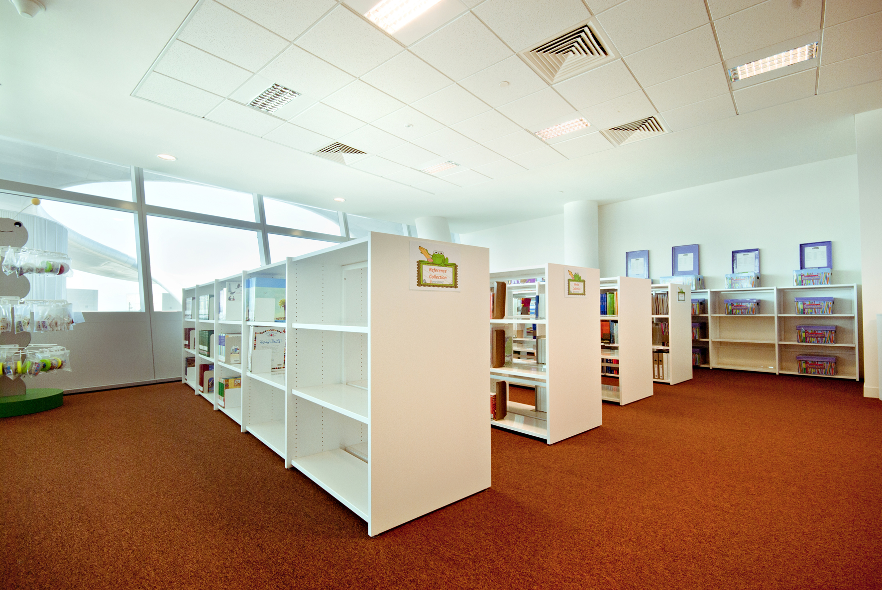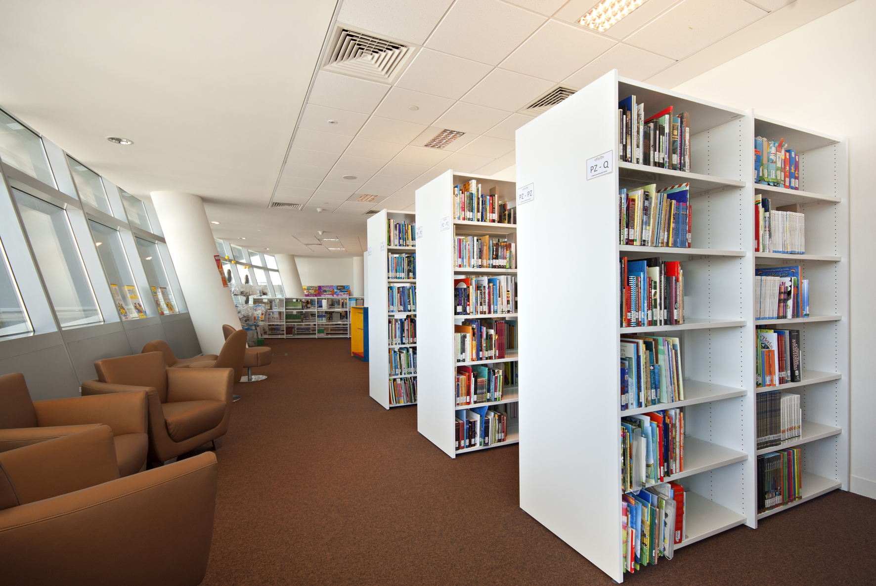 Le bâtiment de la bibliothèque comporte quatre étages et a été conçu comme un amphithéâtre, en s’inspirant du design de la bibliothèque du Congrès, aux États-Unis. L’entrée donne directement sur un vaste espace à la fois apaisant et lumineux, équipé de mobilier de bibliothèque Slimline de BCI dans une teinte blanche épurée. Une oasis de 18 000 m² dédiée entièrement à la connaissance et à l’information.