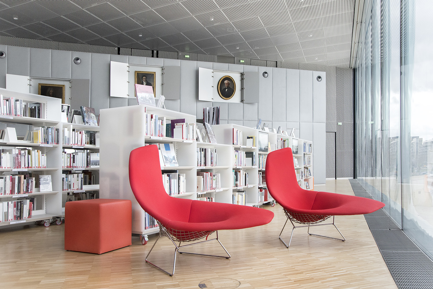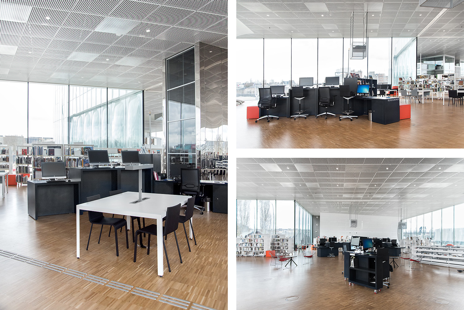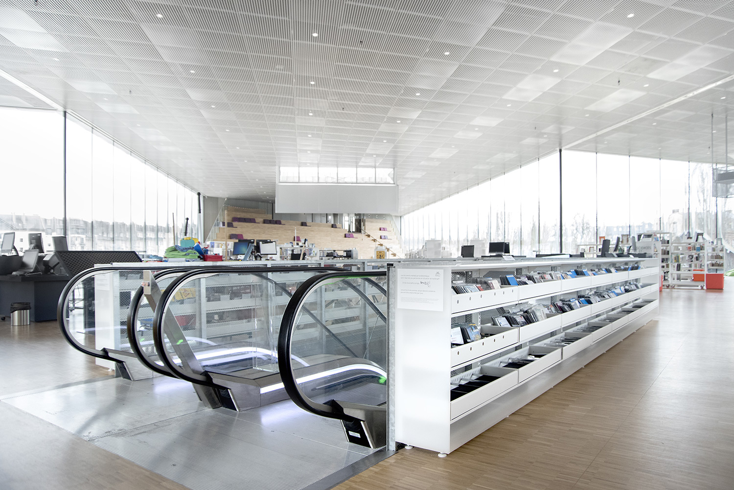 Un grand nombre de places de travail et de lecture accompagne les plus de 120.000 documents. L’organisation de ces documents a la particularité d’intégrer les supports papier et digitaux côte à côte sur les étagères, ce qui a demandé le développement de nouveaux supports par BCI. C’est une des nombreuses particularités de cette Bibliothèque, très axée sur l’intégration de tout support média.