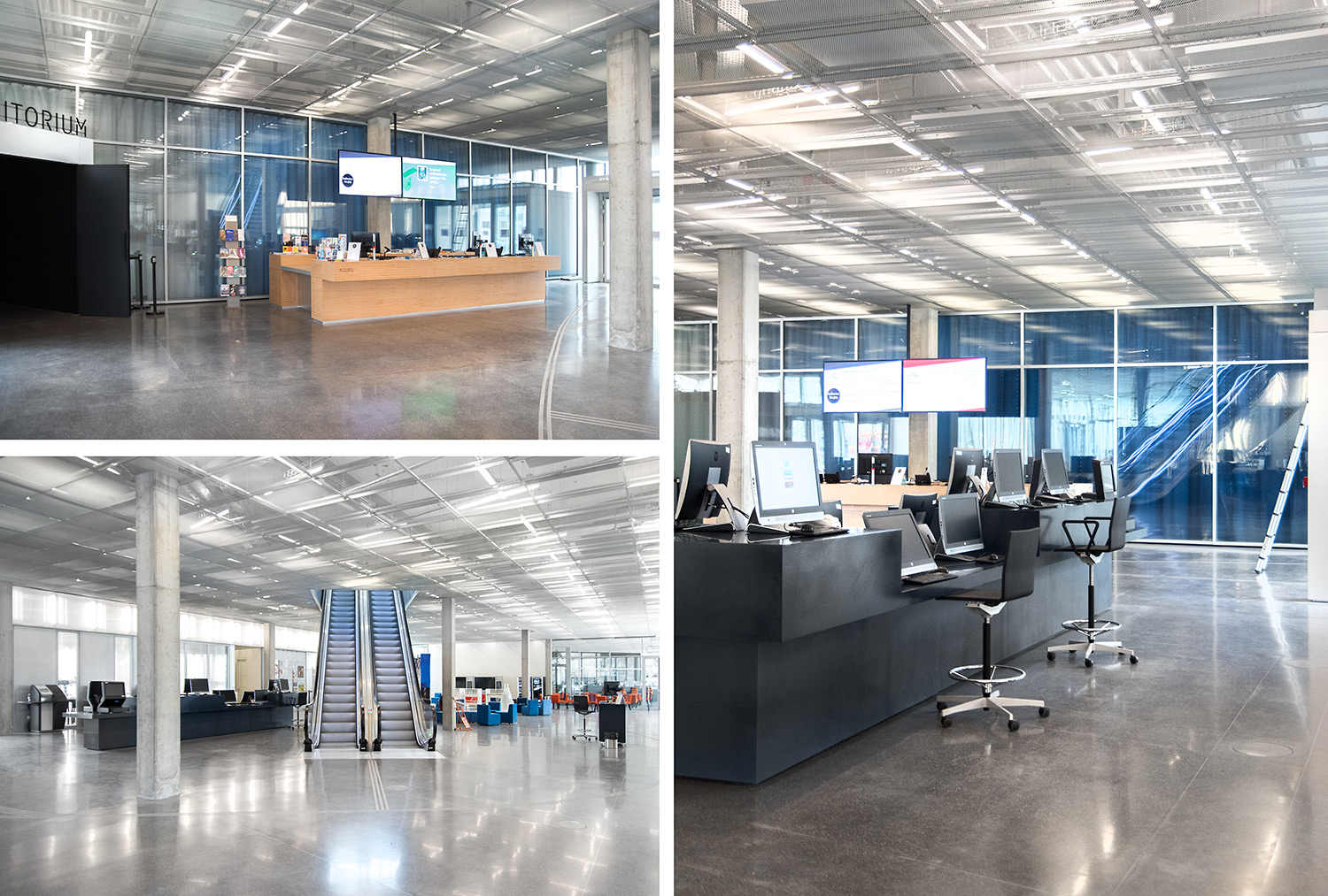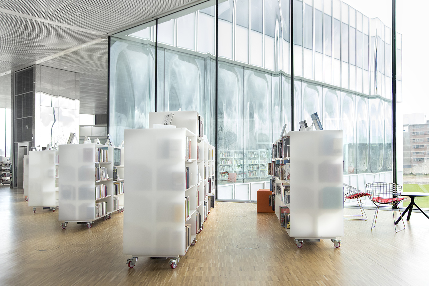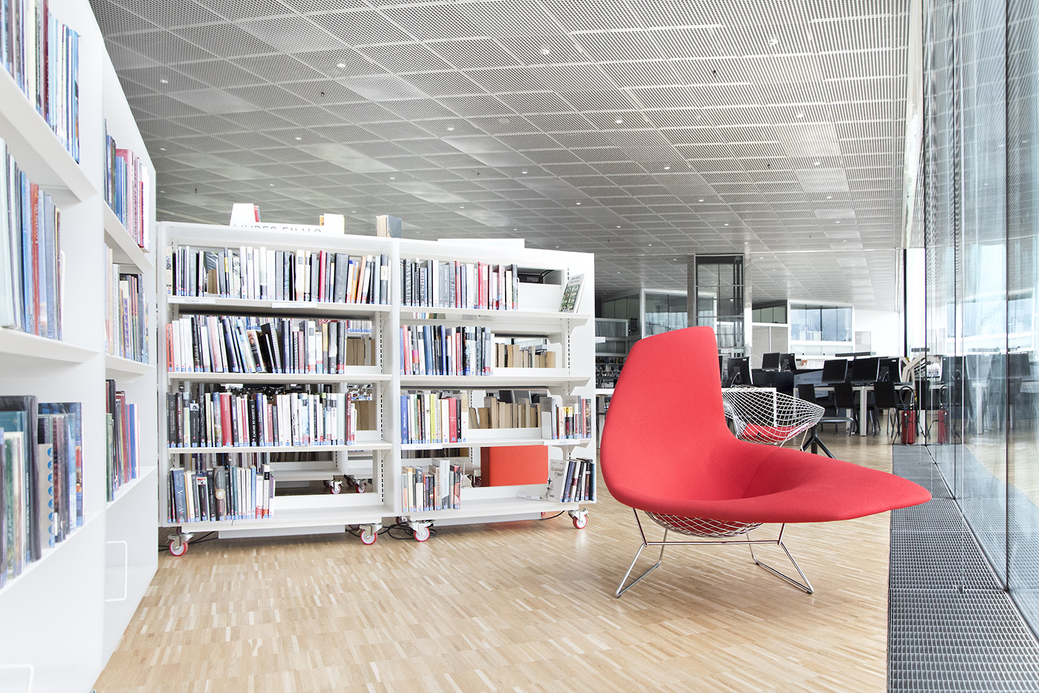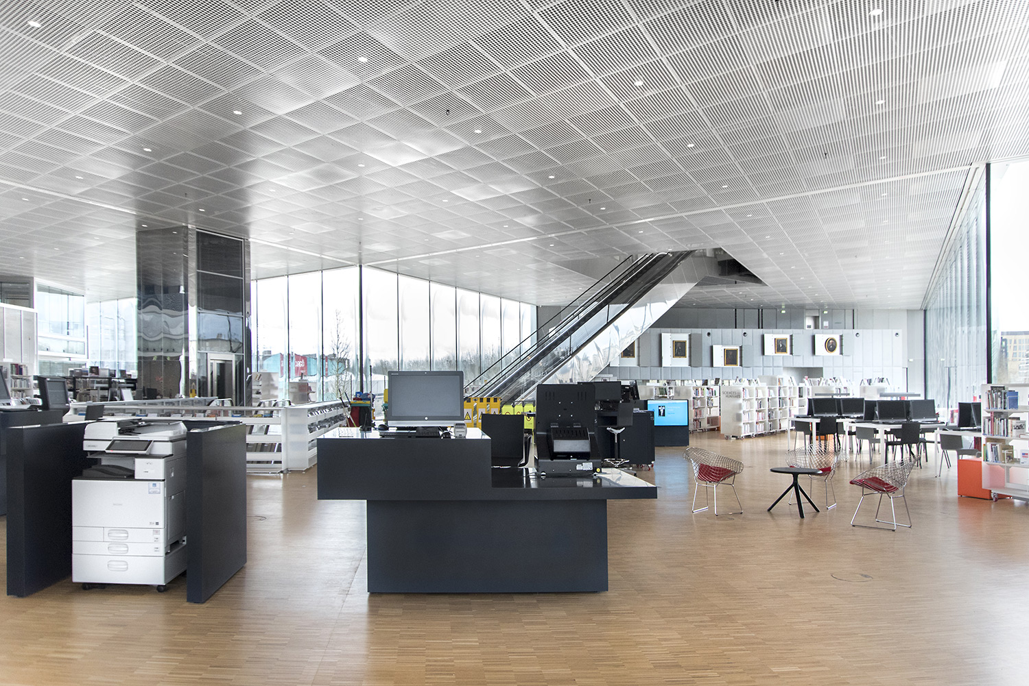 Un grand nombre de places de travail et de lecture accompagne les plus de 120.000 documents. L’organisation de ces documents a la particularité d’intégrer les supports papier et digitaux côte à côte sur les étagères, ce qui a demandé le développement de nouveaux supports par BCI. C’est une des nombreuses particularités de cette Bibliothèque, très axée sur l’intégration de tout support média.