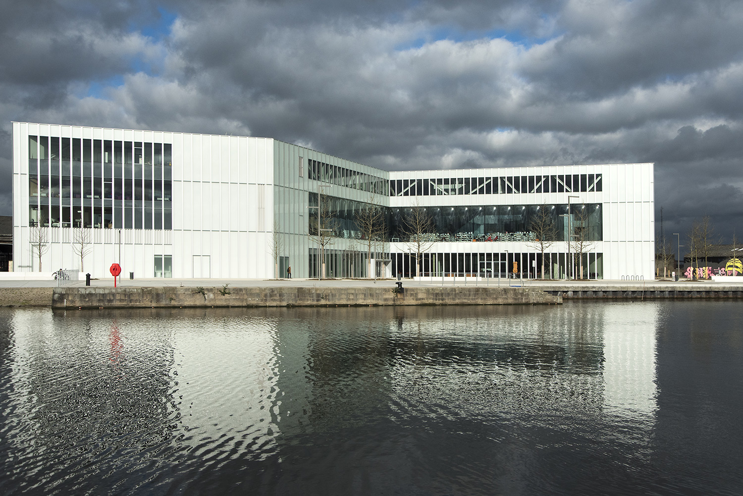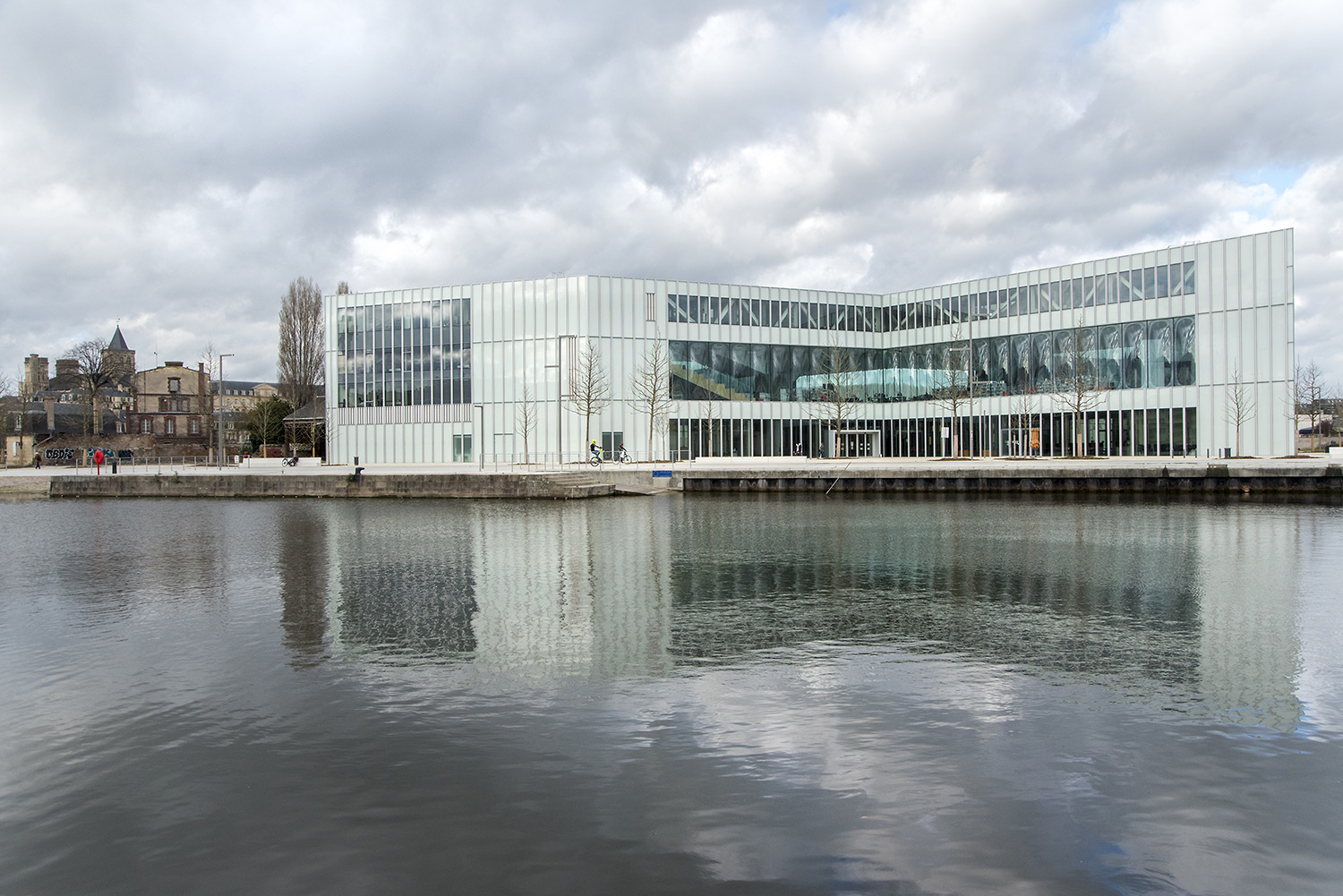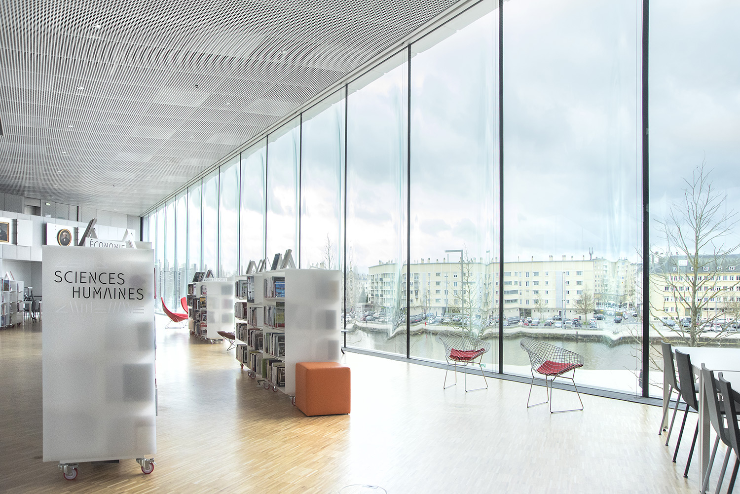 Le bâtiment, situé face au bassin Saint-Pierre à Caen, s’étend sur une surface de 12 000 m² répartie sur 4 niveaux. Ouvert à l’ouest à l’est, très lumineux grâce à sa faille horizontale totalement transparente et libre de toute structure, il est pensé comme un forum urbain. La façade en verre fait le lien entre le parc d’un côté et les passages piétons de l’autre, coté bassin. Les deux grandes entrées de part et d’autre permettent une fluidité et une interaction avec les espaces alentours. Sa position clef, entre le centre historique and les nouveaux quartiers, correspond à la volonté de la ville de voir la Bibliothèque devenir un nouveau pôle central pour la population.