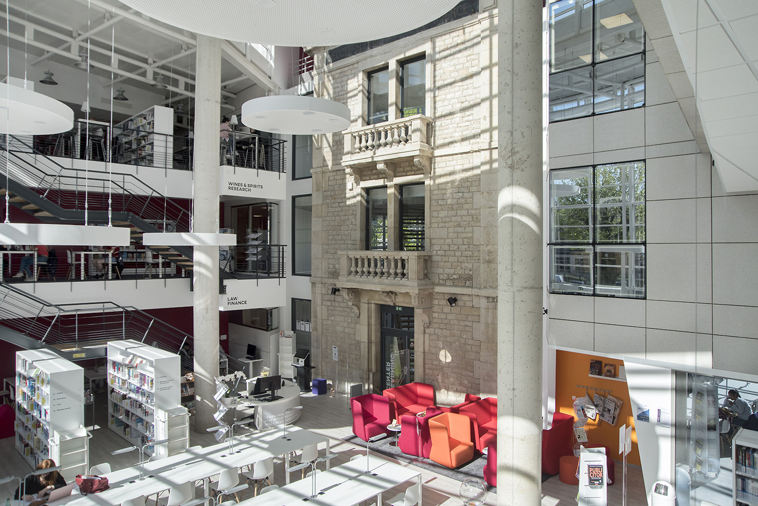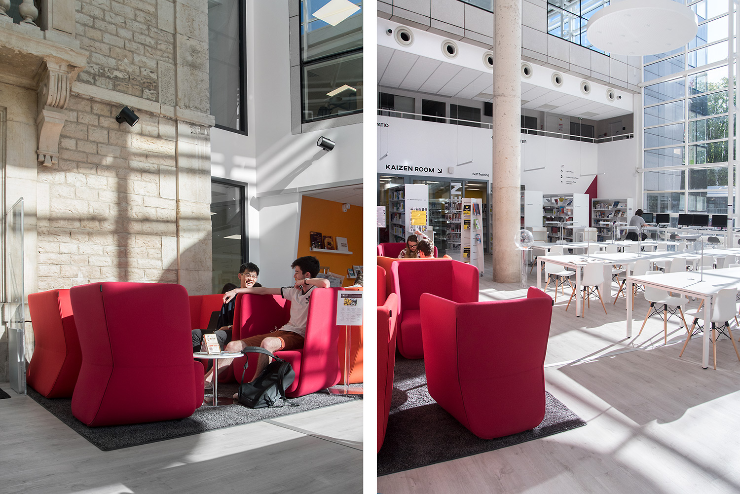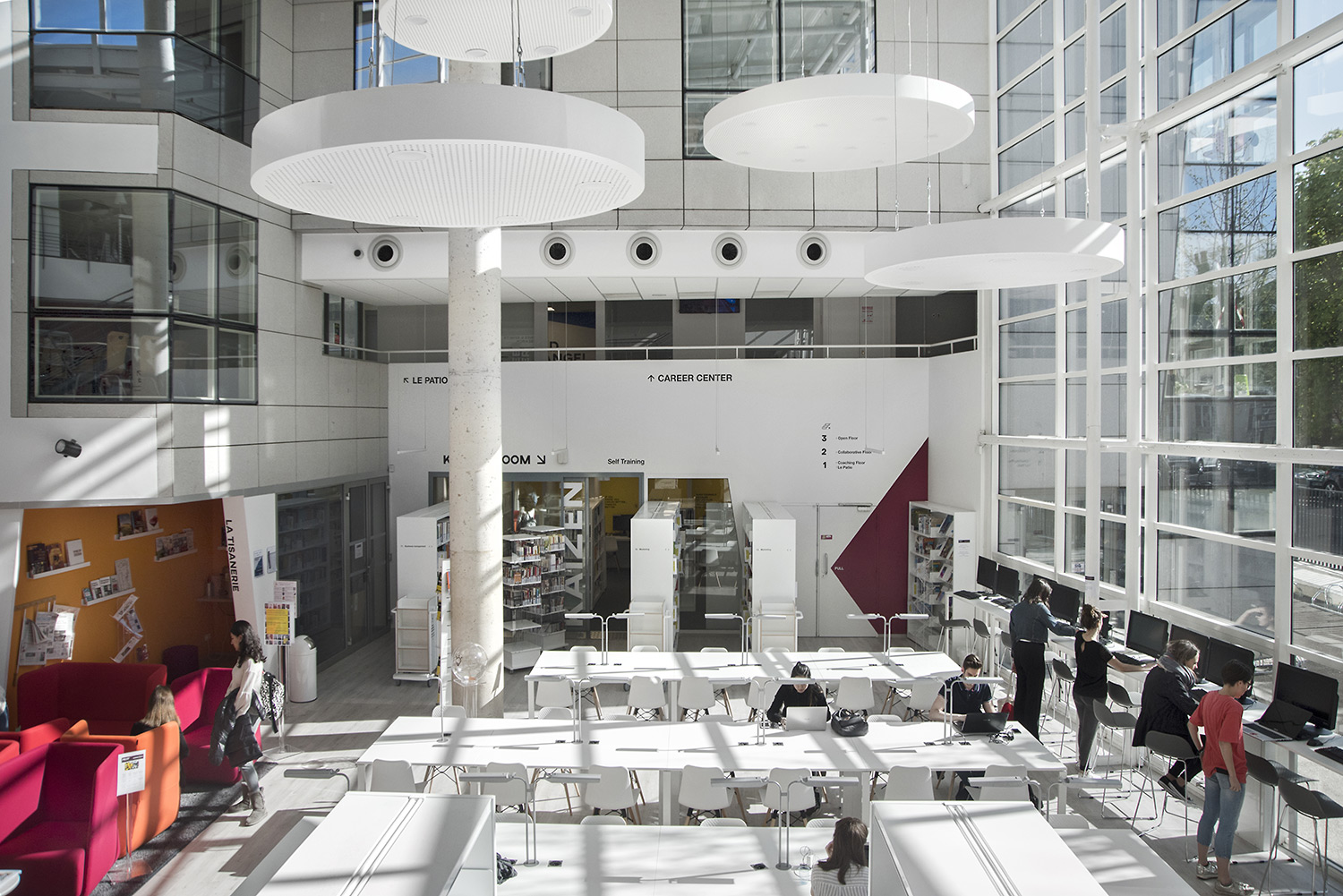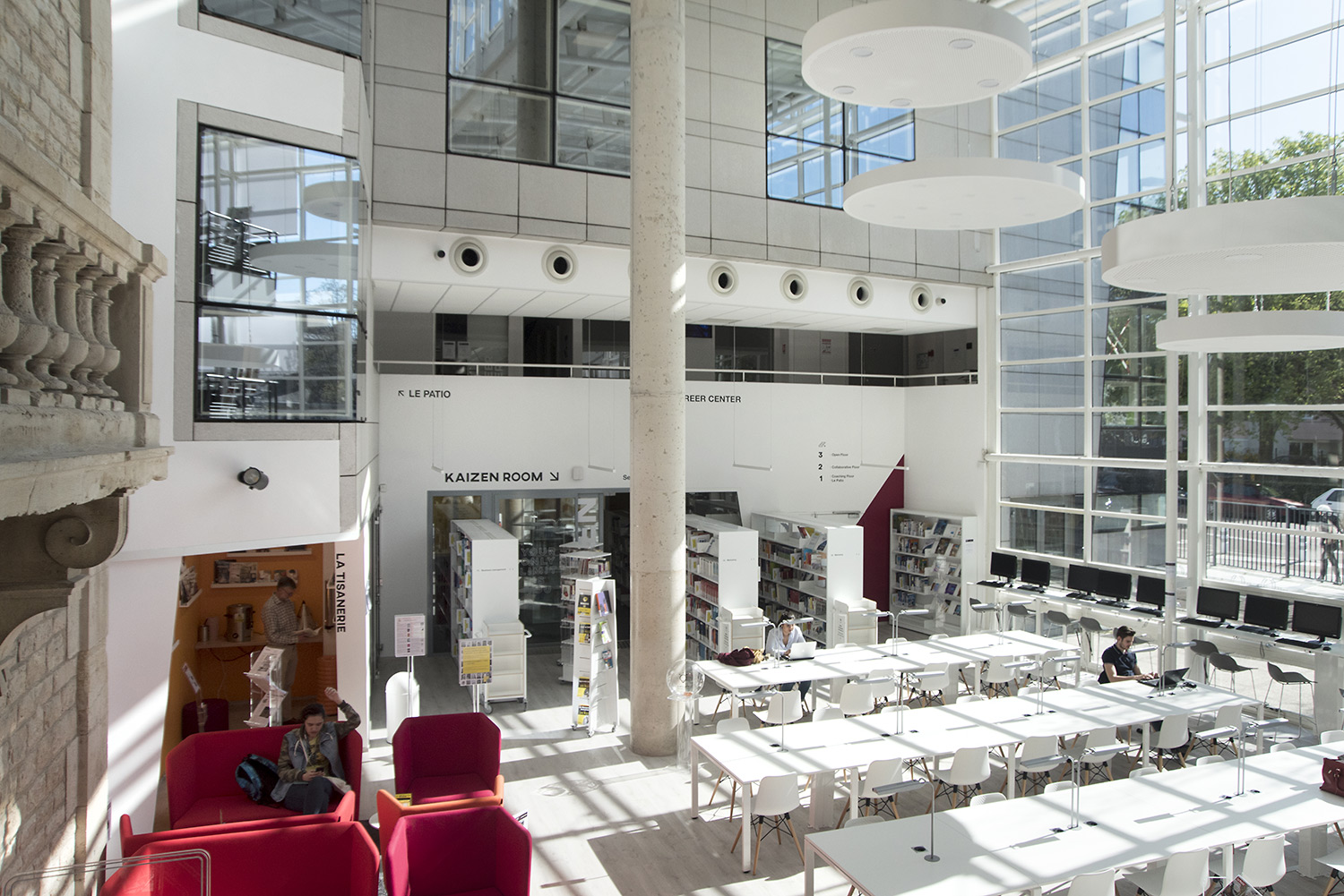 On y trouve des environnements de travail pour tous les goûts, consacrés au self training (Kaizen Room) avec des postes individuels pour favoriser la concentration ; des espaces dédiés au coaching (Career Center) ; des espaces collaboratifs (box de travail, Hub Creativity) ; et des espaces open mind, pour s’ouvrir au monde (culture, wine, télévisions internationales). Le Patio, espace organique des bibliothèques traditionnelles, offre une ouverture de verdure apaisante.