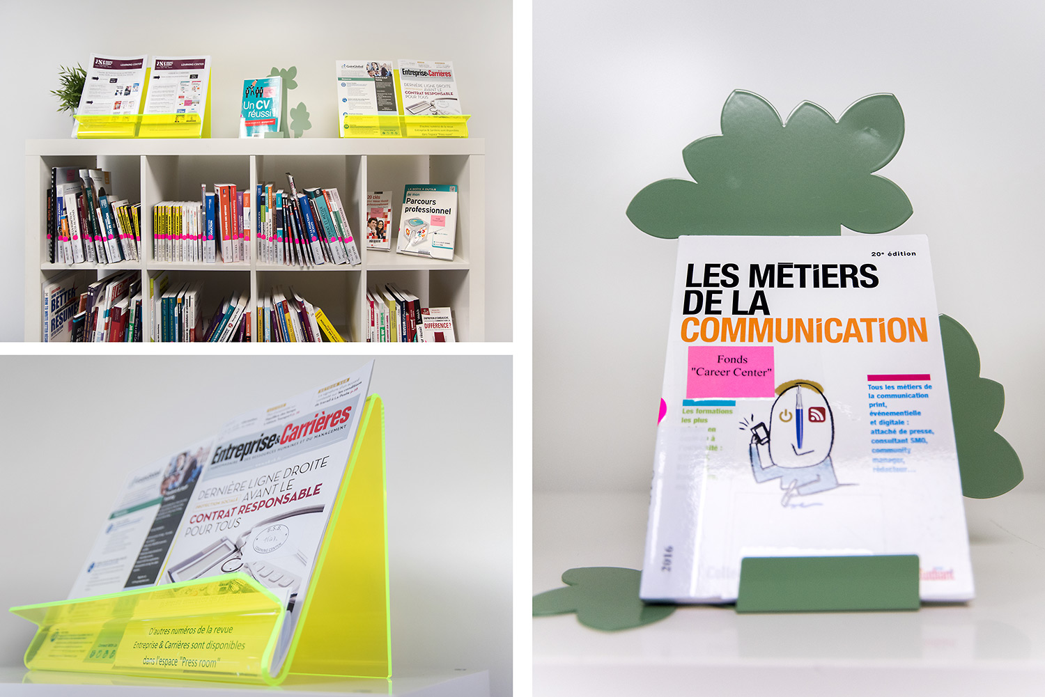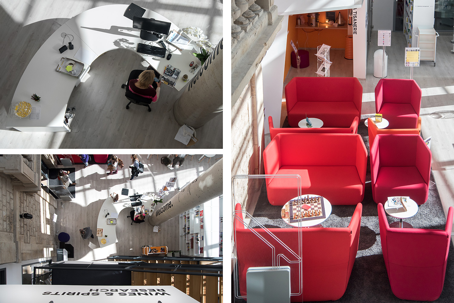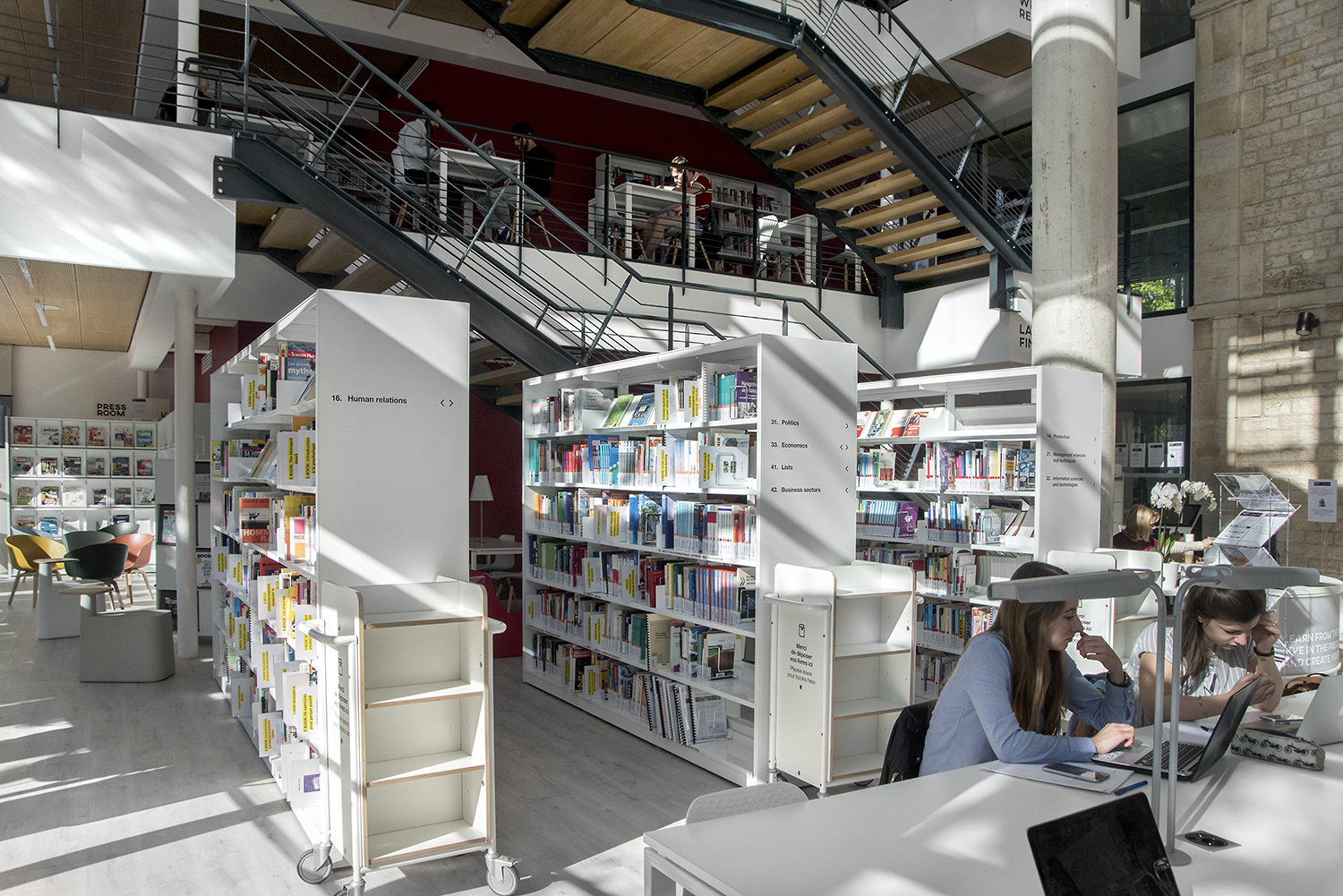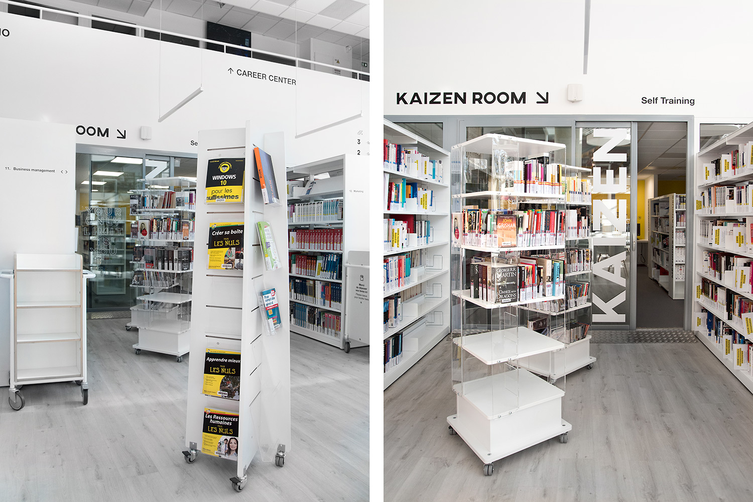 On y trouve des environnements de travail pour tous les goûts, consacrés au self training (Kaizen Room) avec des postes individuels pour favoriser la concentration ; des espaces dédiés au coaching (Career Center) ; des espaces collaboratifs (box de travail, Hub Creativity) ; et des espaces open mind, pour s’ouvrir au monde (culture, wine, télévisions internationales). Le Patio, espace organique des bibliothèques traditionnelles, offre une ouverture de verdure apaisante.