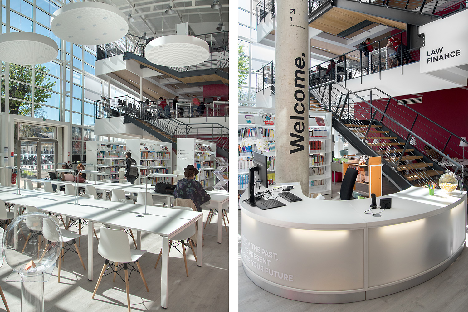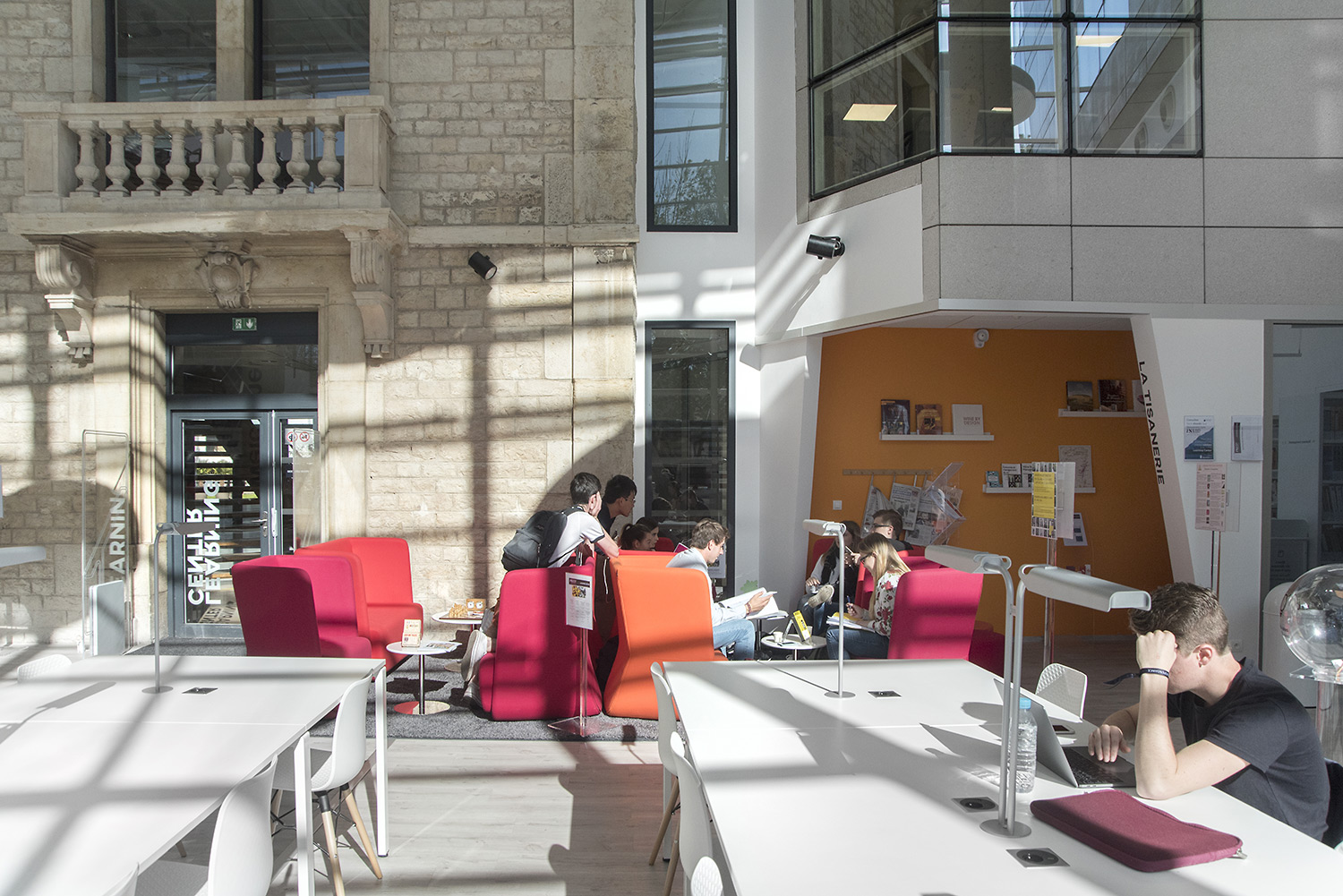 Ce lieu a été conçu comme le véritable cœur battant du campus. Situé sous la verrière emblématique de l’École, qui abrite toujours la porte originelle du bâtiment 1900, il propose toute une gamme d’espaces collaboratifs et individuels, créatifs, pédagogiques, et même de détente.