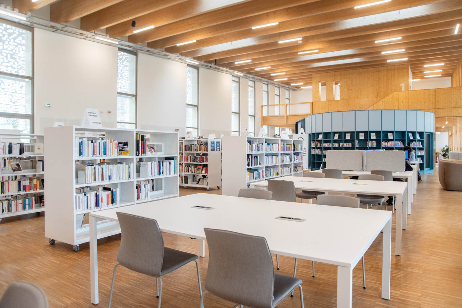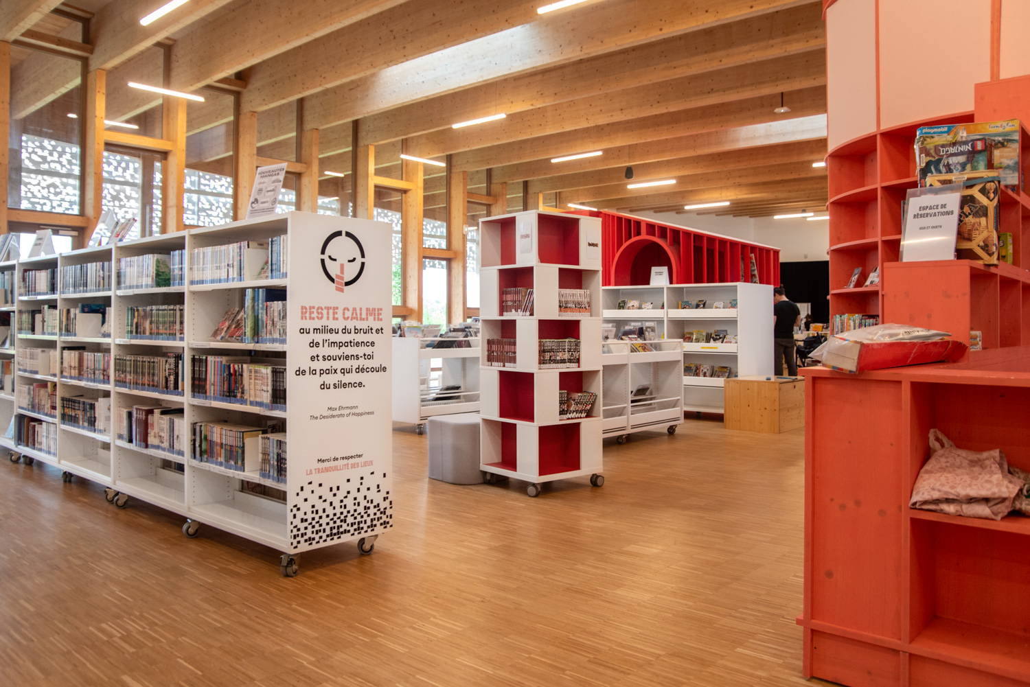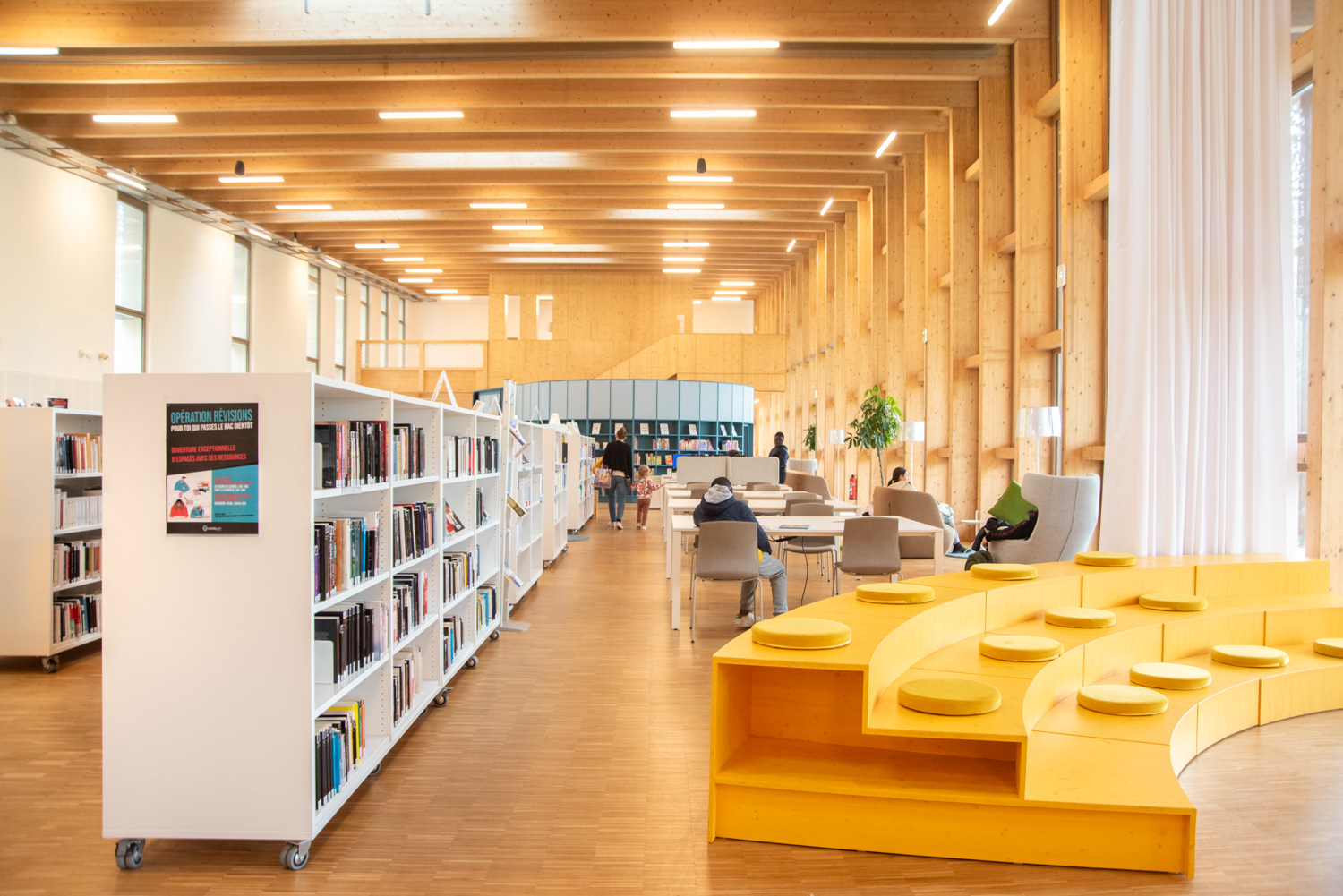 À l’intérieur, le mobilier aux teintes claires et naturelles instaure une ambiance apaisante qui met en valeur les ouvrages tout en soulignant la beauté des structures en bois du bâtiment. Des éléments colorés, conçus sur mesure, viennent dynamiser l’ensemble et délimitent avec clarté les différents espaces.