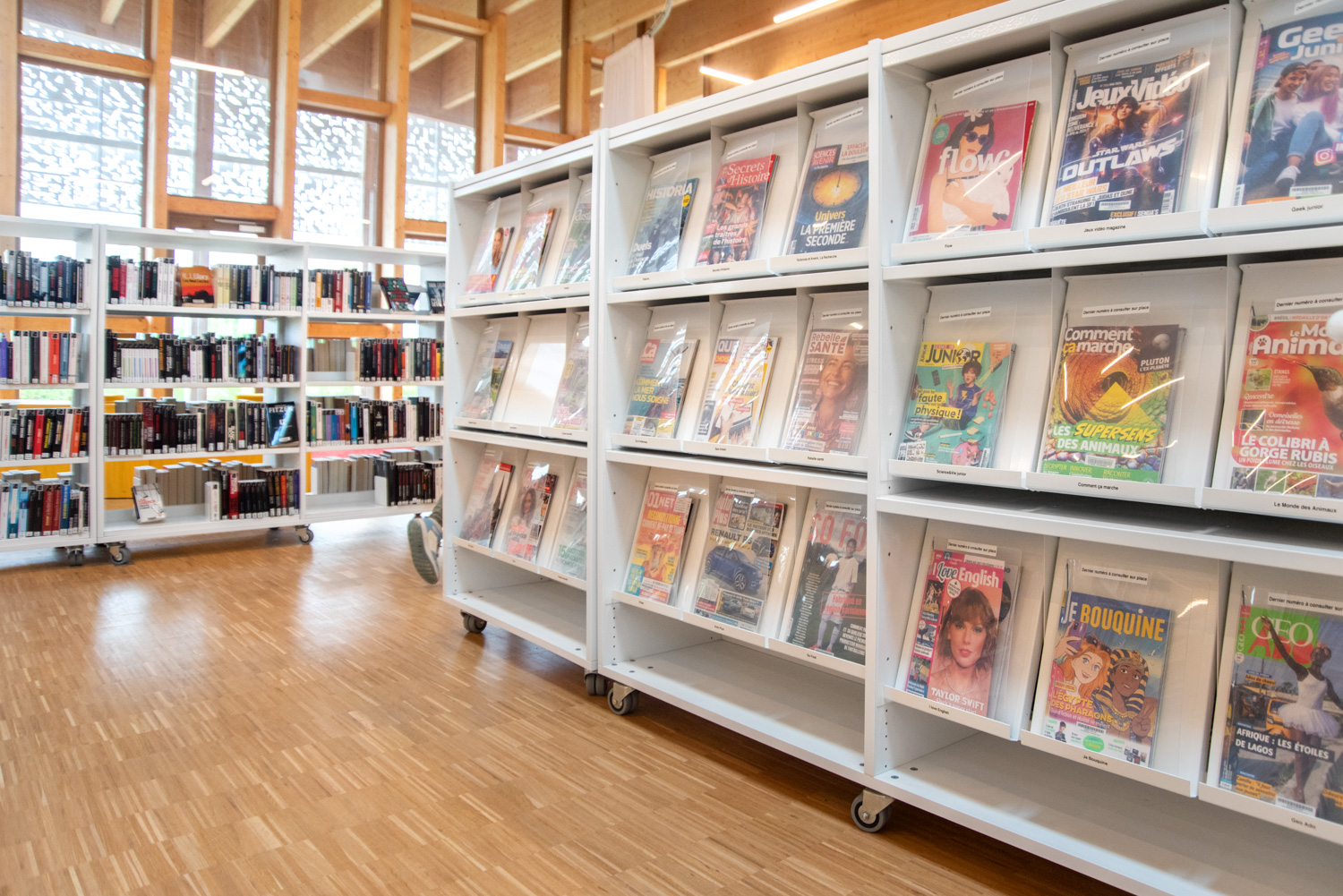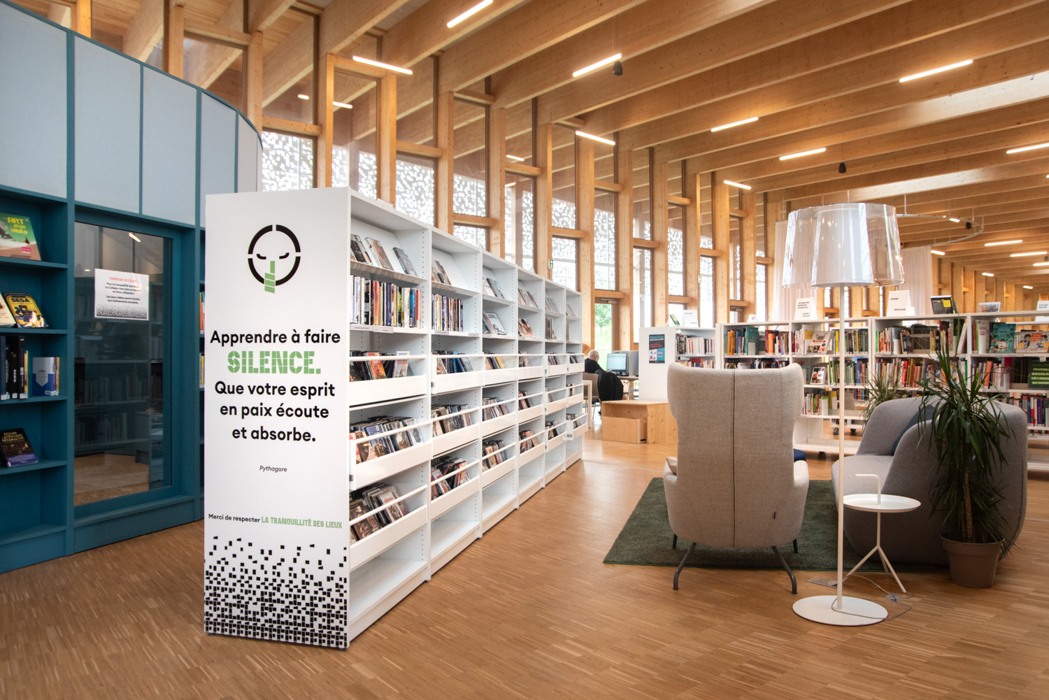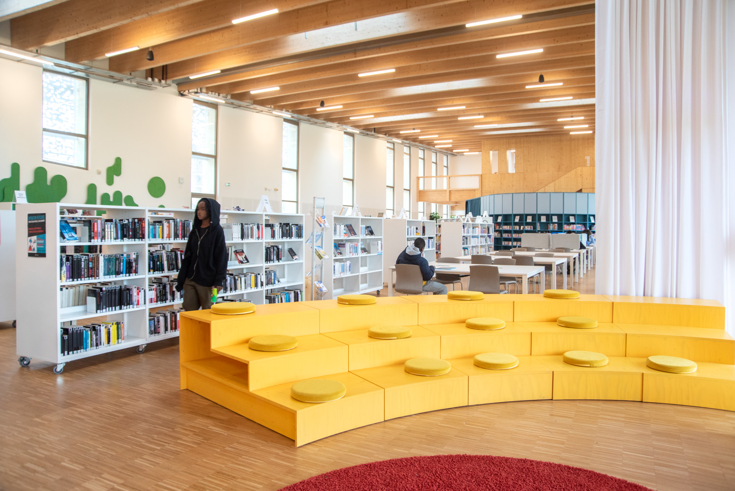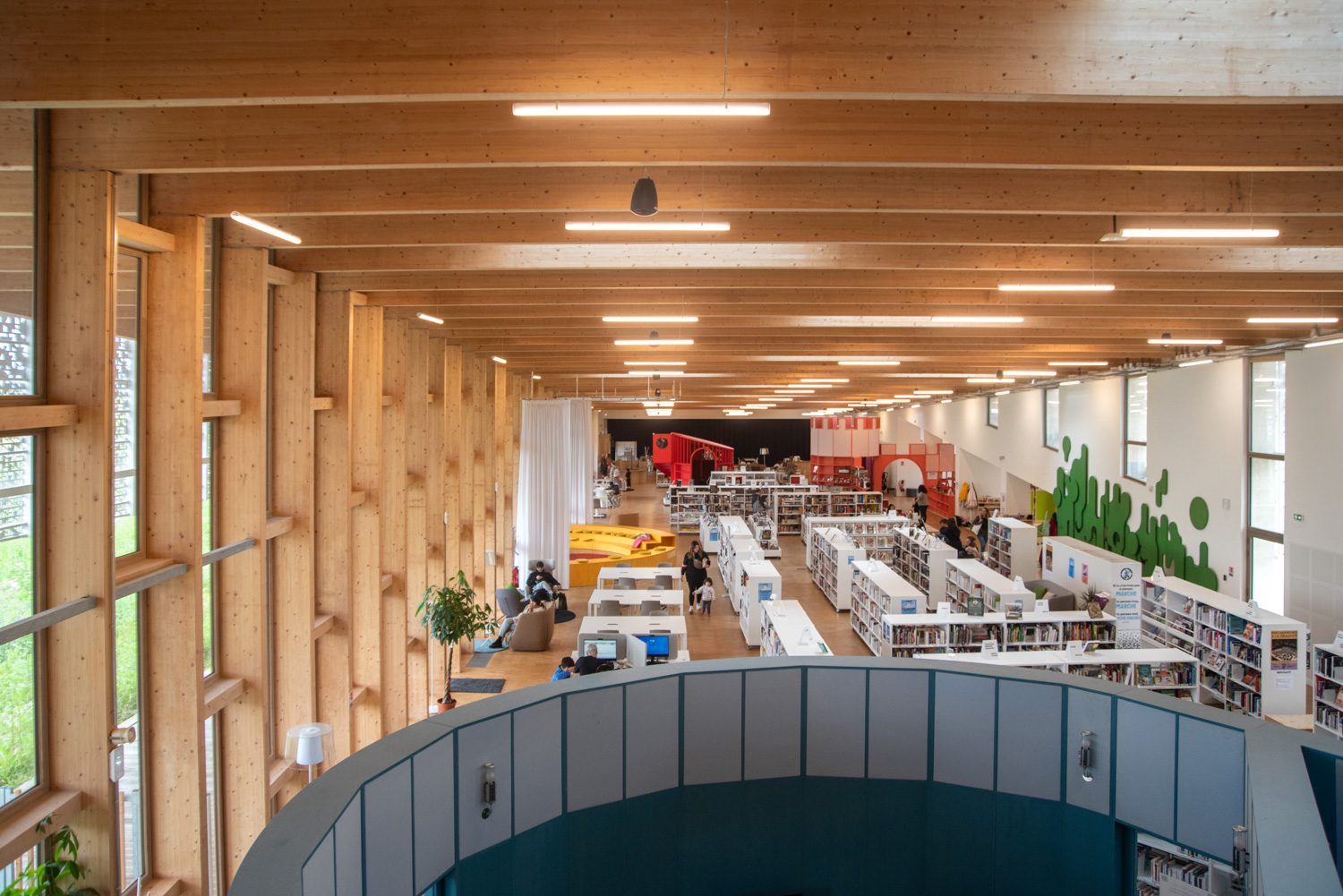 À l’intérieur, le mobilier aux teintes claires et naturelles instaure une ambiance apaisante qui met en valeur les ouvrages tout en soulignant la beauté des structures en bois du bâtiment. Des éléments colorés, conçus sur mesure, viennent dynamiser l’ensemble et délimitent avec clarté les différents espaces.