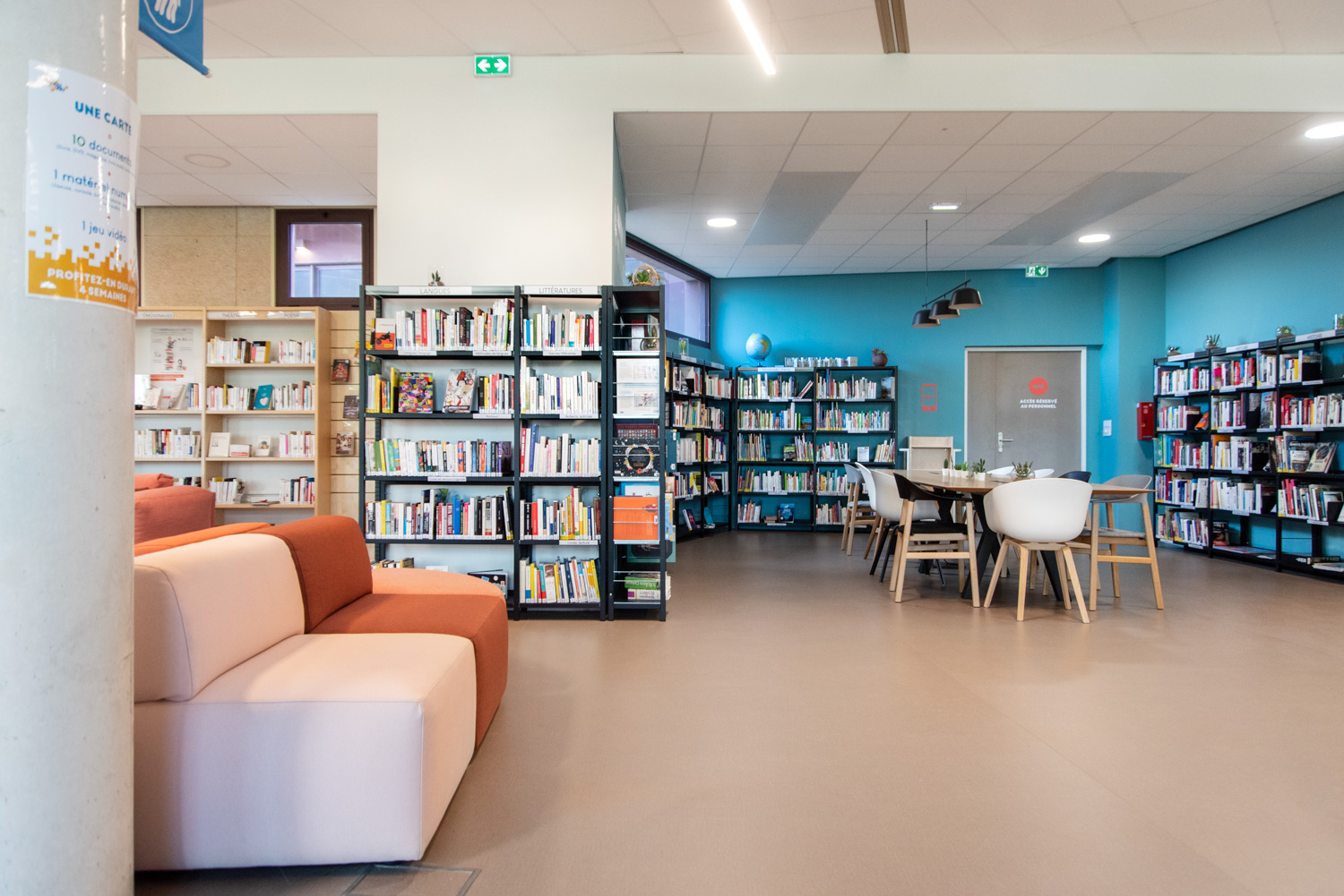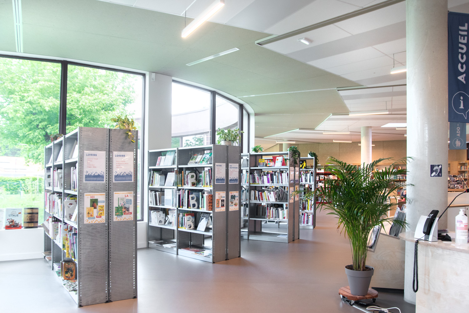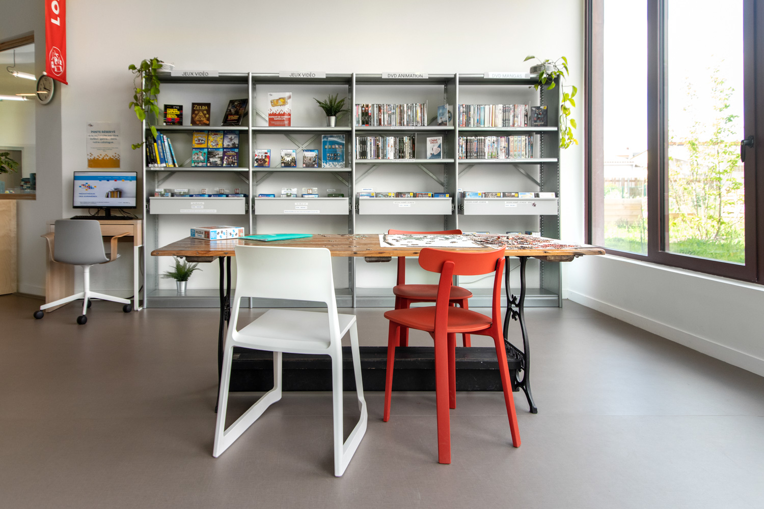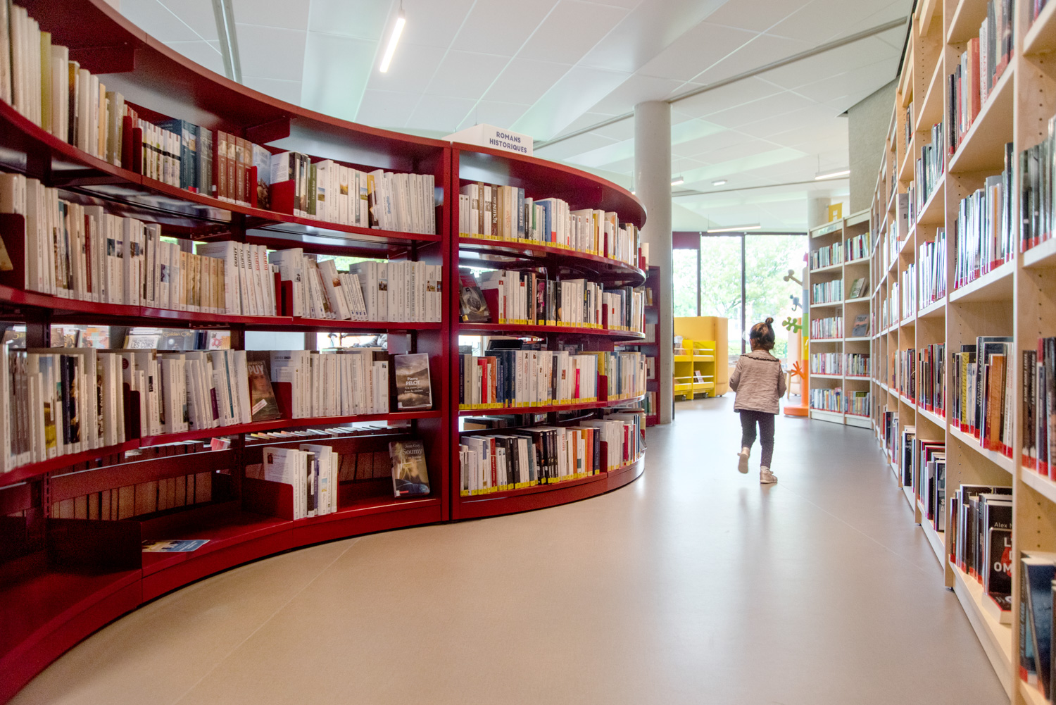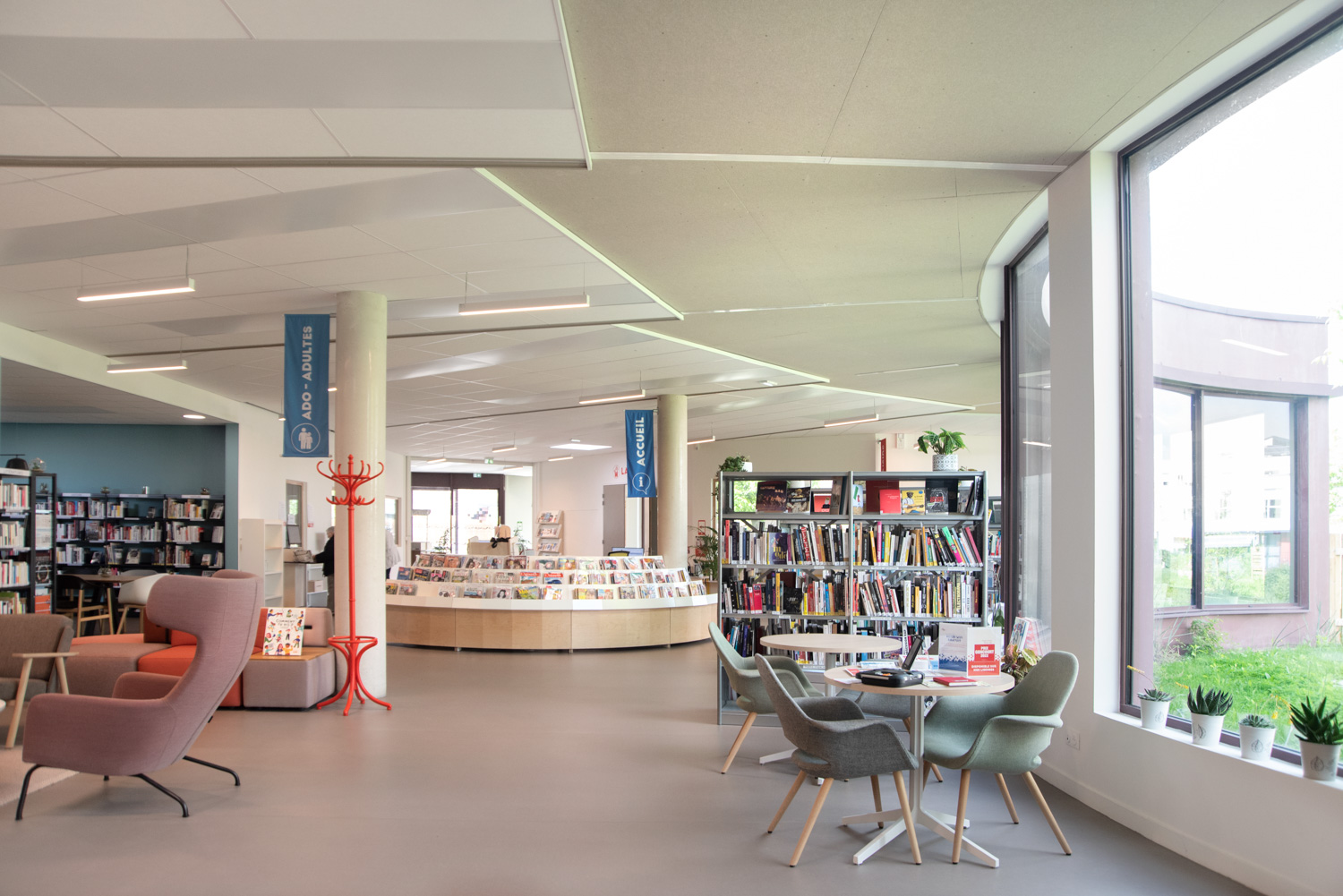 La Médiathèque et l’aménagement intérieur sont caractérisés par un choix de matériaux bruts, sobres, et pérennes, industriels ou recyclés permettant différentes ambiances. Ce projet est le contretype de nombreux projets portés par un choix de colorimétrie très neutre, le blanc des mobiliers, en grande majorité.