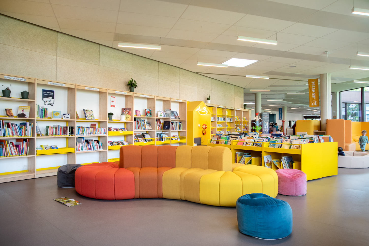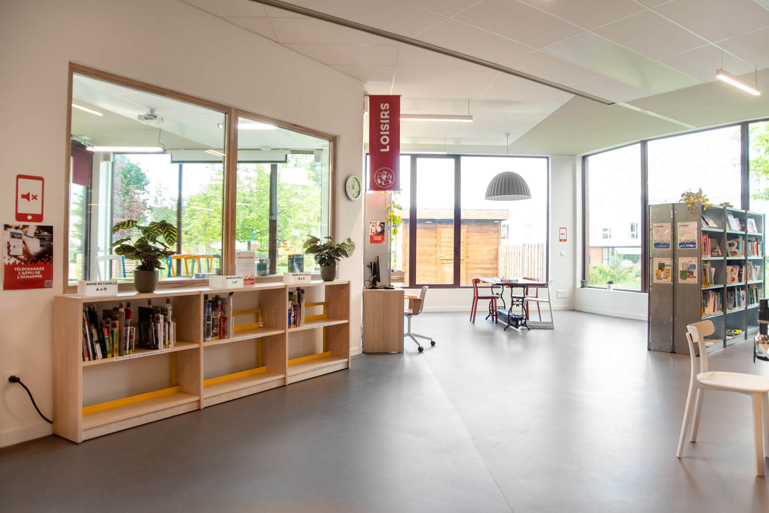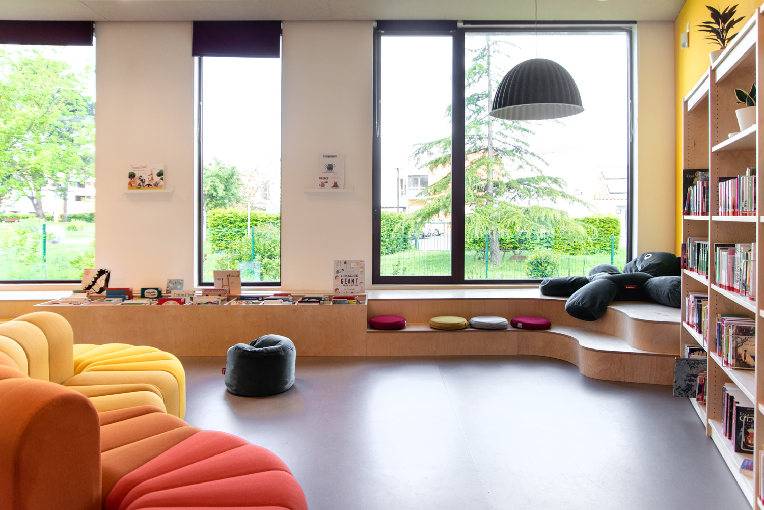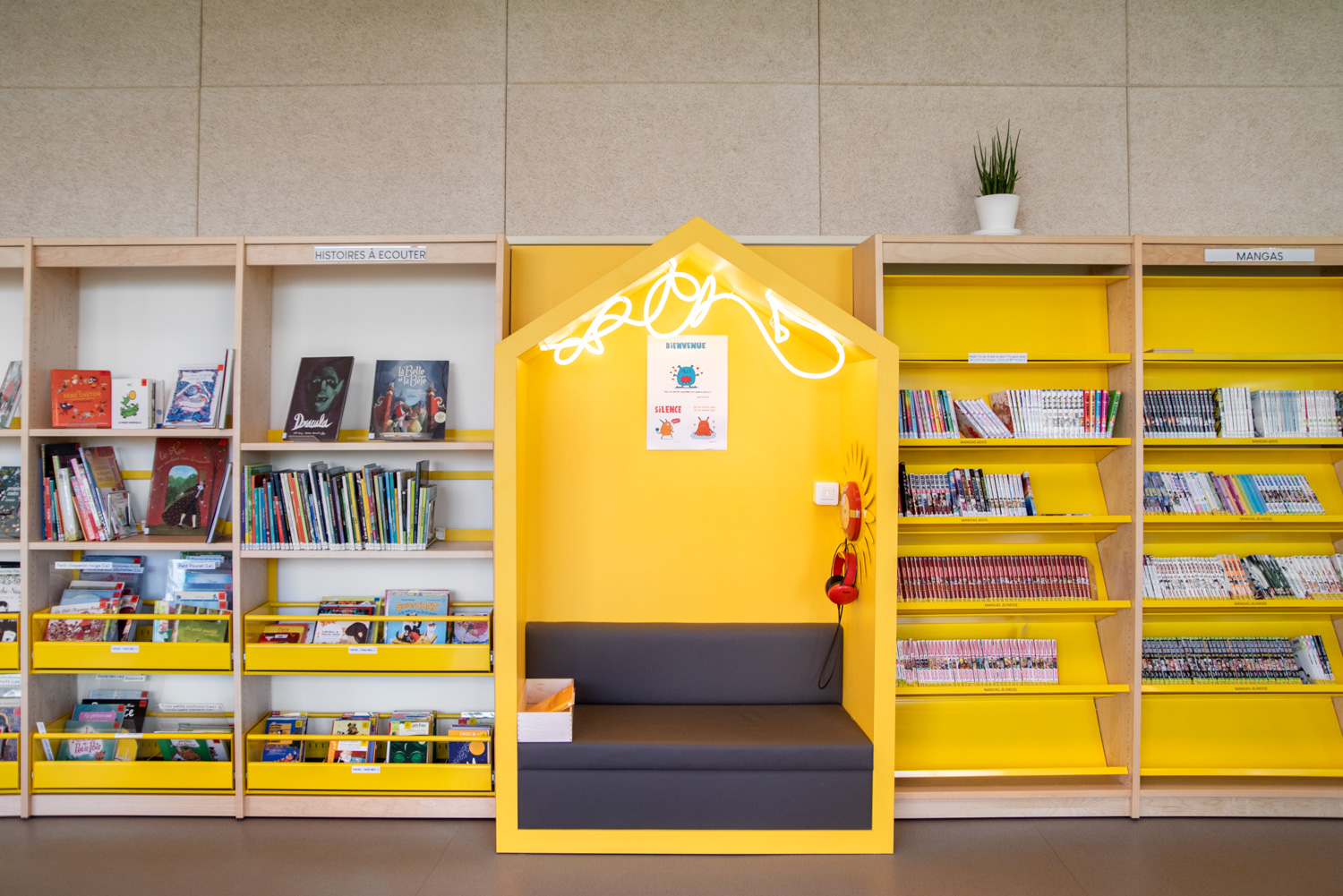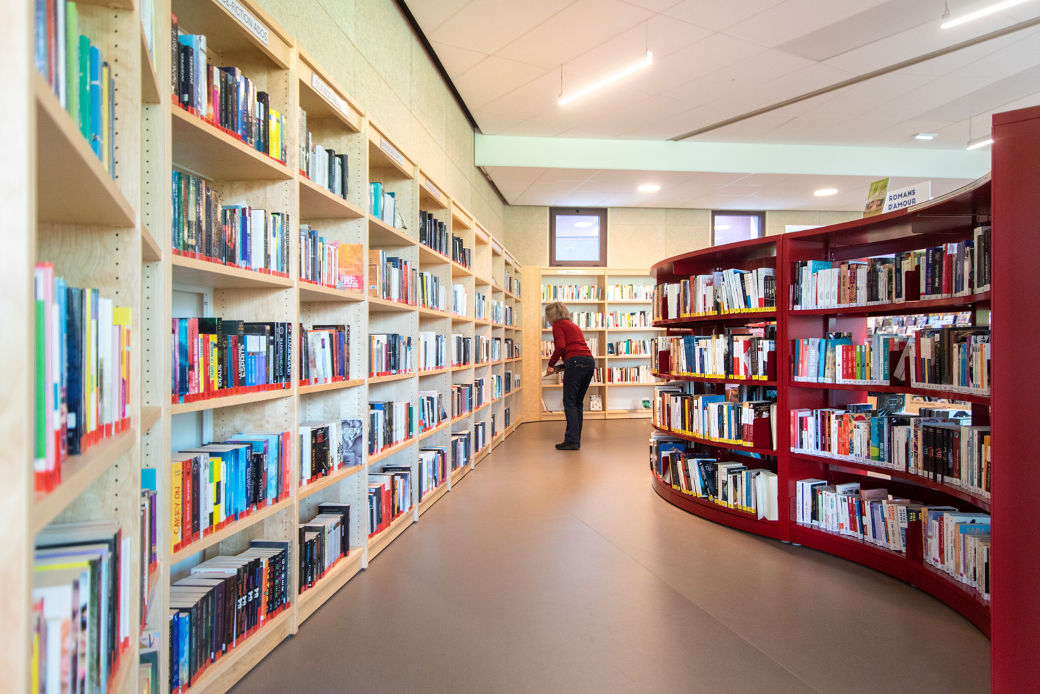La Médiathèque et l’aménagement intérieur sont caractérisés par un choix de matériaux bruts, sobres, et pérennes, industriels ou recyclés permettant différentes ambiances. Ce projet est le contretype de nombreux projets portés par un choix de colorimétrie très neutre, le blanc des mobiliers, en grande majorité.