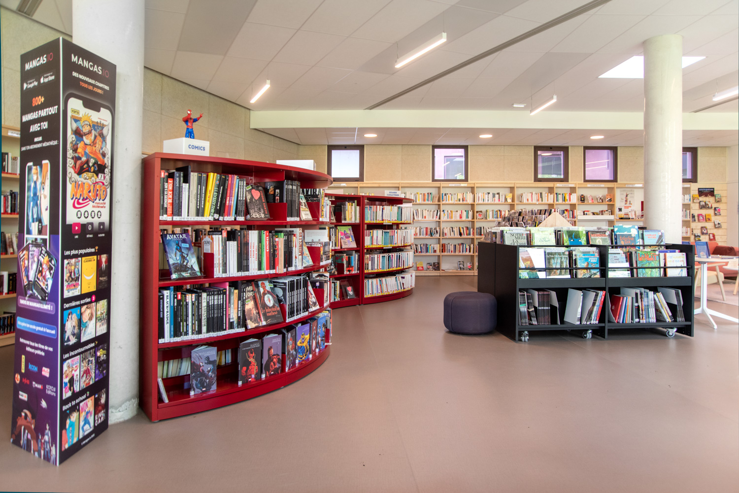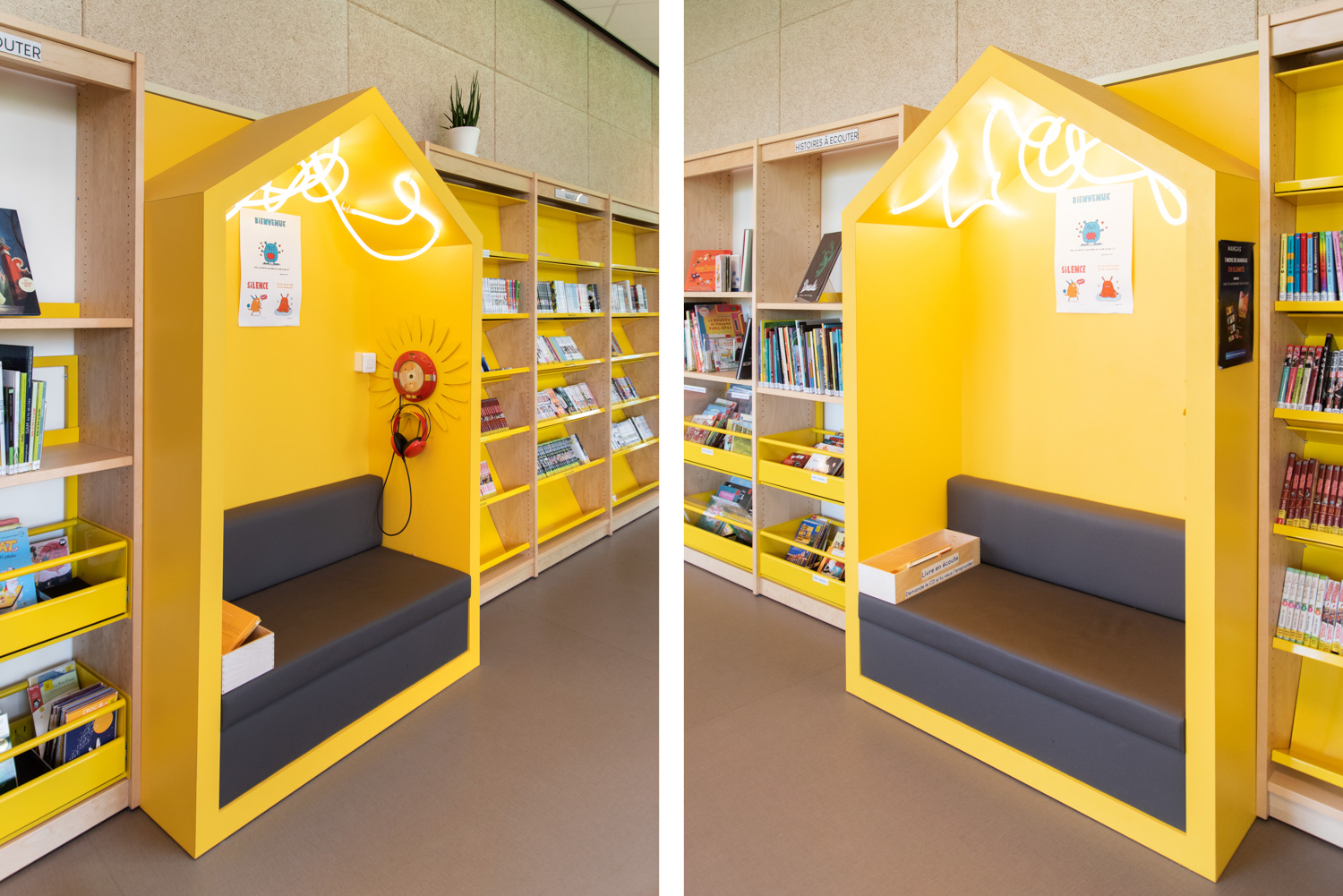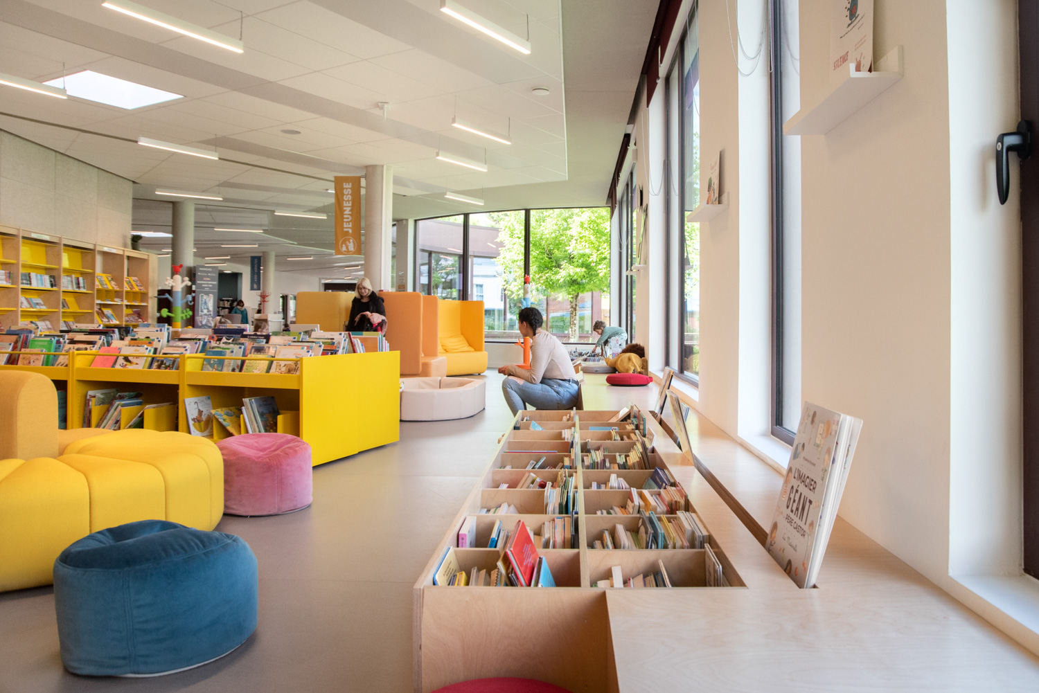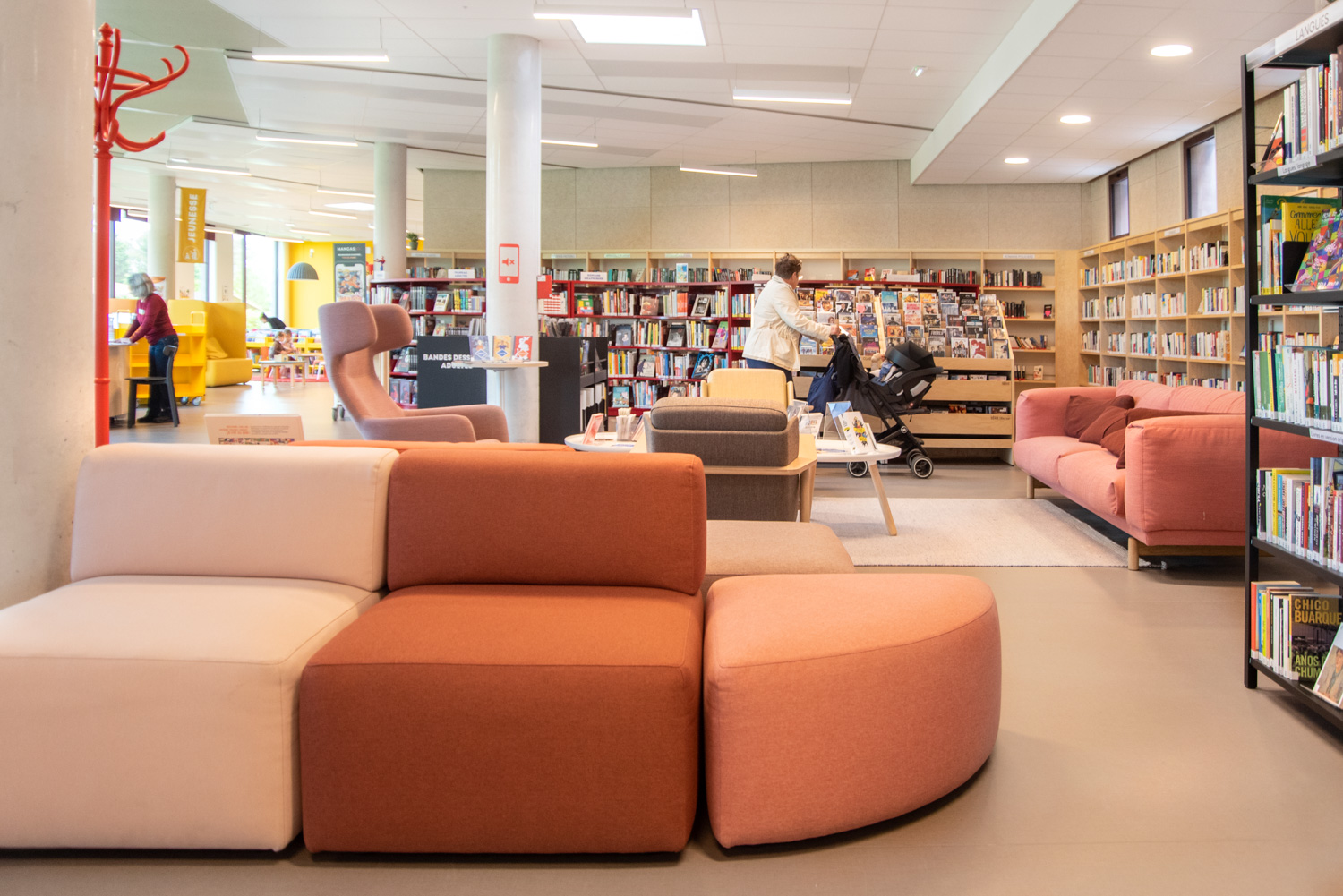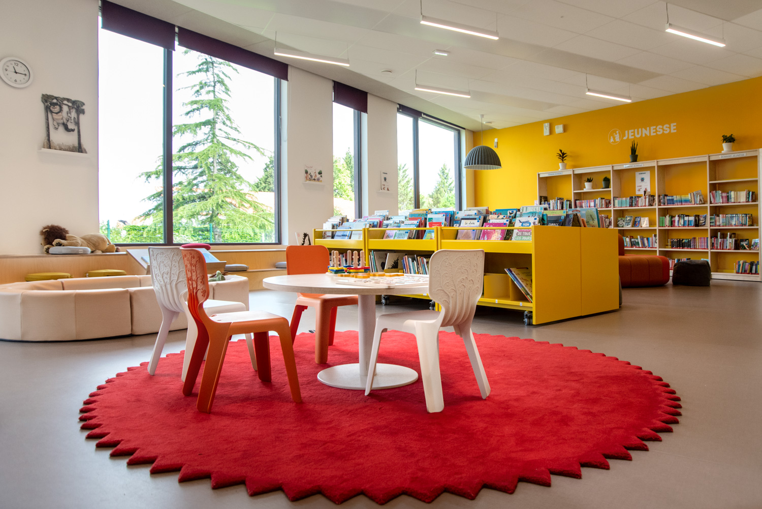 La Médiathèque et l’aménagement intérieur sont caractérisés par un choix de matériaux bruts, sobres, et pérennes, industriels ou recyclés permettant différentes ambiances. Ce projet est le contretype de nombreux projets portés par un choix de colorimétrie très neutre, le blanc des mobiliers, en grande majorité.