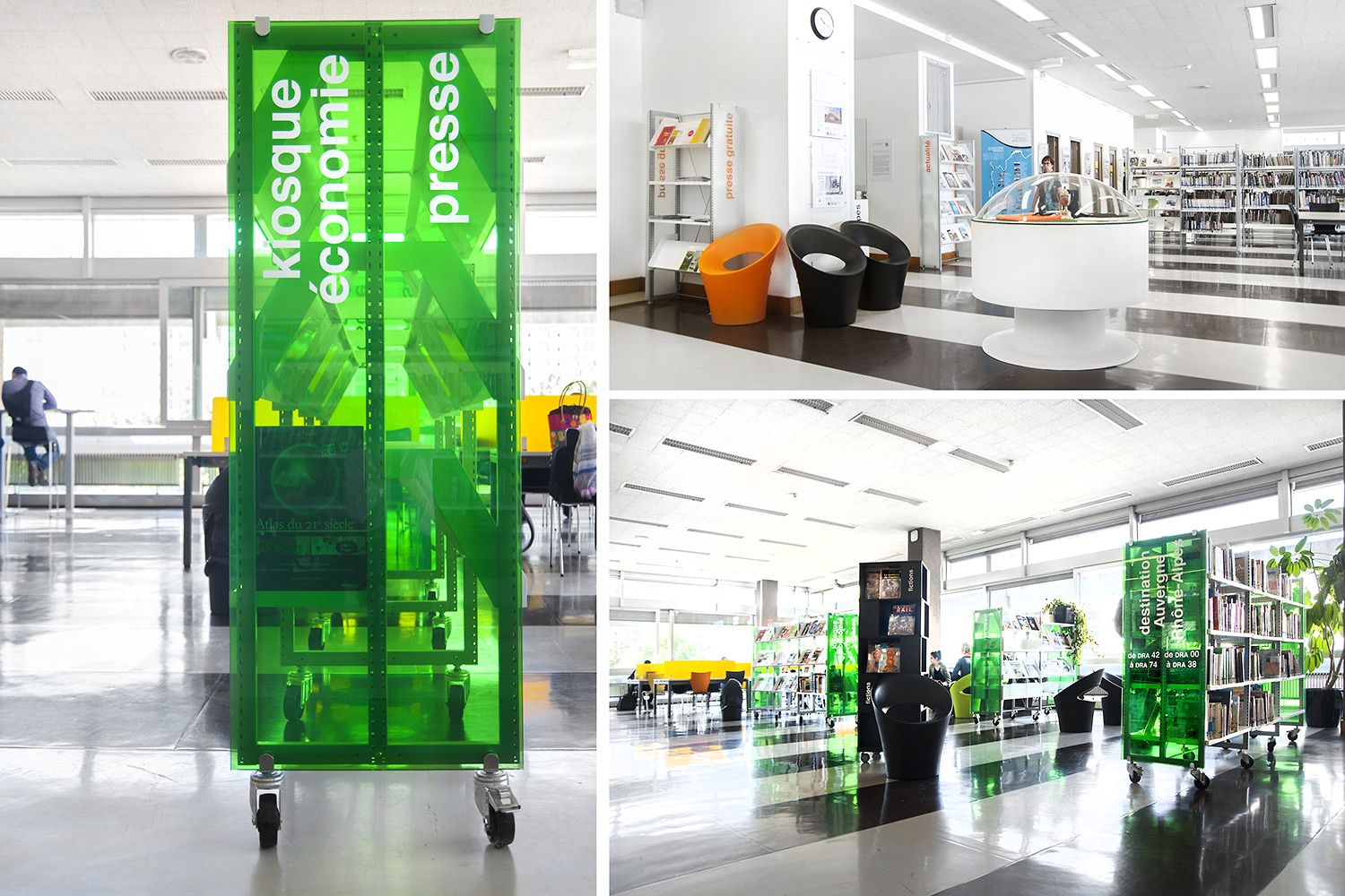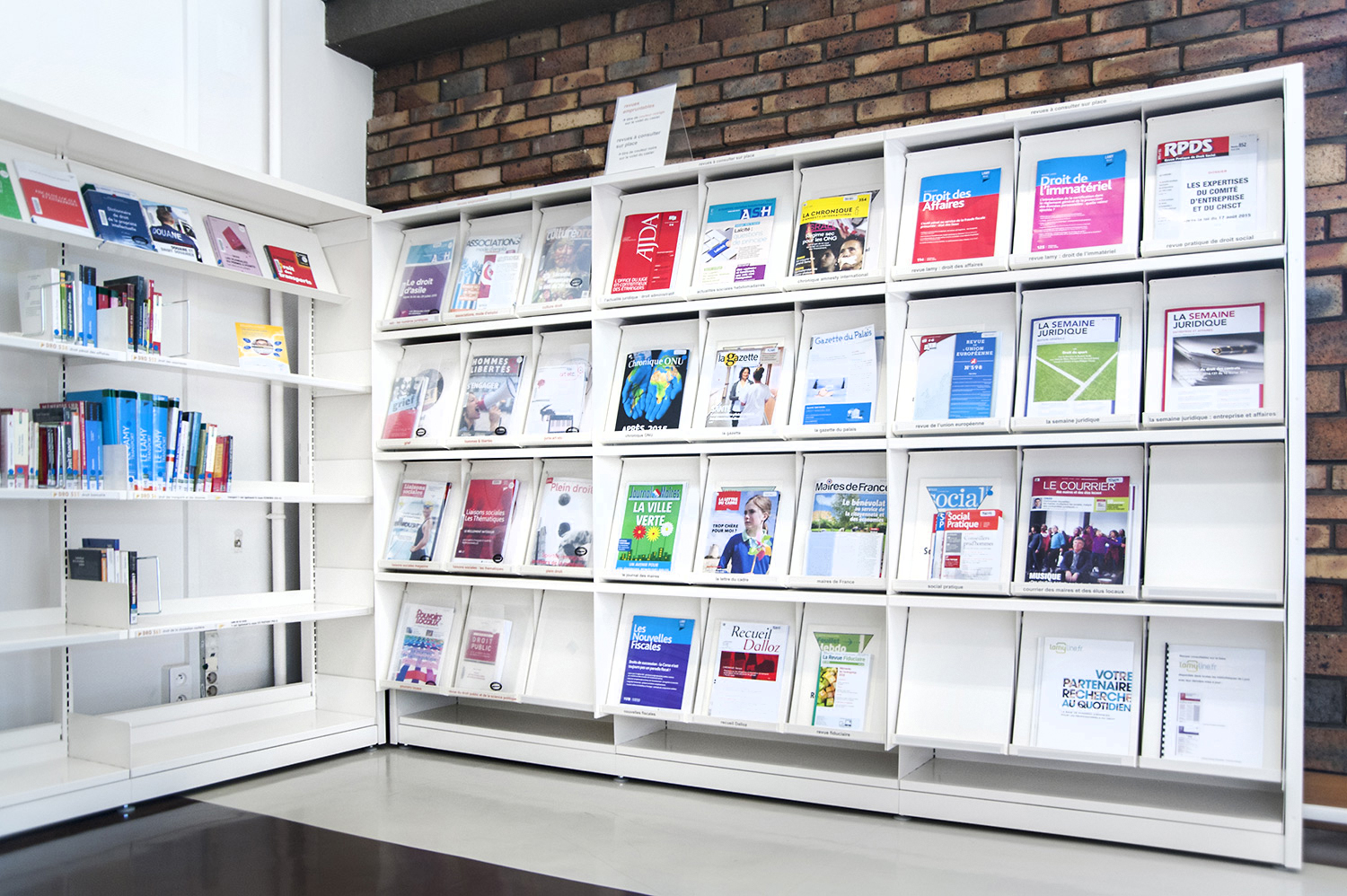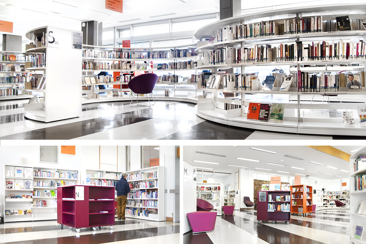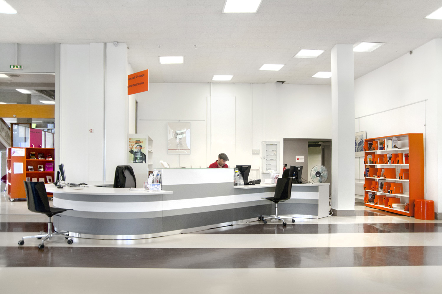 Le mobilier installé inclut notamment la gamme de rayonnages Classic London, droit et courbe, la gamme Opal verre, les banques d’accueil, des postes de travail, du mobilier de présentation et du mobilier de confort. Fonctionnel et esthétique le mobilier joue son rôle dans l’amélioration du confort général, des utilisateurs comme du personnel.