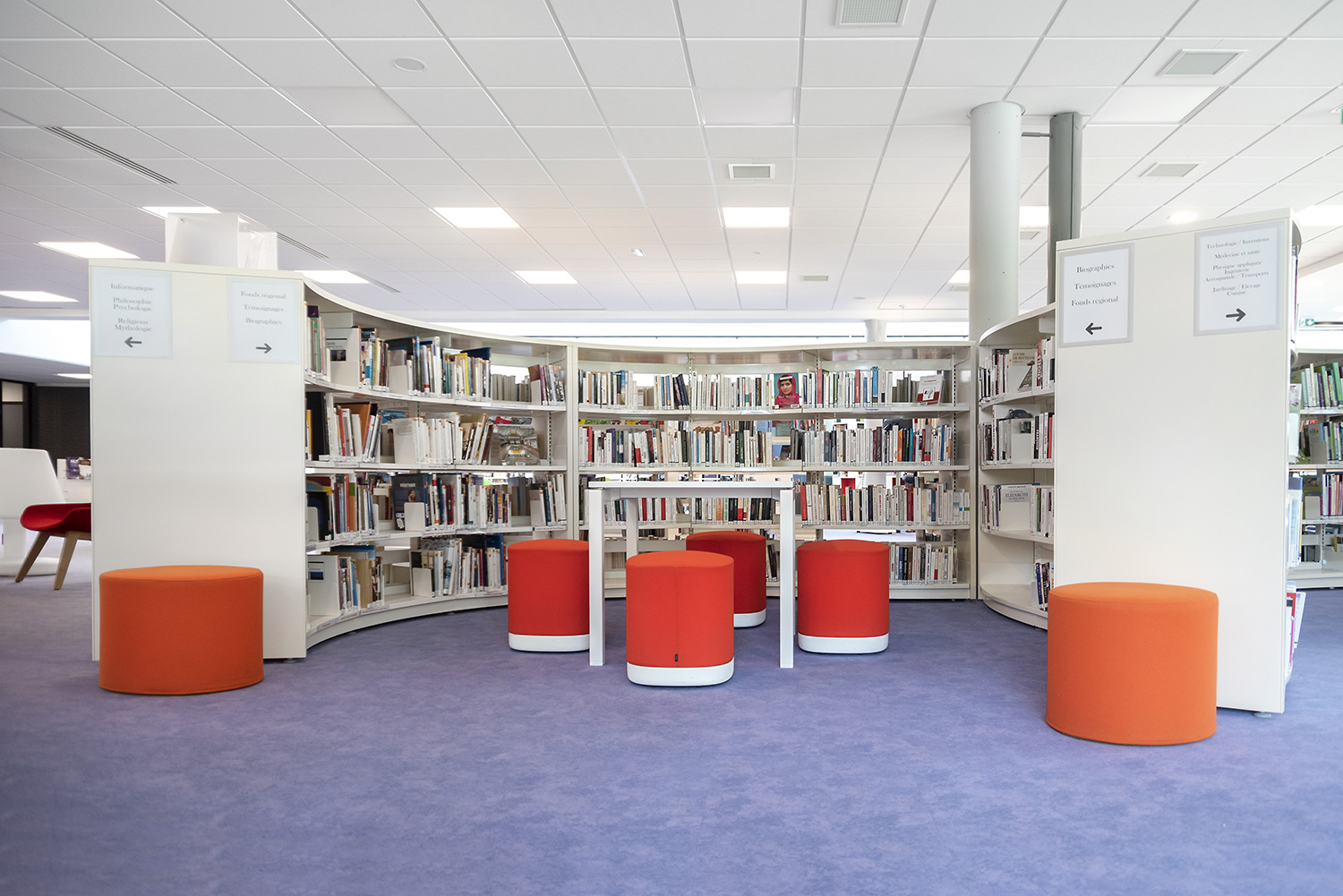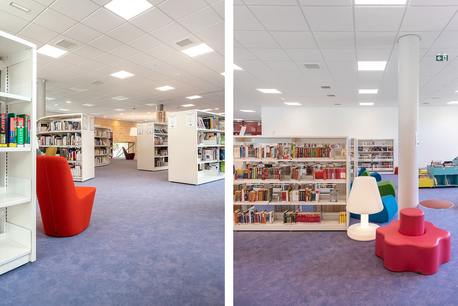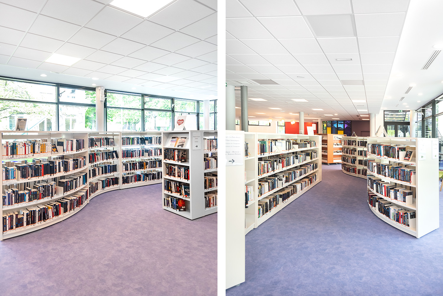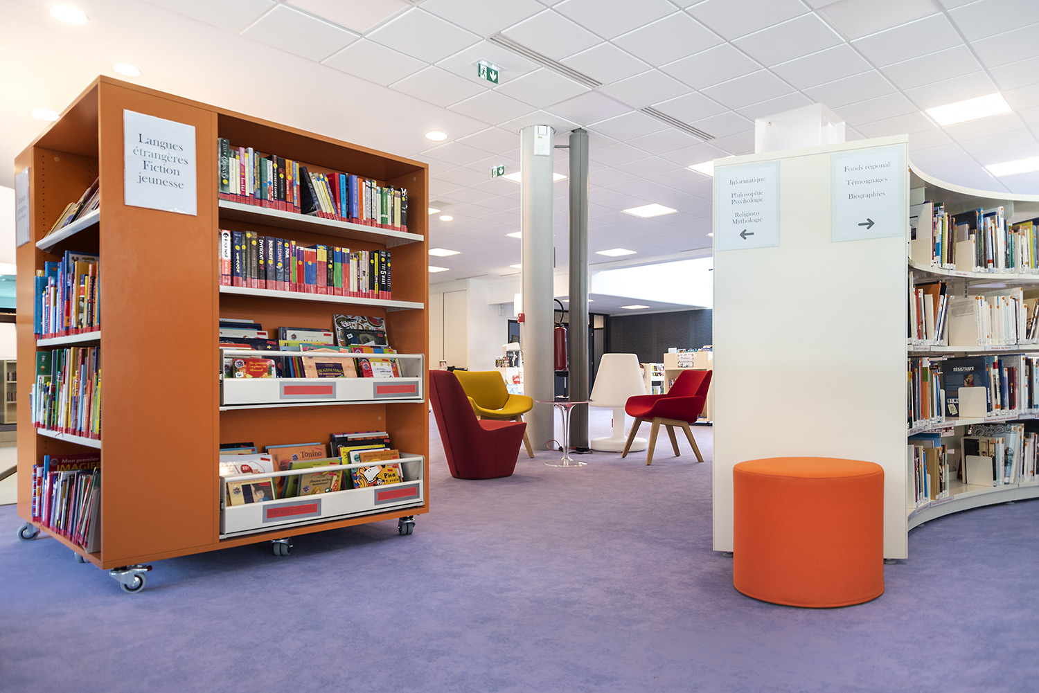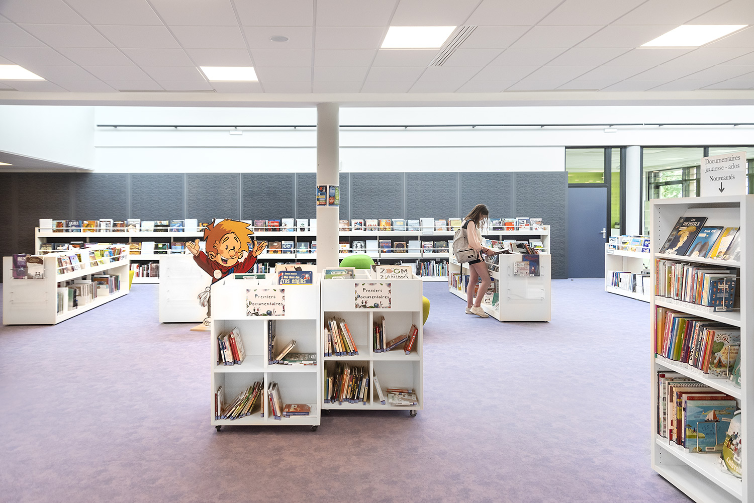 Au Rez de Chaussée, la Littérature adulte et littérature jeunesse se trouvent sur un même niveau pour faciliter la transition de lecture.