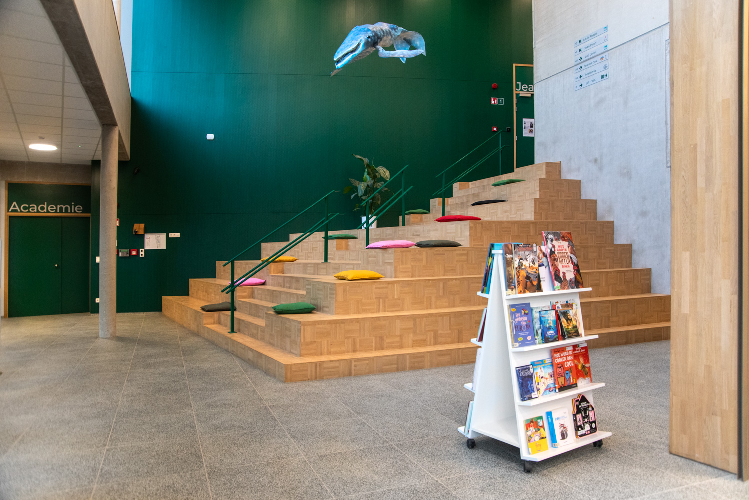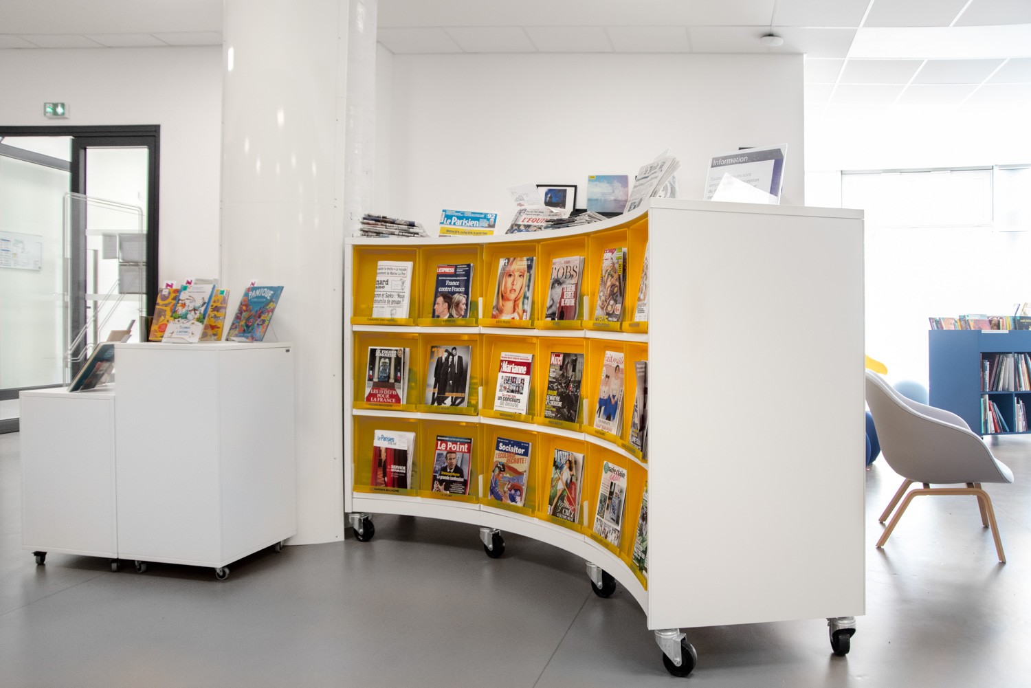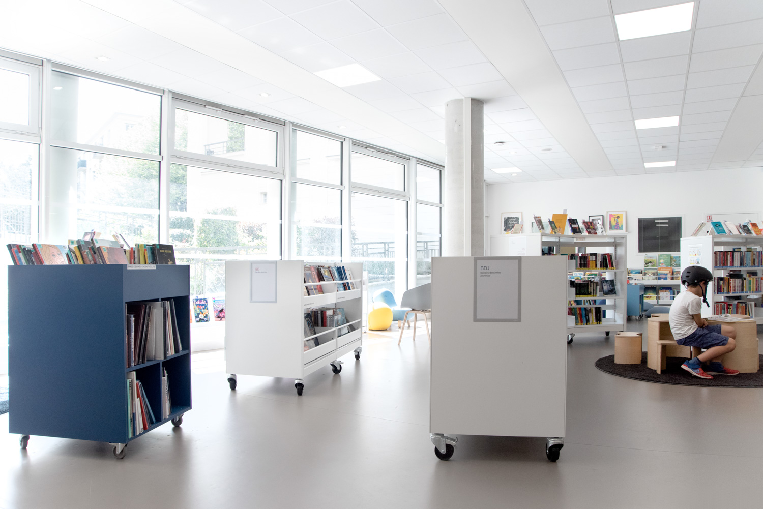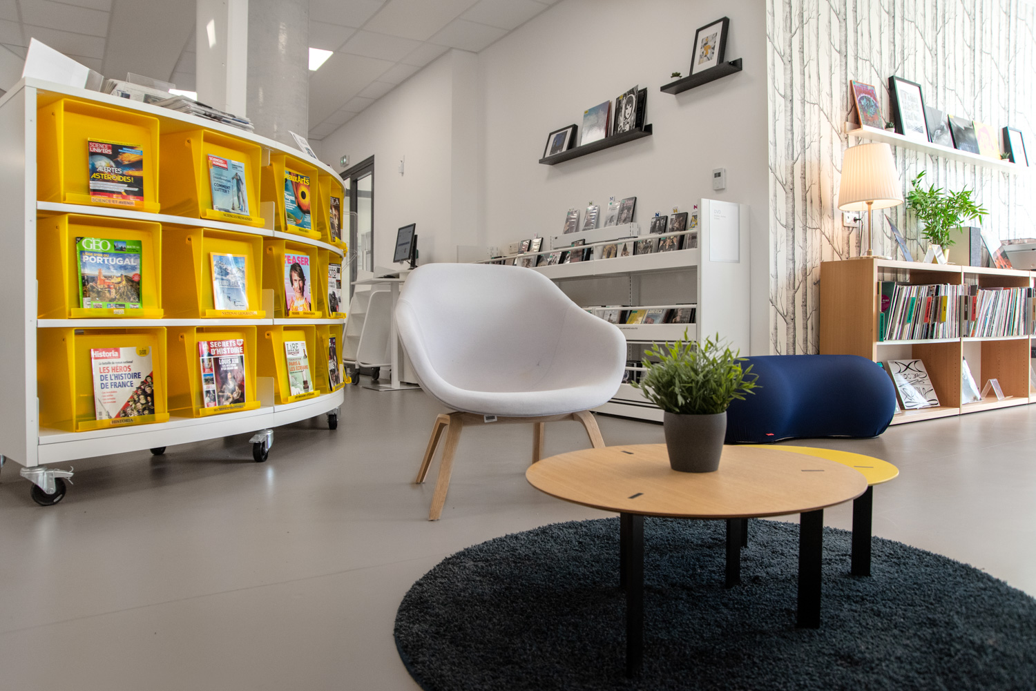 Le travail mené avec BC Intérieur pour toute la conception de l’aménagement intérieur, le choix de mobiliers parmi un large catalogue a donné naissance à une médiathèque à taille humaine, joyeuse et modulable avec des espaces visuellement cohérents et pourtant bien différenciés ! Ce travail fructueux amène un public nombreux à investir ce lieu de vie culturel en venant écouter un disque dans de larges chauffeuses, lire des histoires ou des BD sur de confortables poufs, travailler en groupe au cœur des espaces, etc.