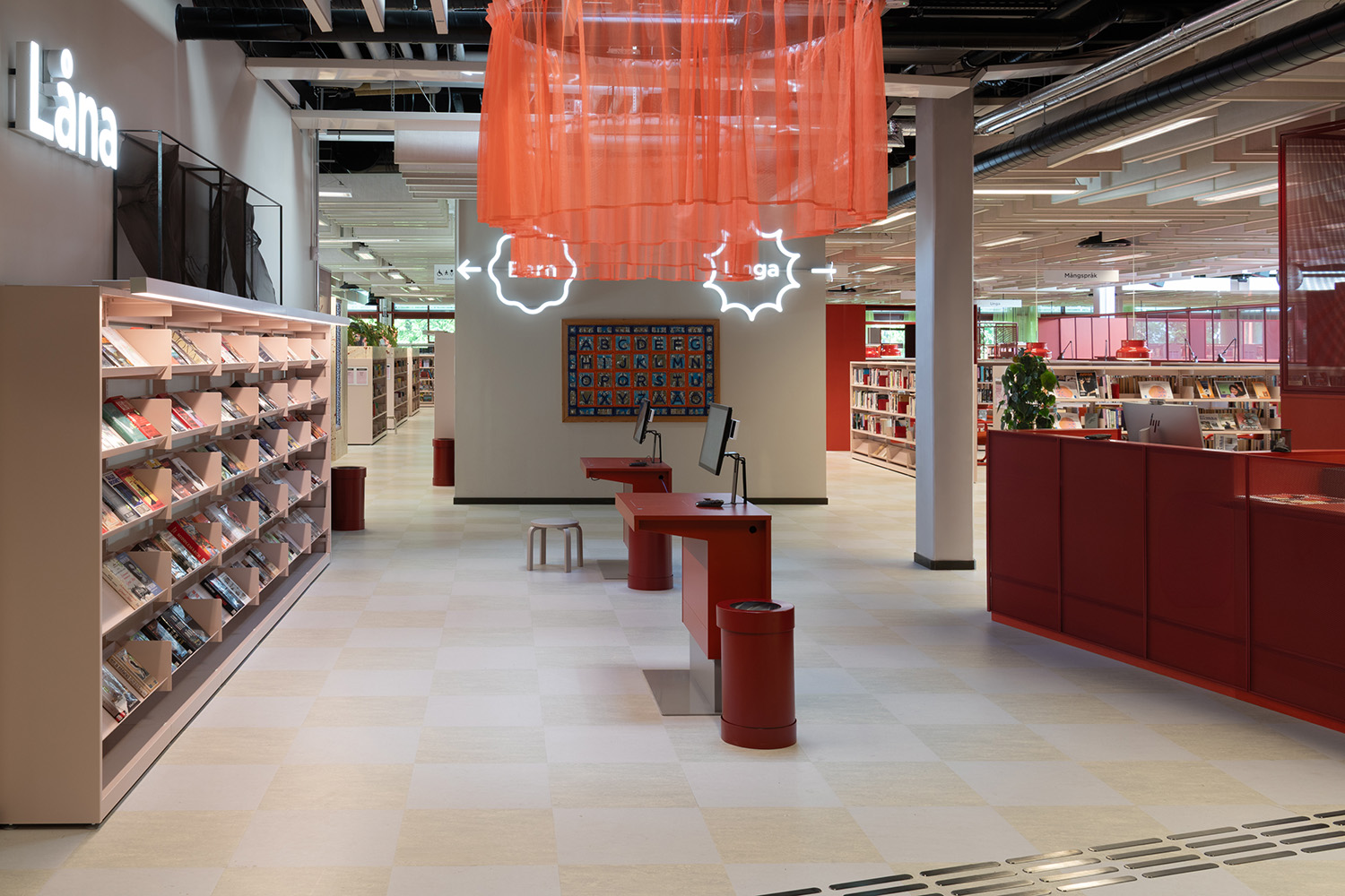 Du fait de son implantation en rez-de-jardin, les contraintes architecturales étaient nombreuses (luminosité naturelle limitée, nombreux poteaux porteurs, etc.) et nécessitaient de porter un soin tout particulier à son aménagement intérieur. Le travail d’implantation et de choix des mobiliers devait structurer les différents espaces et développer une atmosphère chaleureuse. La modularité et la proposition de meubles évolutifs et adaptés aux différents usages et besoins des publics étaient également au cœur de la réflexion.