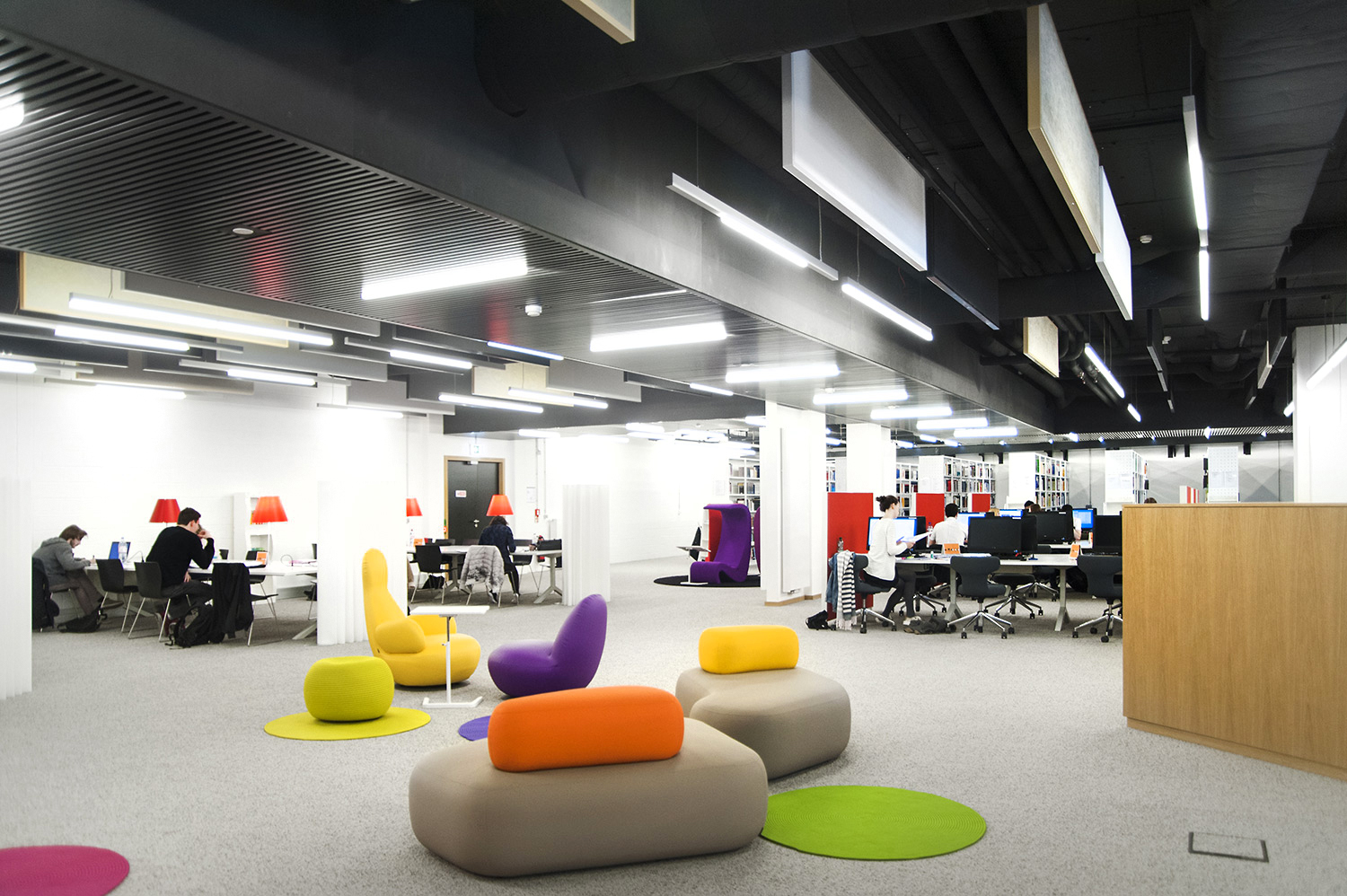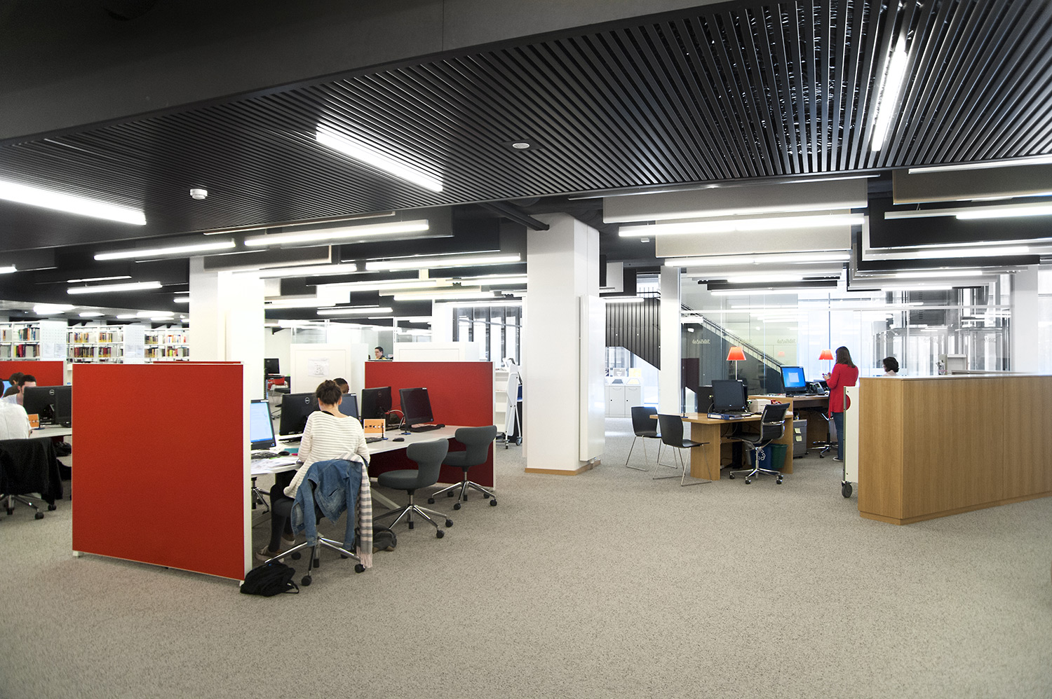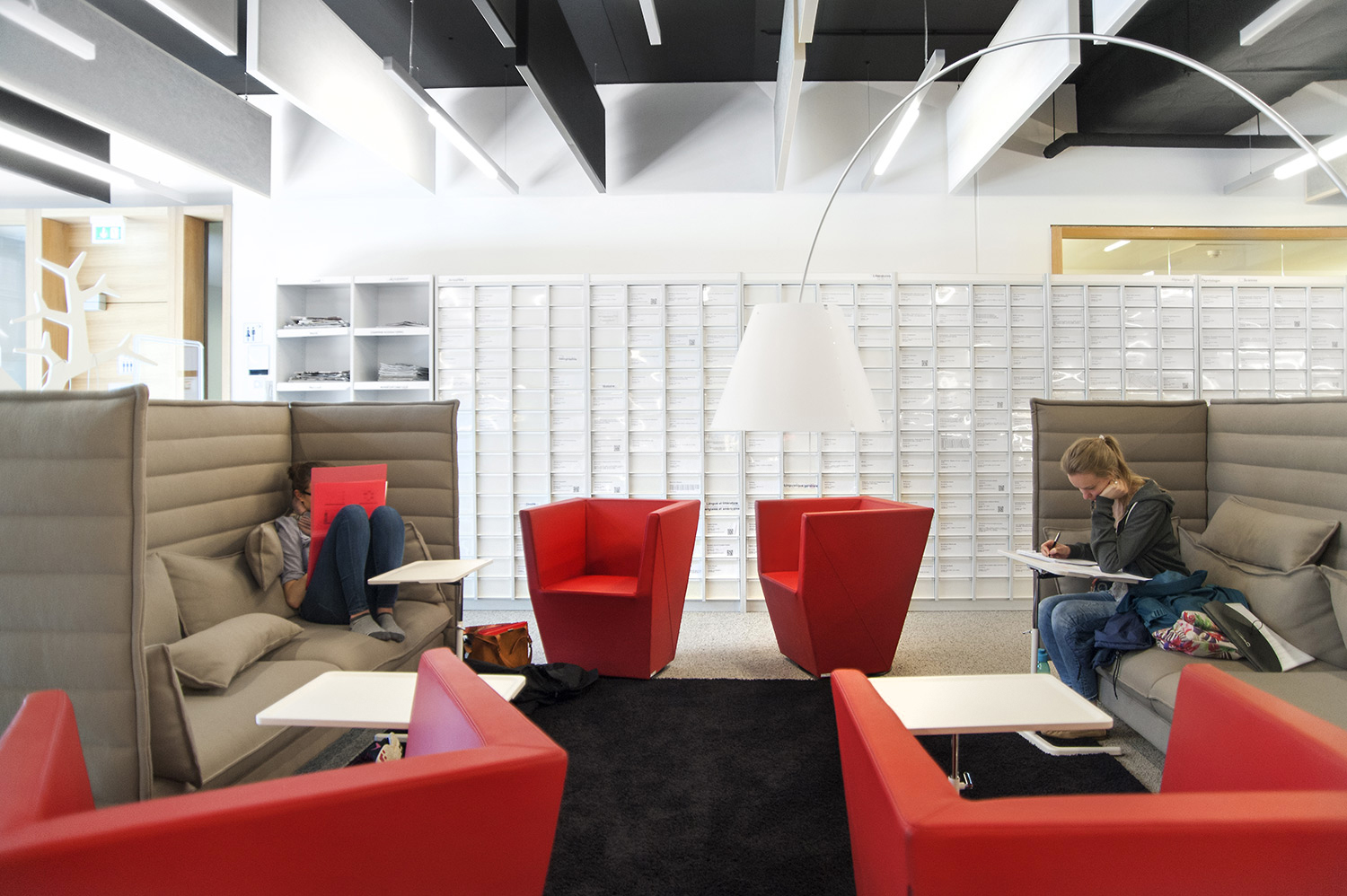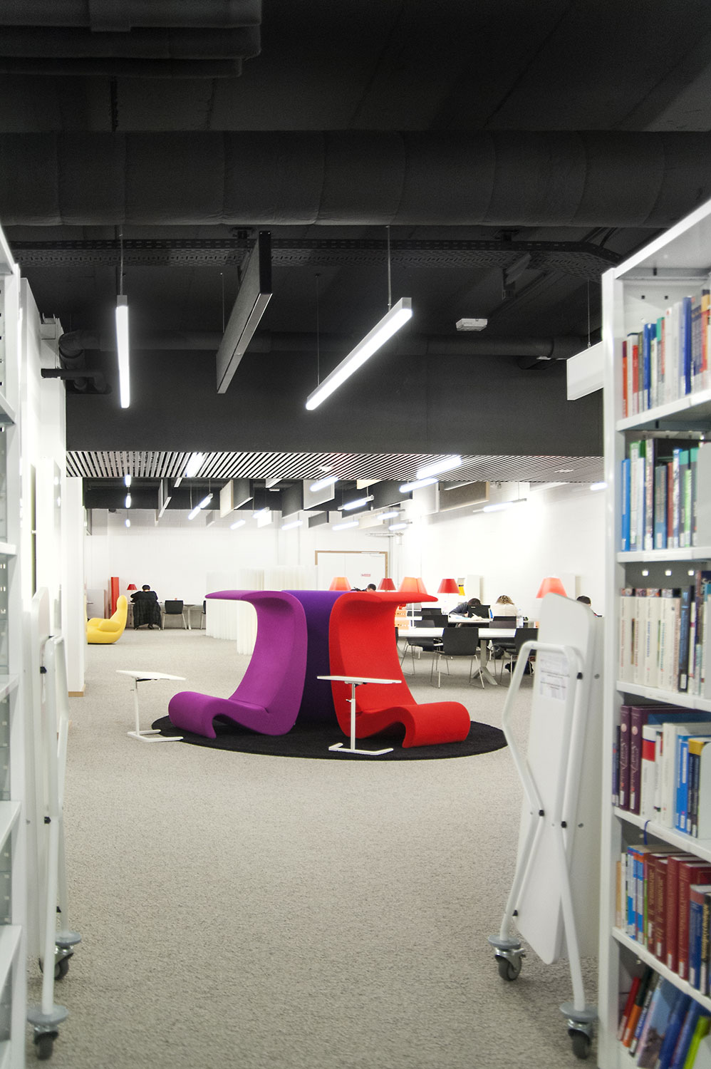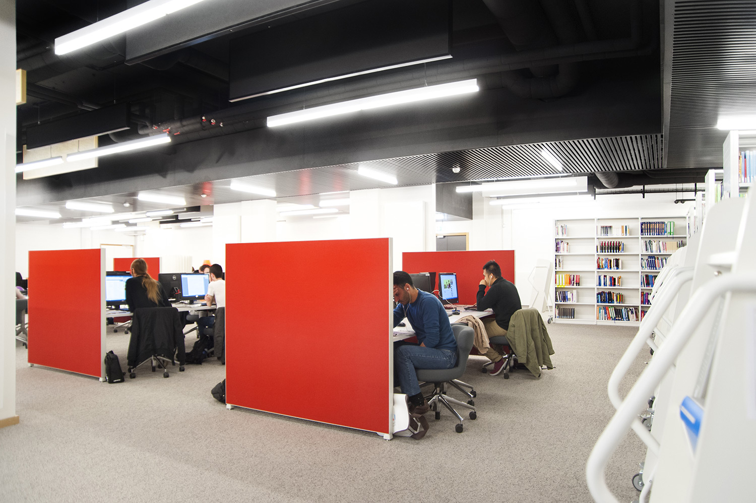 L’accent a été placé sur le confort, l’espace de travail et la prestation de service. Les espaces de travail et de lecture contemporains occupent près des trois quarts de la bibliothèque. Derrière la banque d’accueil centrale, le personnel se tient à la disposition des étudiants. La collection de livres est mise en valeur dans des rayonnages blancs flambant neufs. L’important taux de fréquentation de cette bibliothèque témoigne du réel succès de ce type d’aménagement.