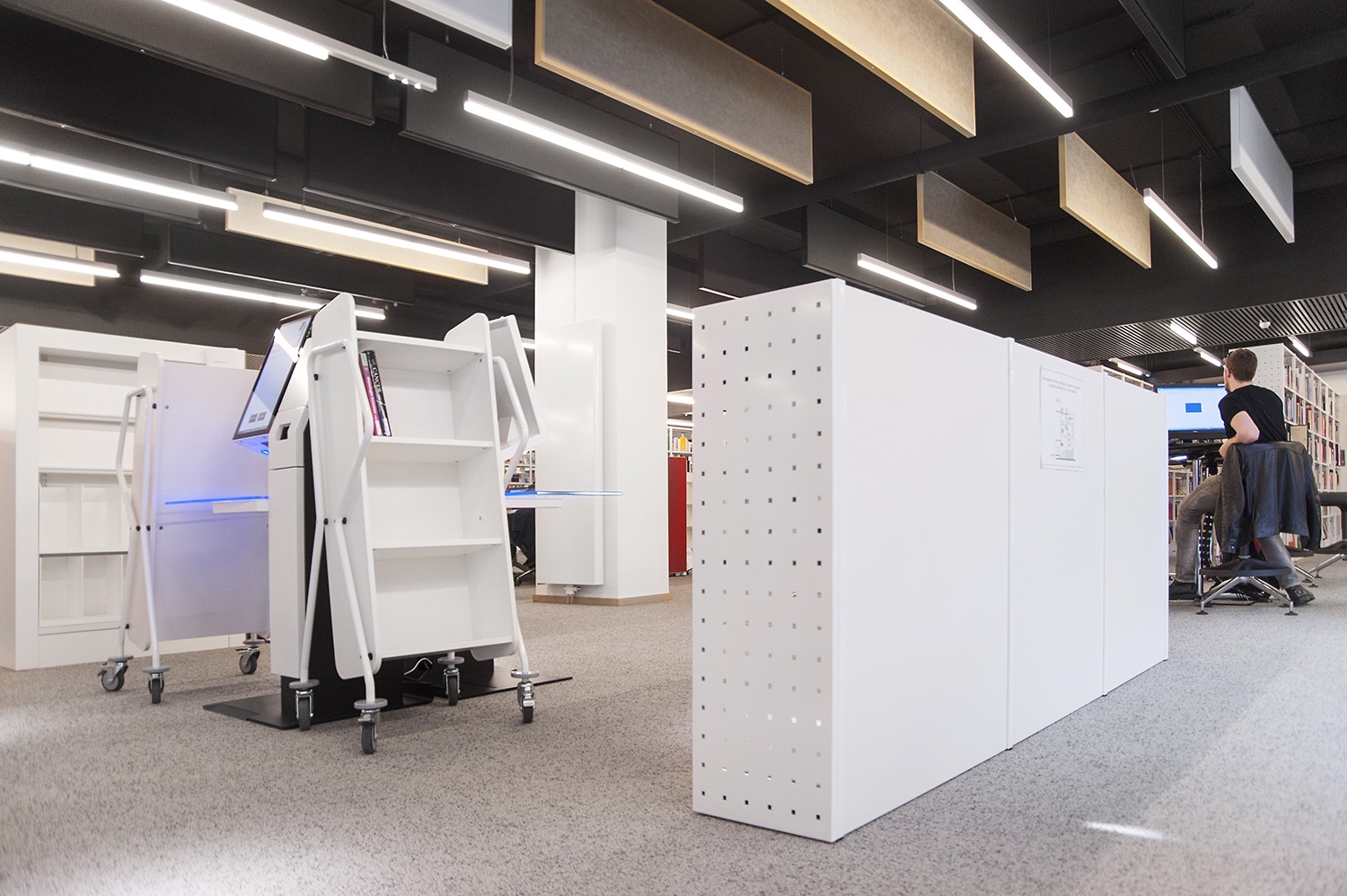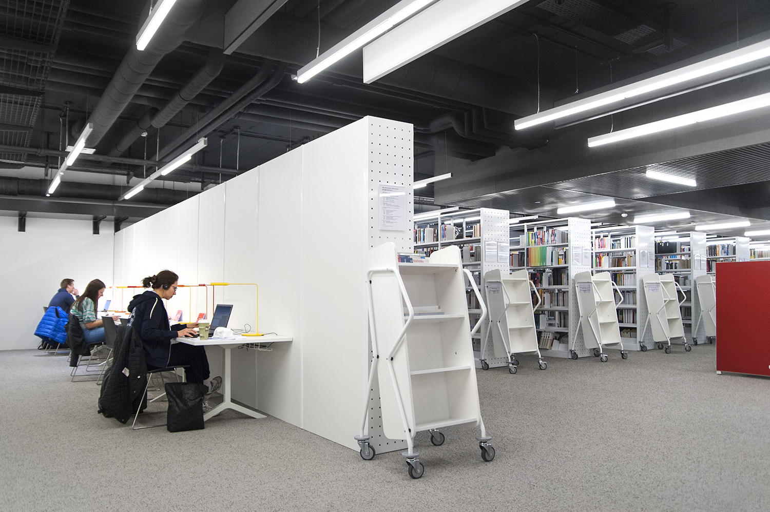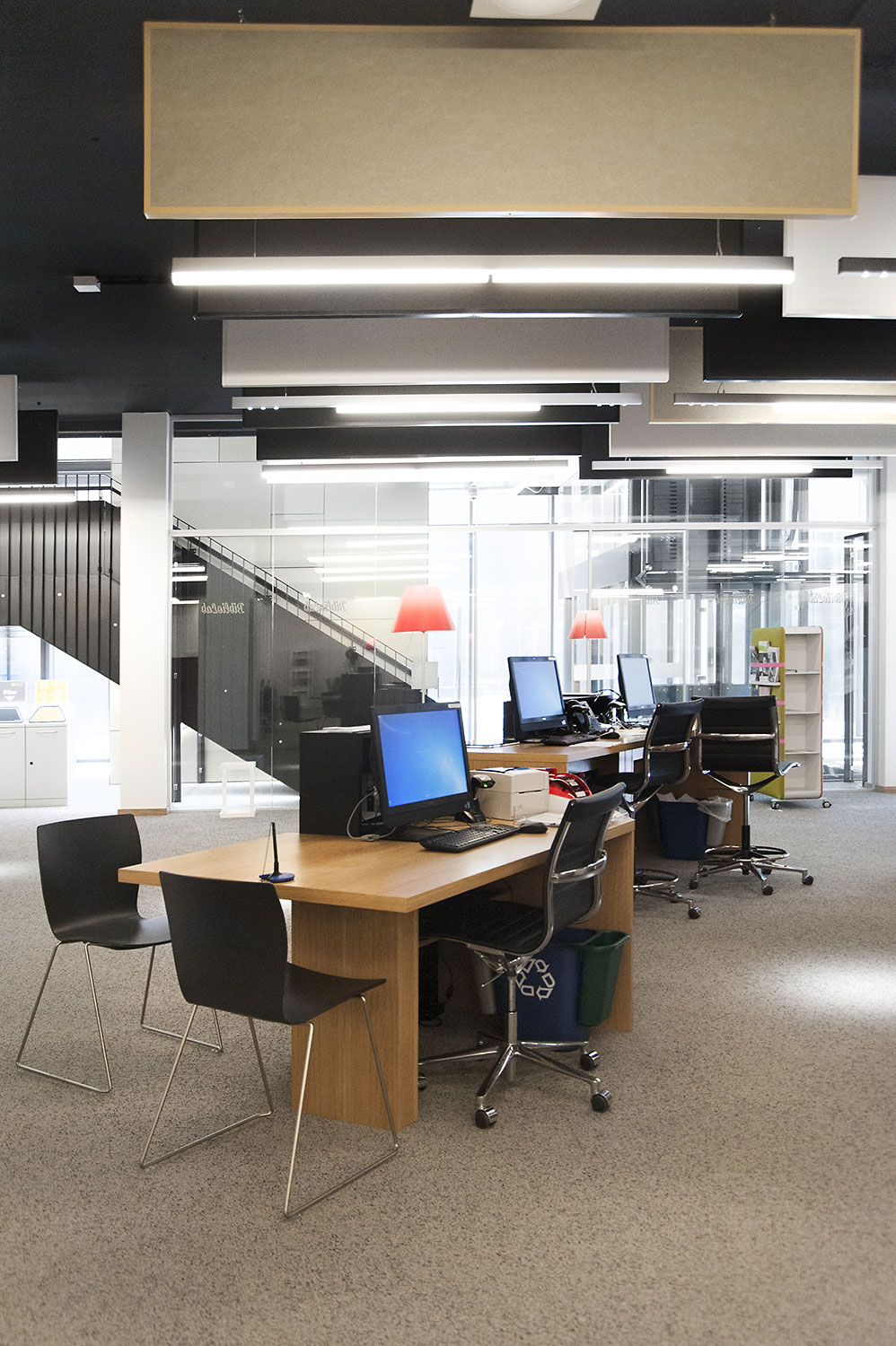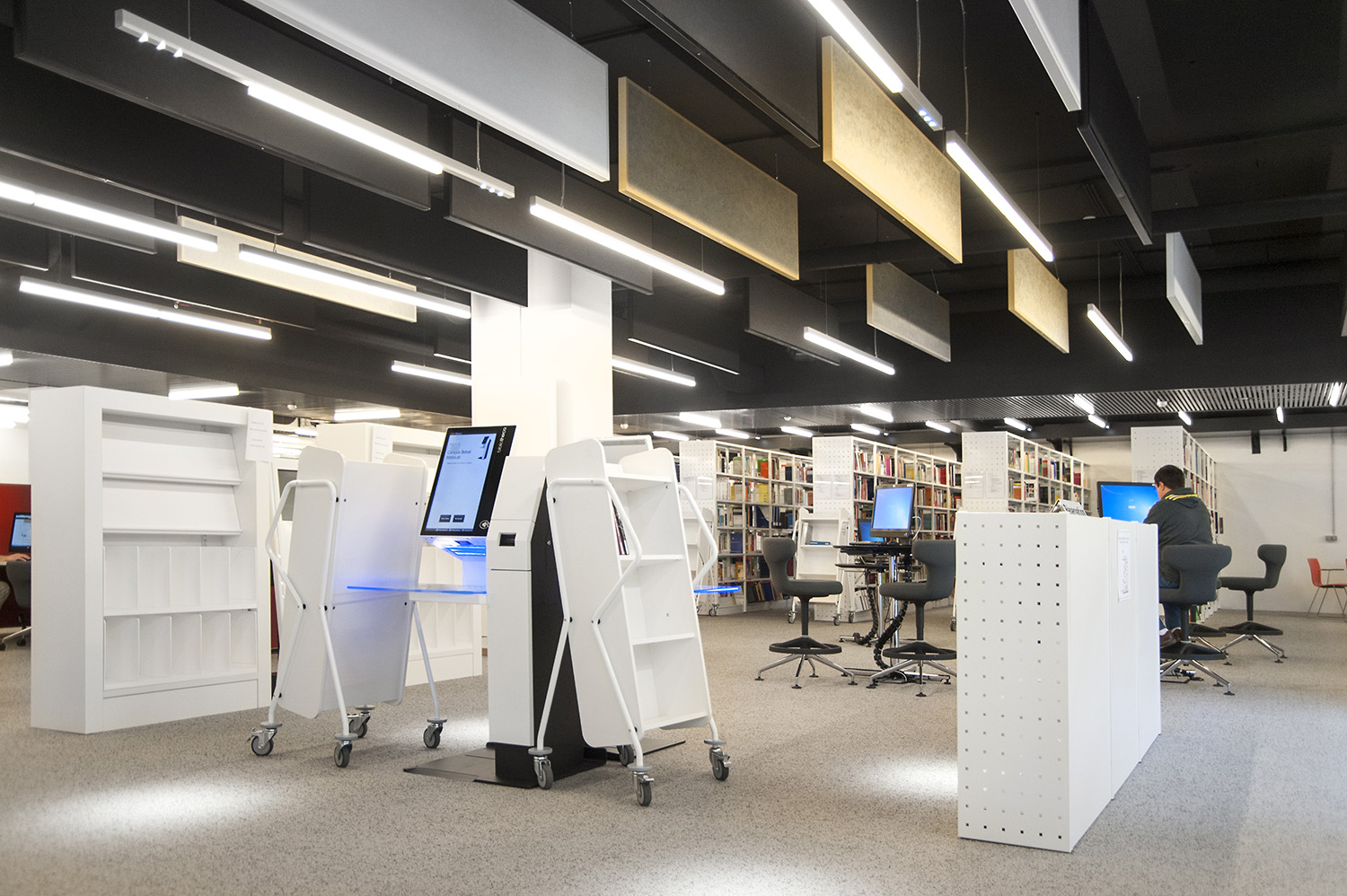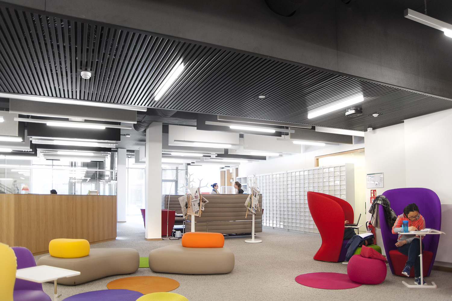 L’accent a été placé sur le confort, l’espace de travail et la prestation de service. Les espaces de travail et de lecture contemporains occupent près des trois quarts de la bibliothèque. Derrière la banque d’accueil centrale, le personnel se tient à la disposition des étudiants. La collection de livres est mise en valeur dans des rayonnages blancs flambant neufs. L’important taux de fréquentation de cette bibliothèque témoigne du réel succès de ce type d’aménagement.