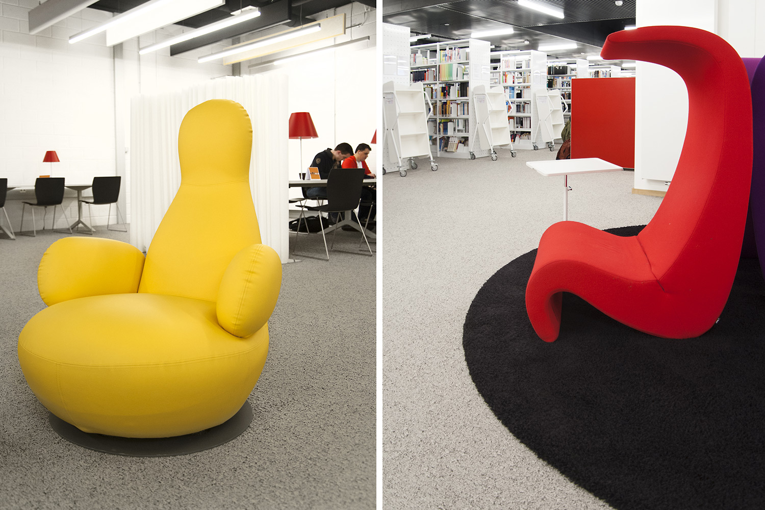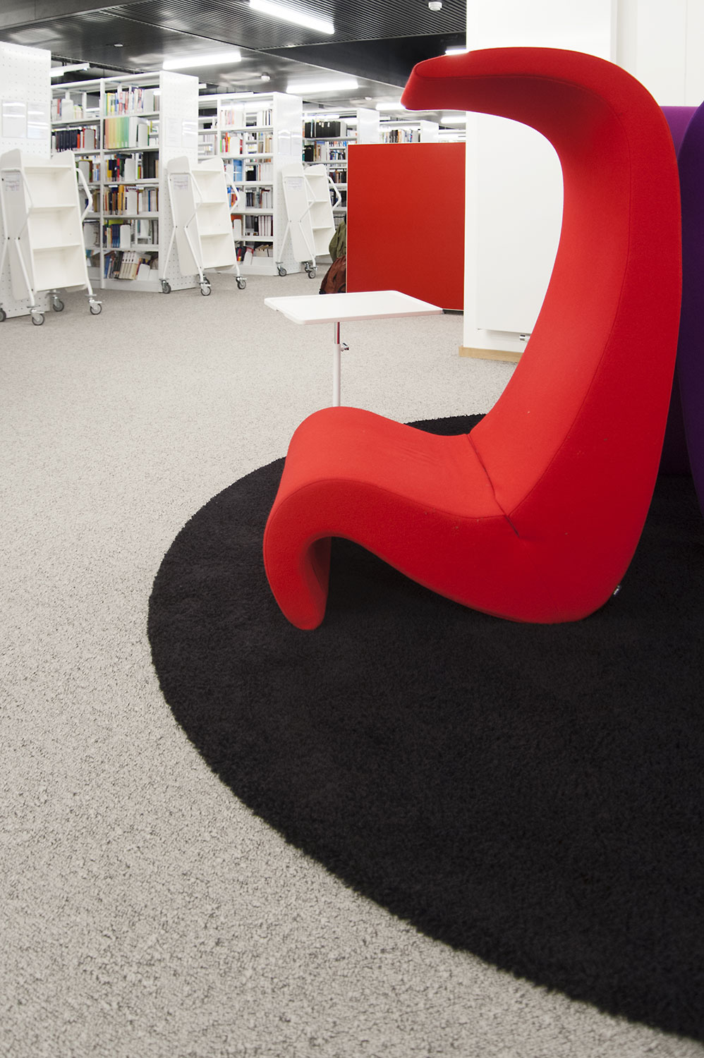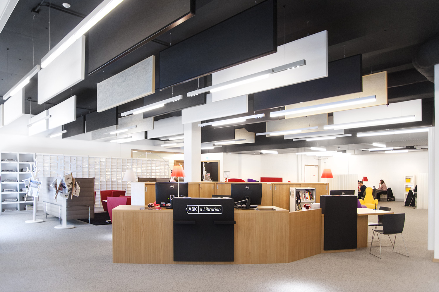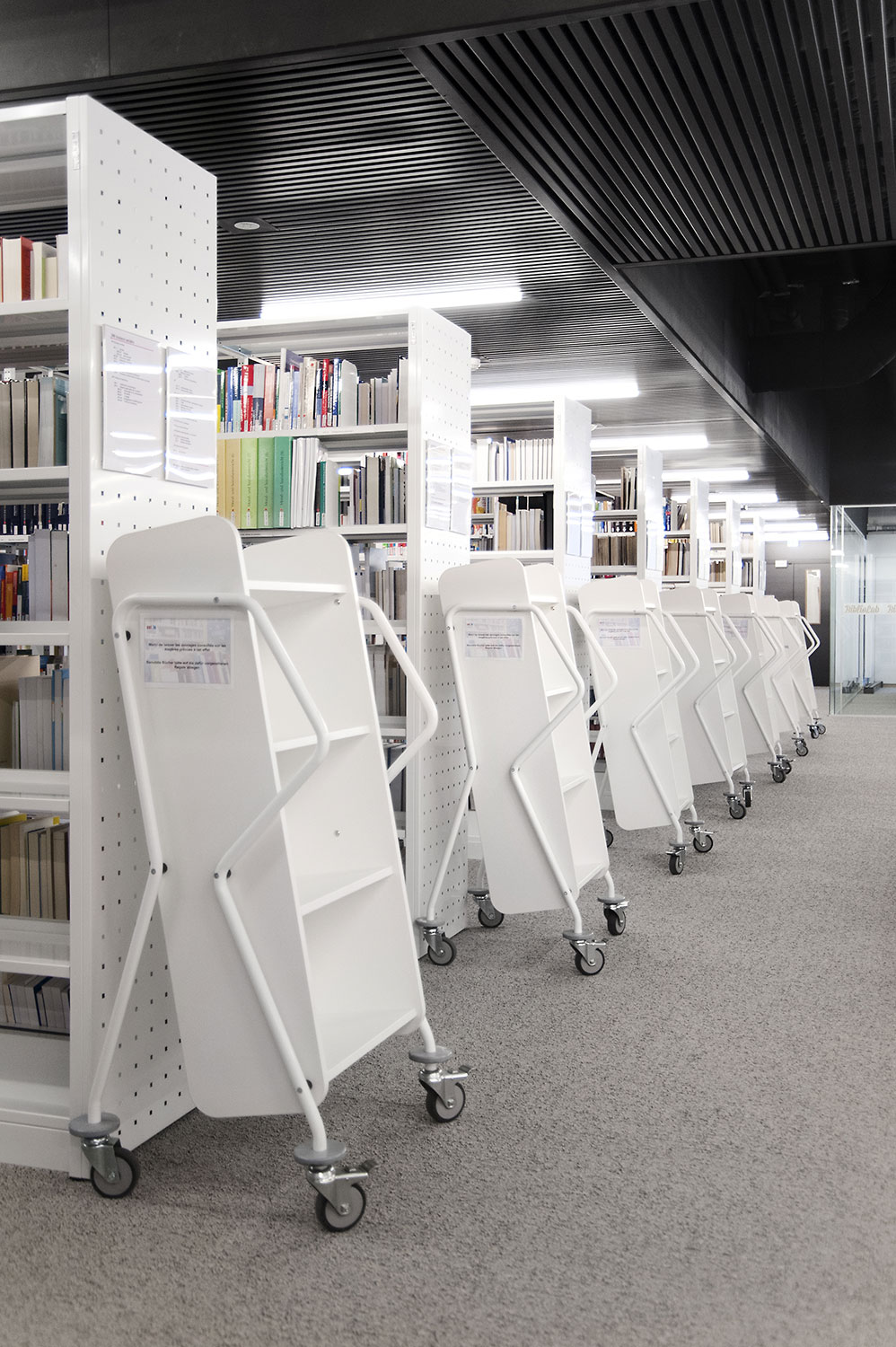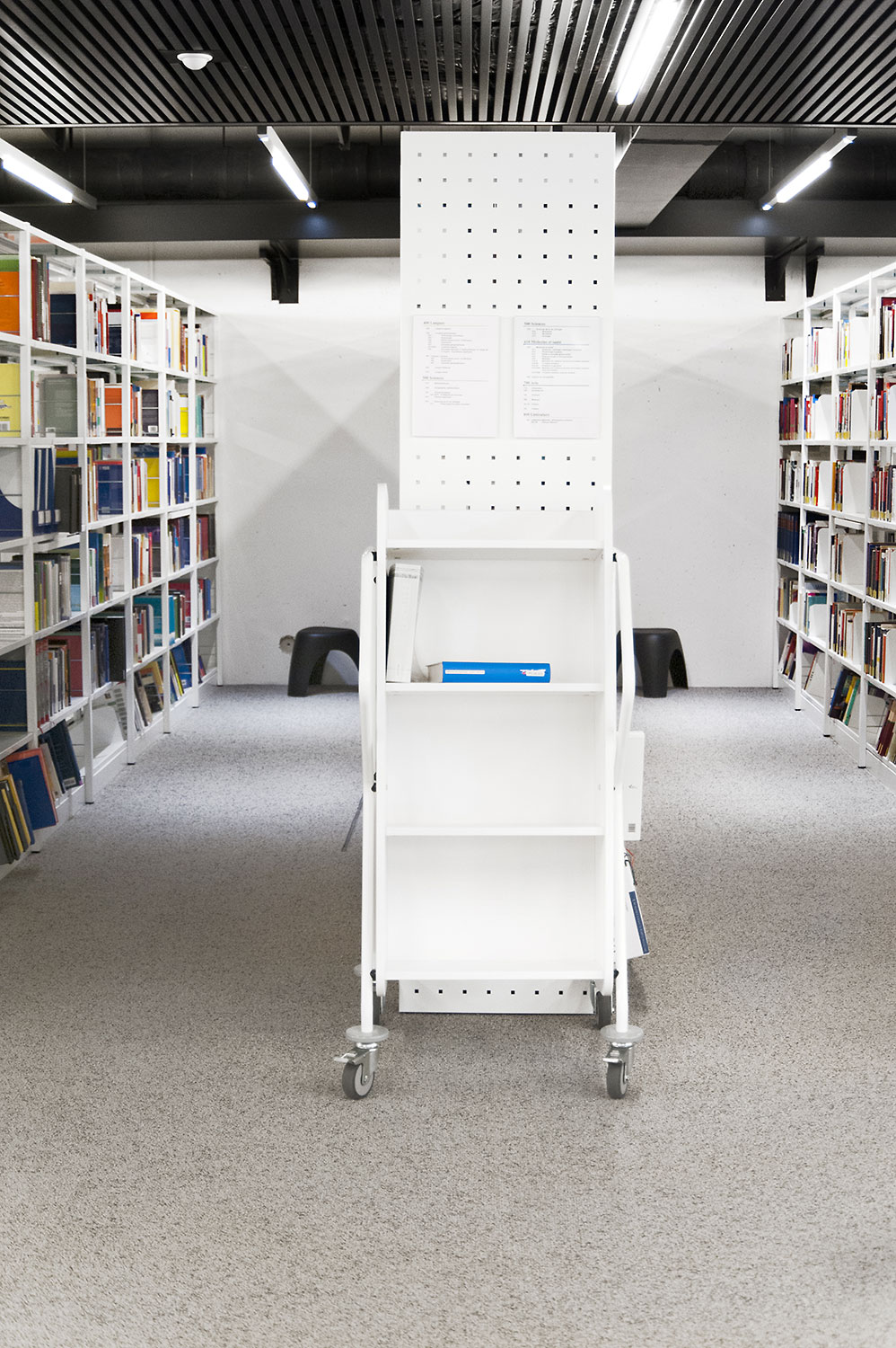 L’accent a été placé sur le confort, l’espace de travail et la prestation de service. Les espaces de travail et de lecture contemporains occupent près des trois quarts de la bibliothèque. Derrière la banque d’accueil centrale, le personnel se tient à la disposition des étudiants. La collection de livres est mise en valeur dans des rayonnages blancs flambant neufs. L’important taux de fréquentation de cette bibliothèque témoigne du réel succès de ce type d’aménagement.