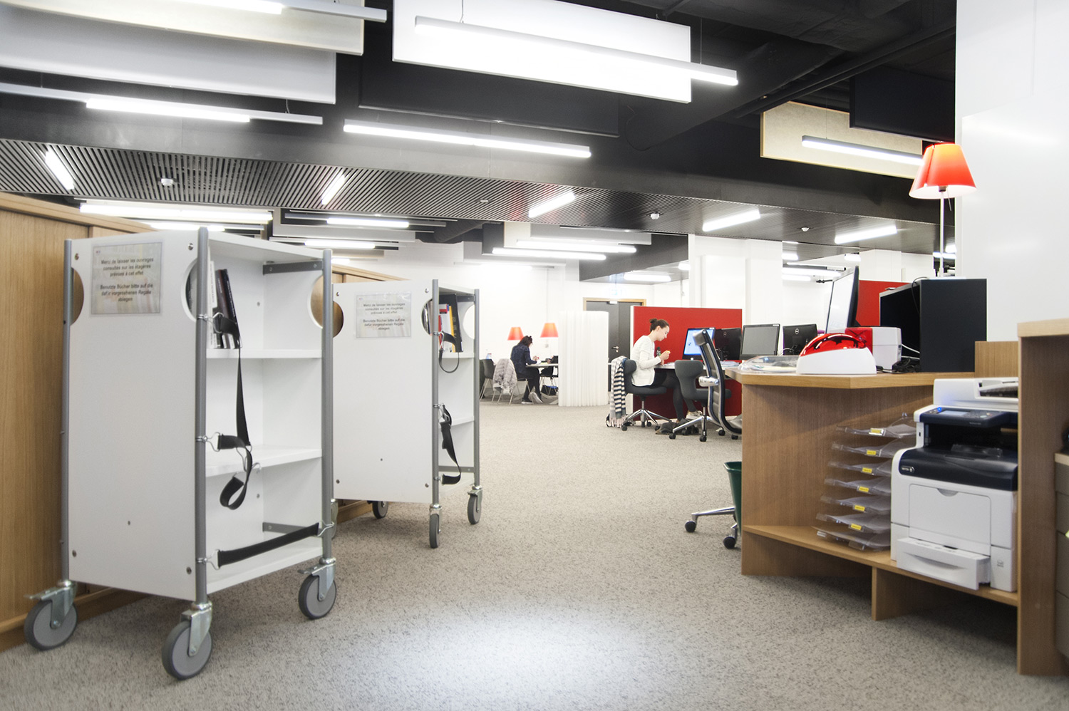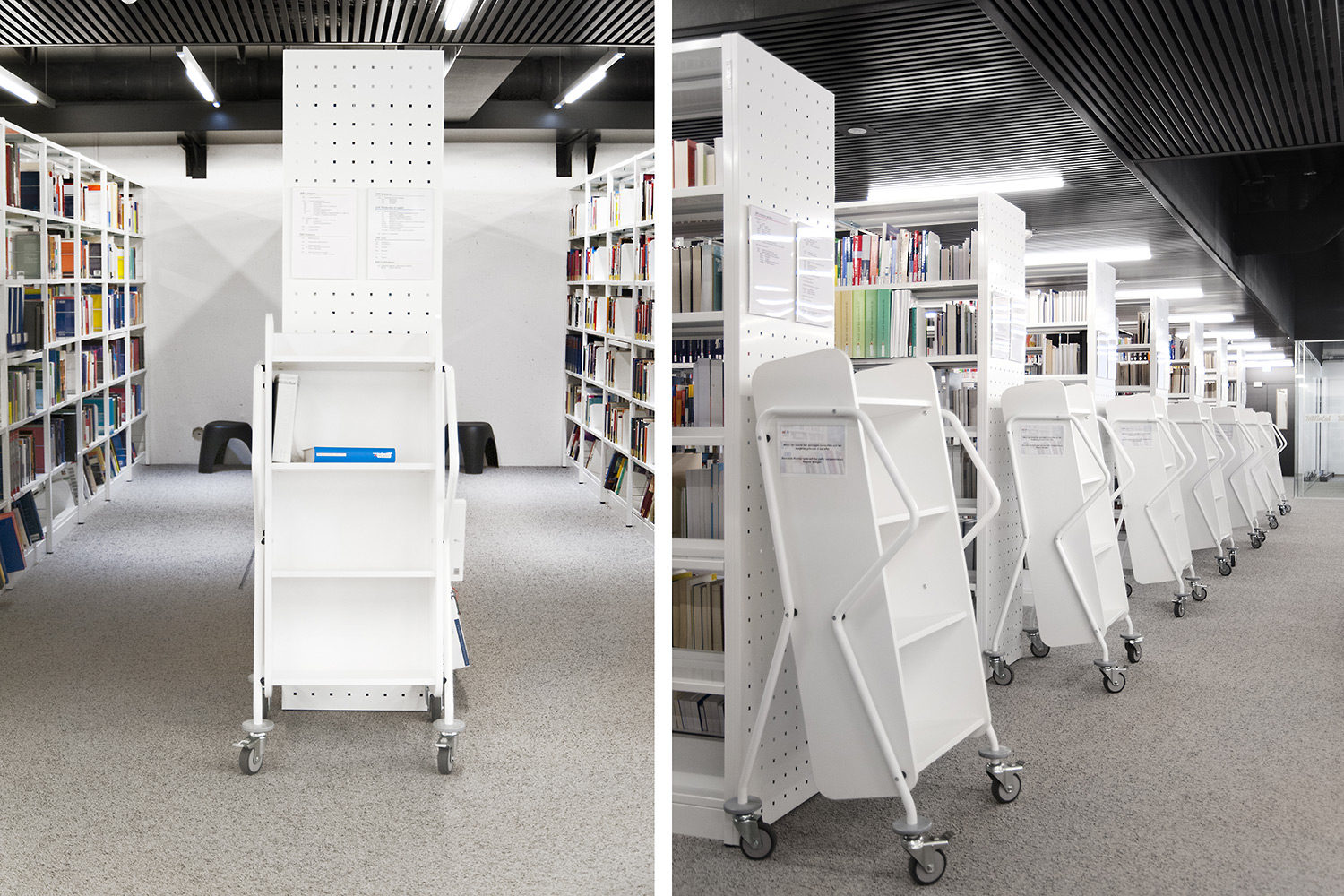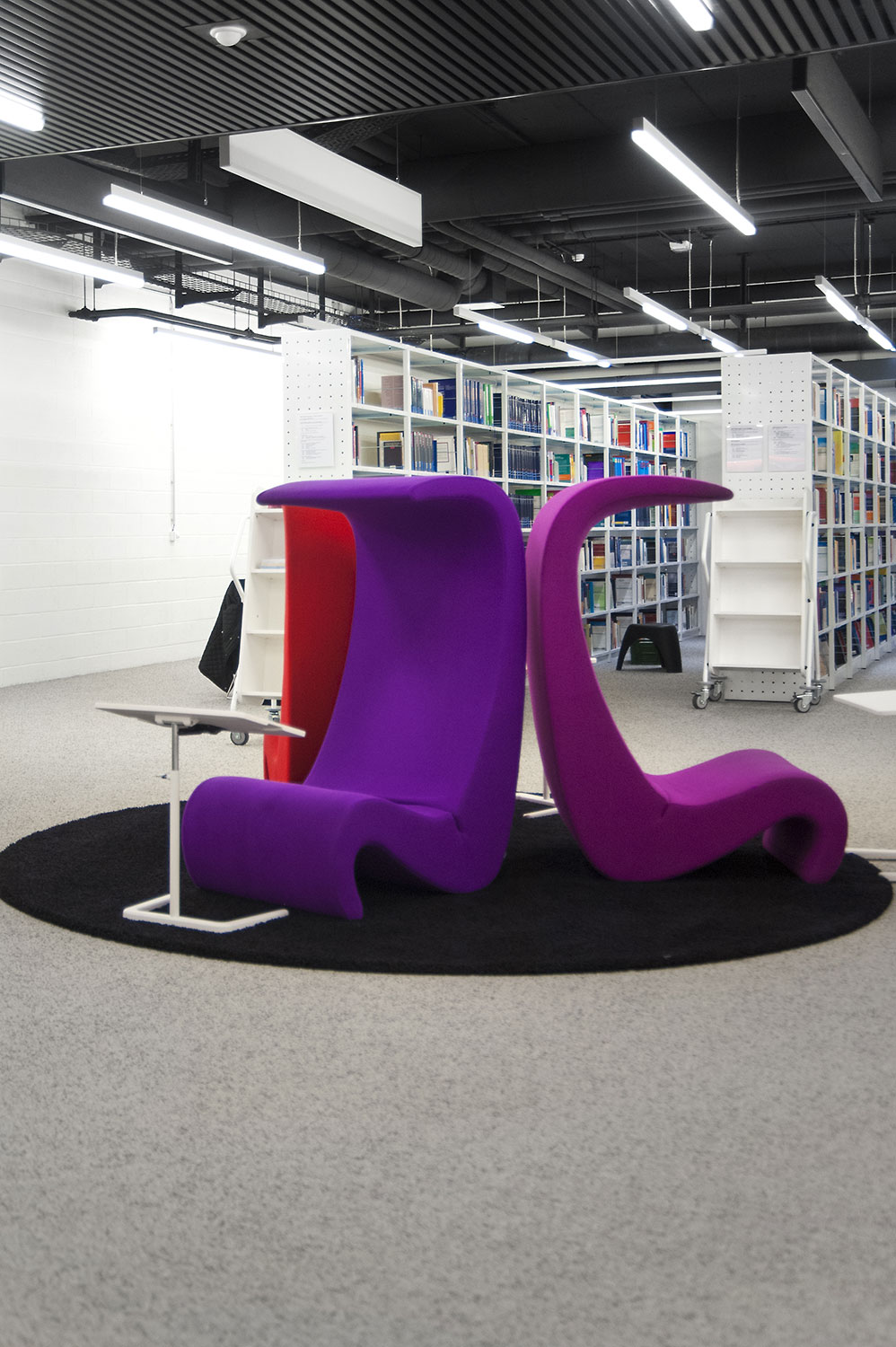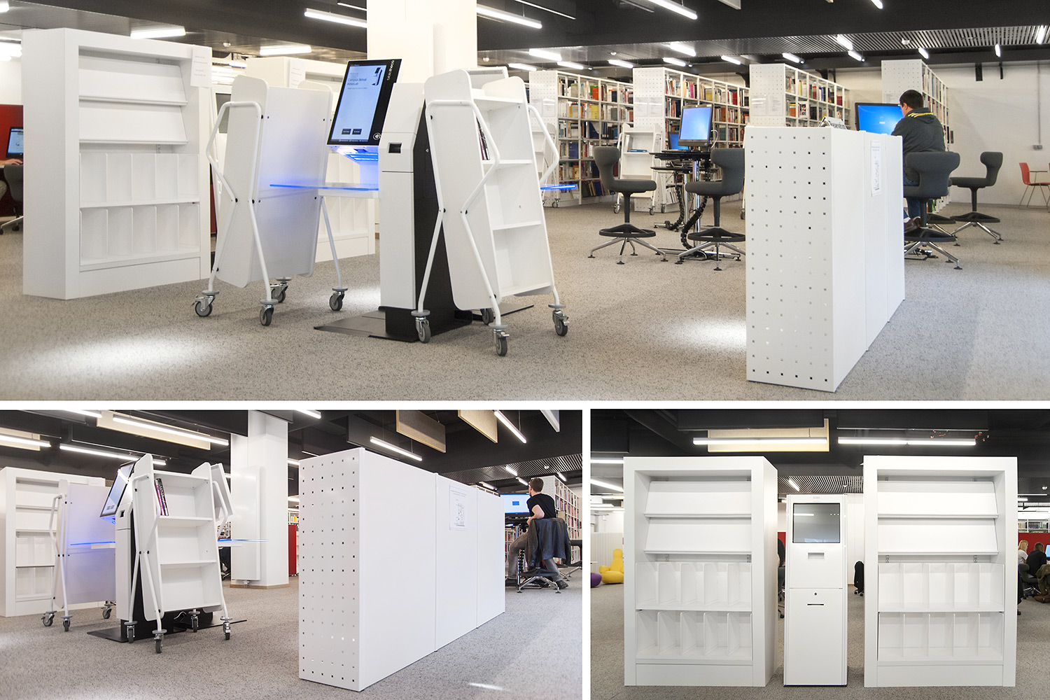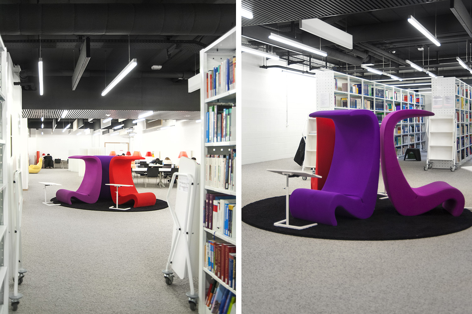 L’accent a été placé sur le confort, l’espace de travail et la prestation de service. Les espaces de travail et de lecture contemporains occupent près des trois quarts de la bibliothèque. Derrière la banque d’accueil centrale, le personnel se tient à la disposition des étudiants. La collection de livres est mise en valeur dans des rayonnages blancs flambant neufs. L’important taux de fréquentation de cette bibliothèque témoigne du réel succès de ce type d’aménagement.