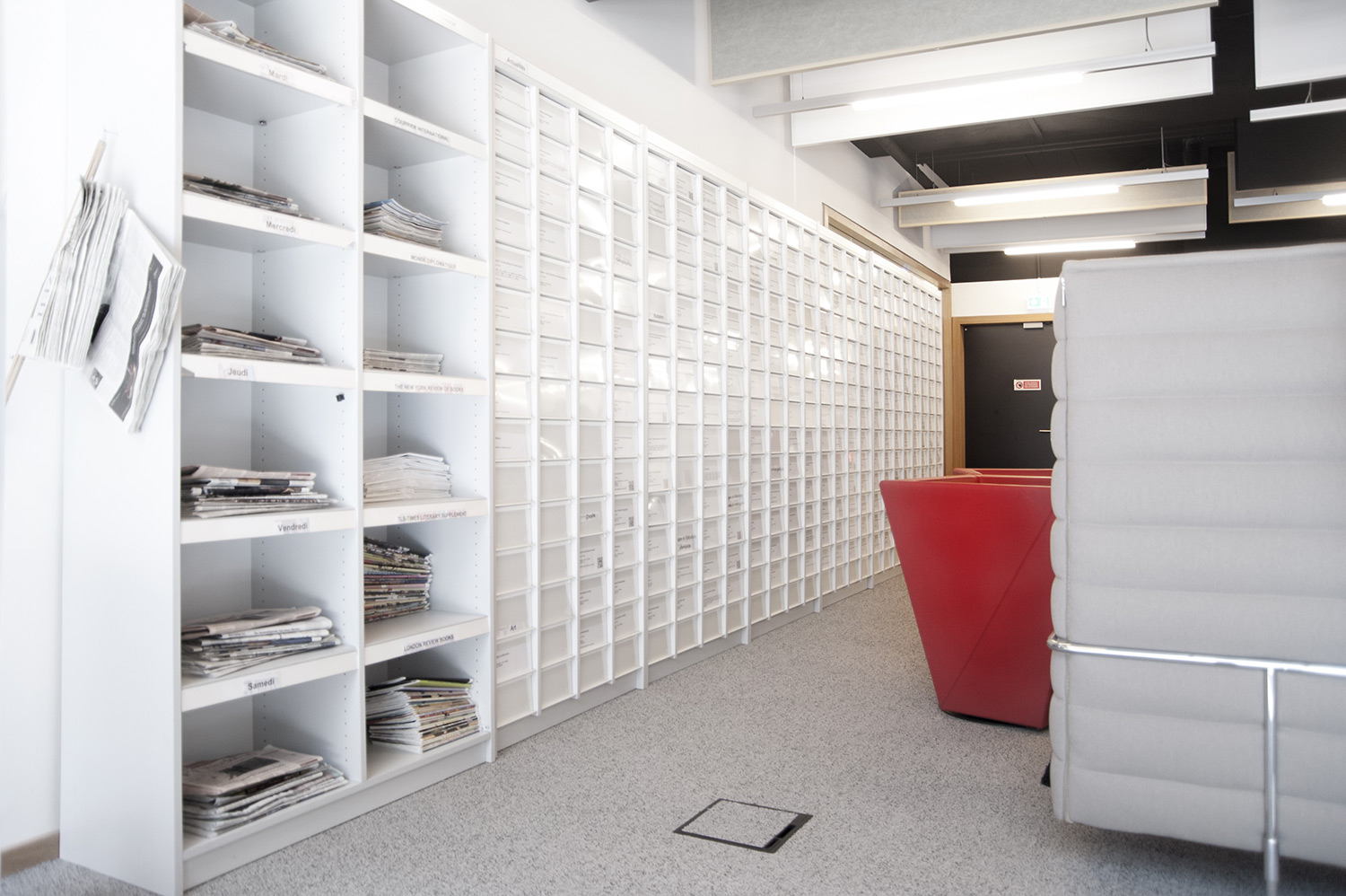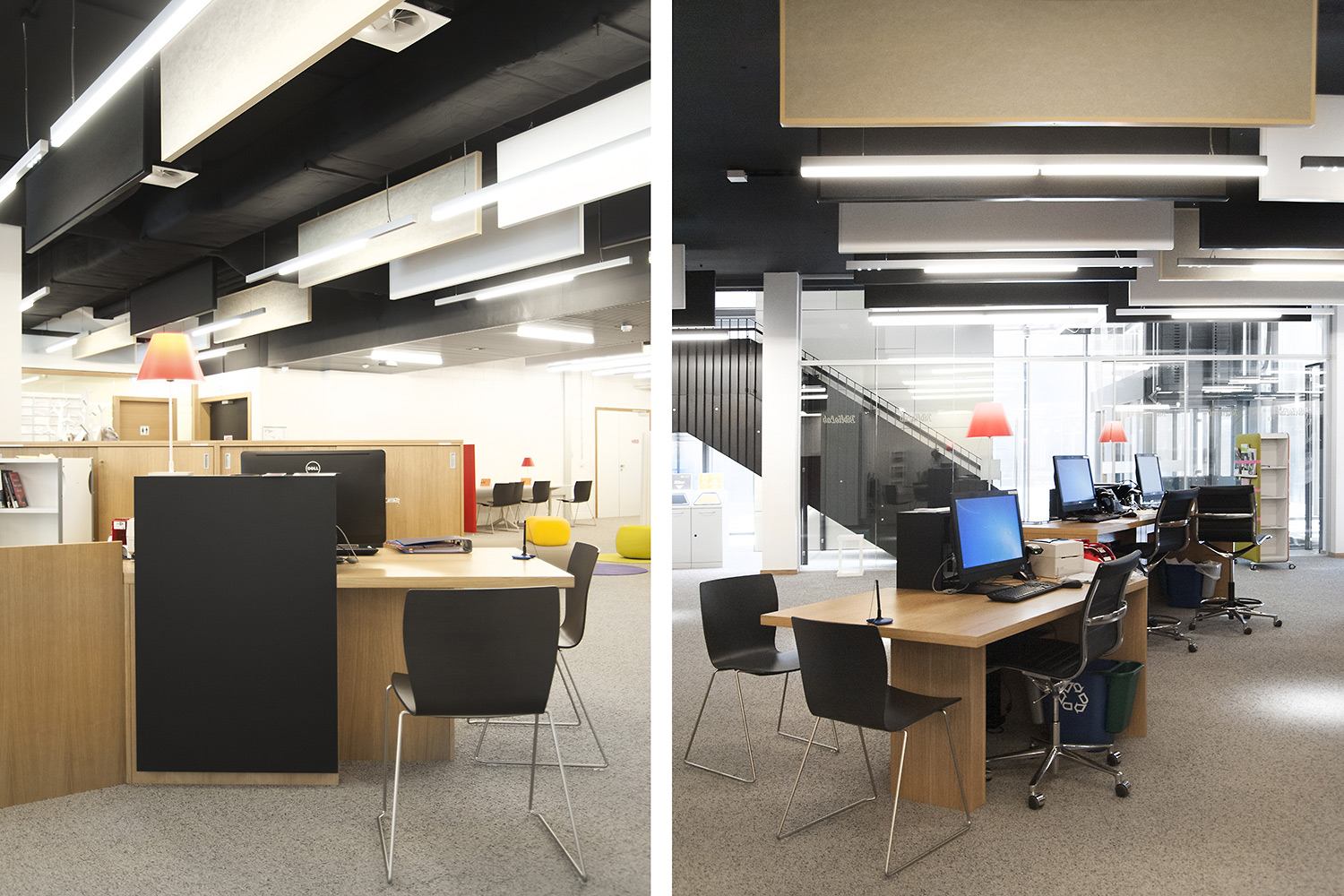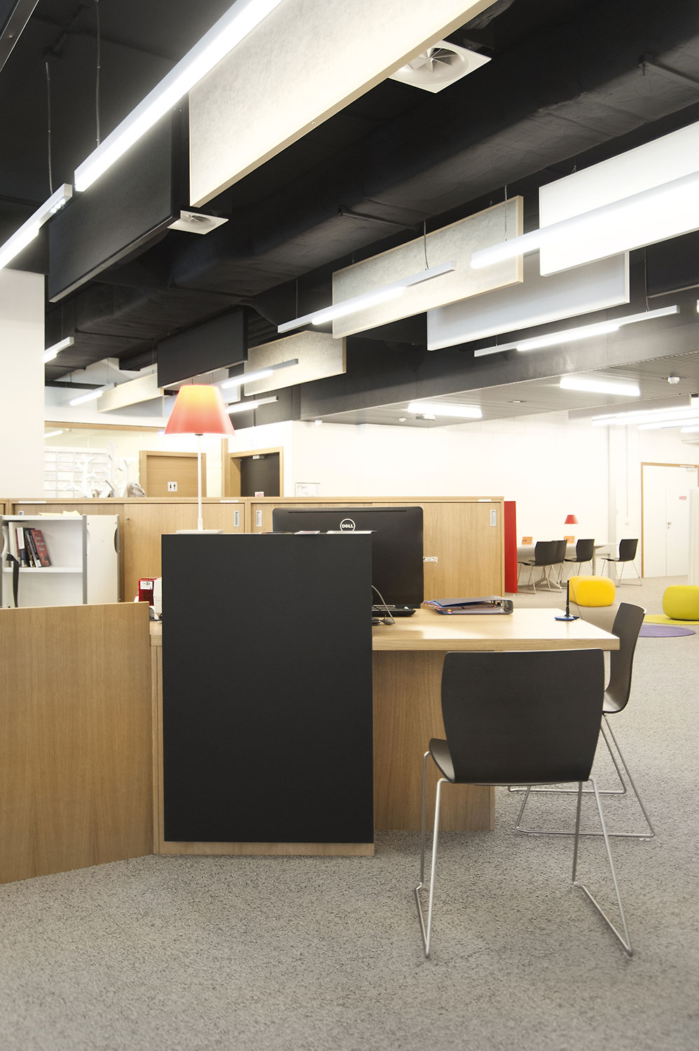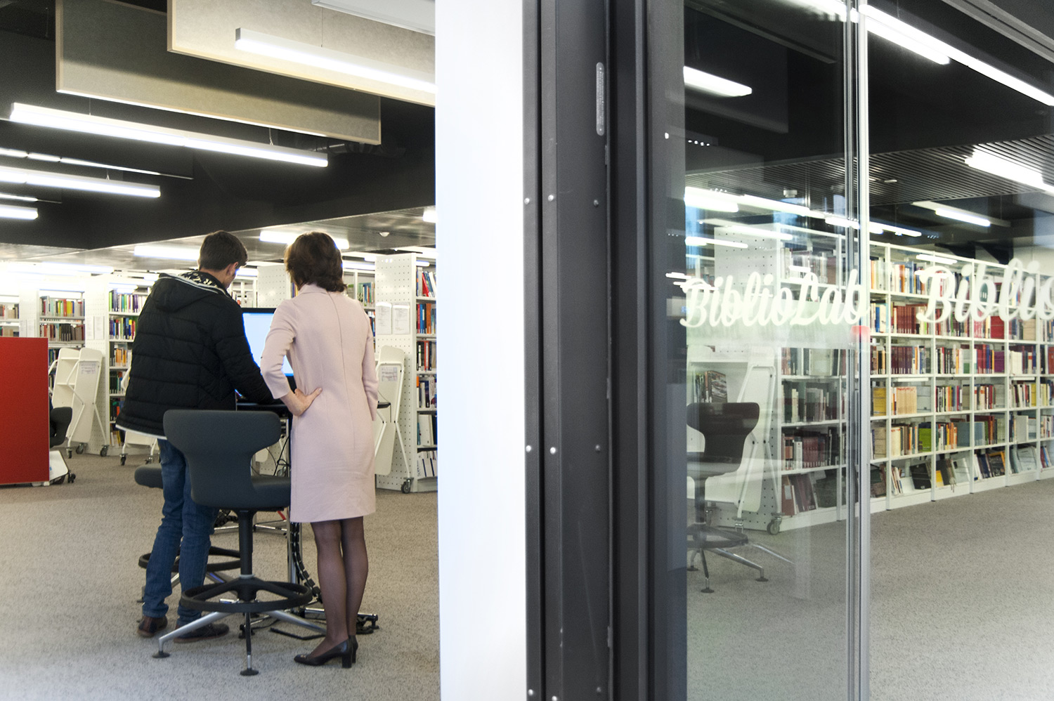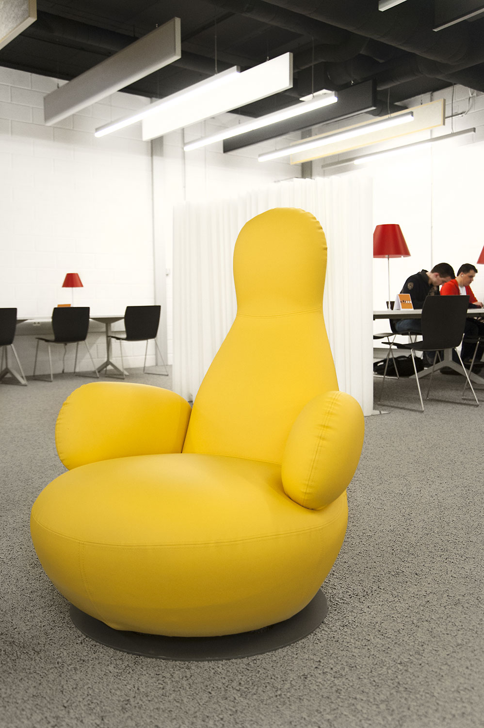 L’accent a été placé sur le confort, l’espace de travail et la prestation de service. Les espaces de travail et de lecture contemporains occupent près des trois quarts de la bibliothèque. Derrière la banque d’accueil centrale, le personnel se tient à la disposition des étudiants. La collection de livres est mise en valeur dans des rayonnages blancs flambant neufs. L’important taux de fréquentation de cette bibliothèque témoigne du réel succès de ce type d’aménagement.