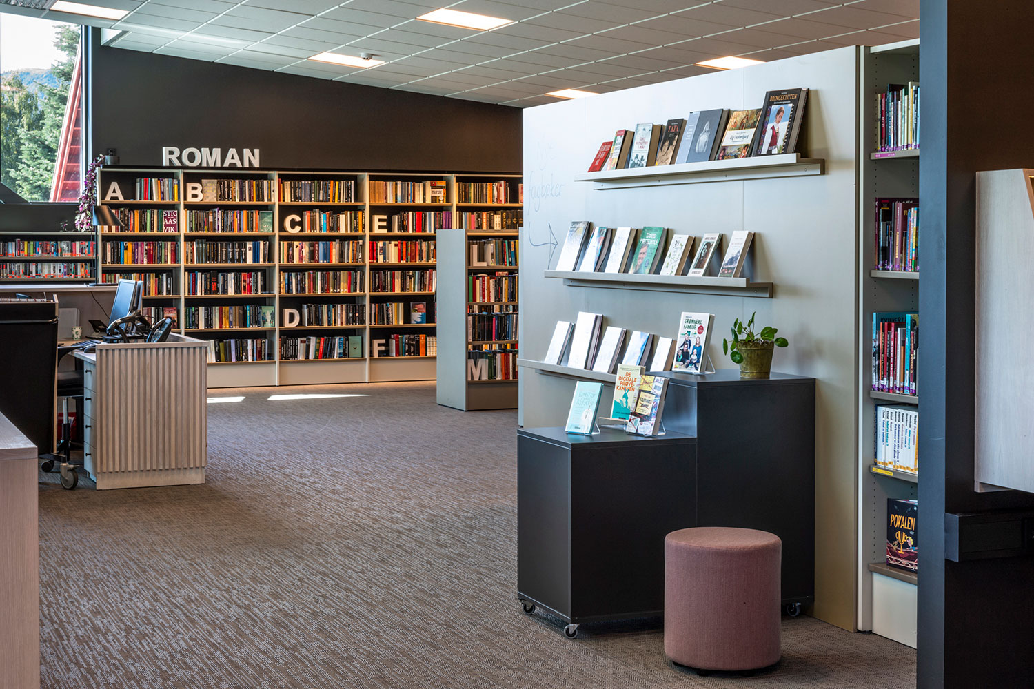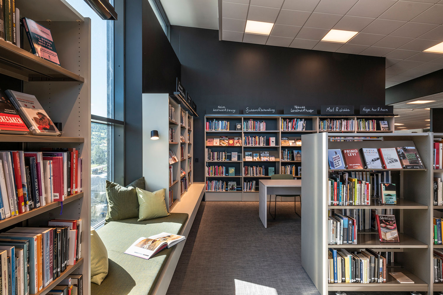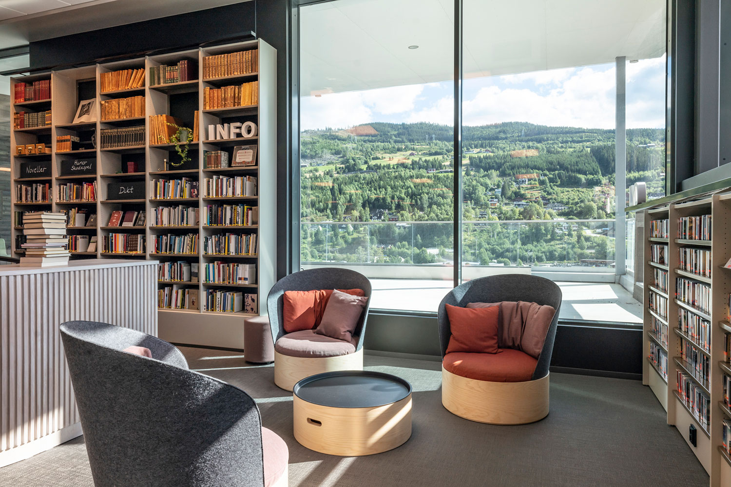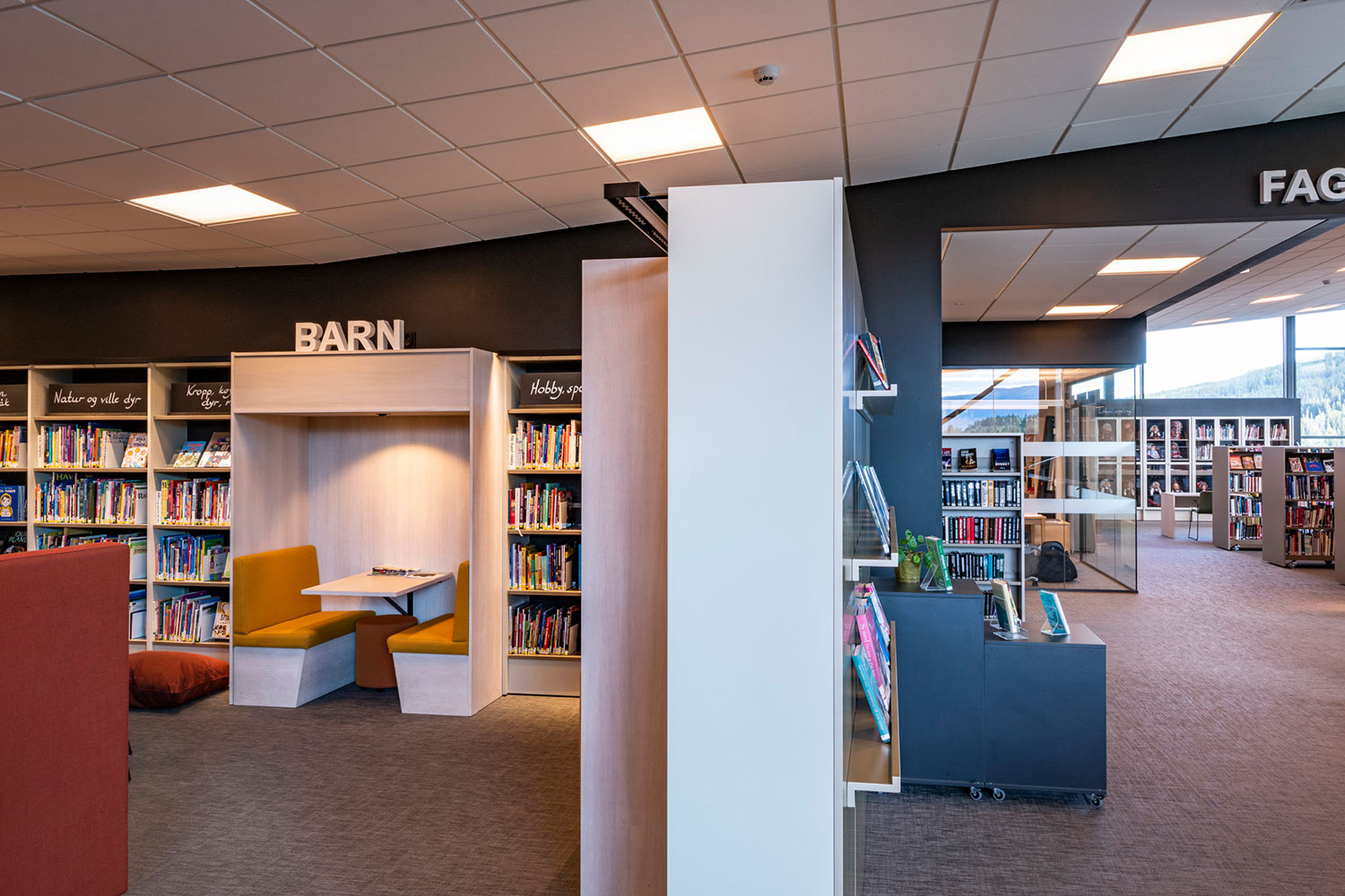 La bibliothèque de Ål a un emplacement exceptionnel au-dessus de la nouvelle extension de la maison de la culture. La conception de la bibliothèque met l’accent sur l’espace, la lumière et un ameublement adaptable et mobile. Une conception intérieure flexible permet aux locaux de s’adapter aux saisons, événements et activités, et les couleurs choisies sont inspirées par la tradition locale de peinture rosée.