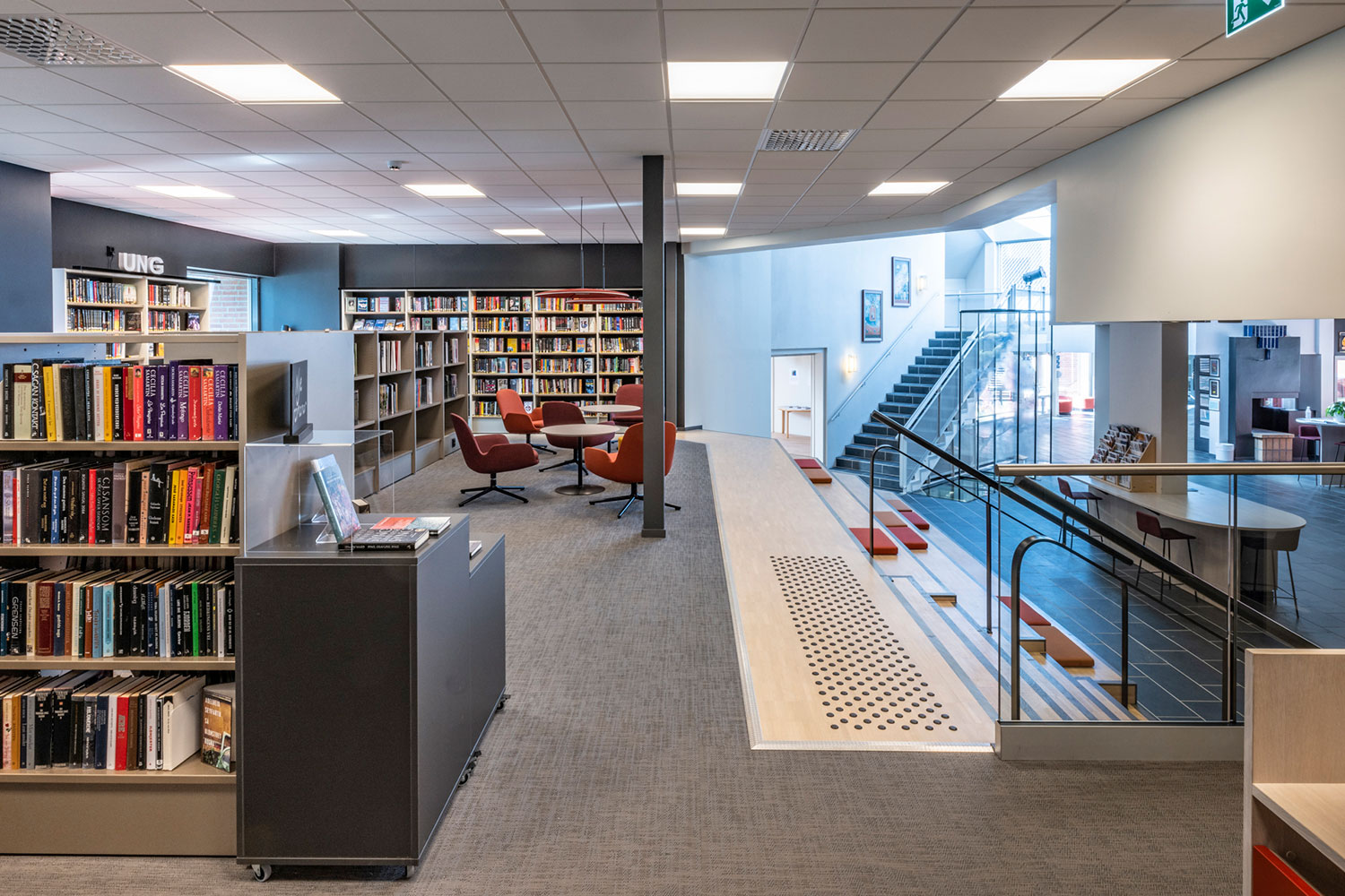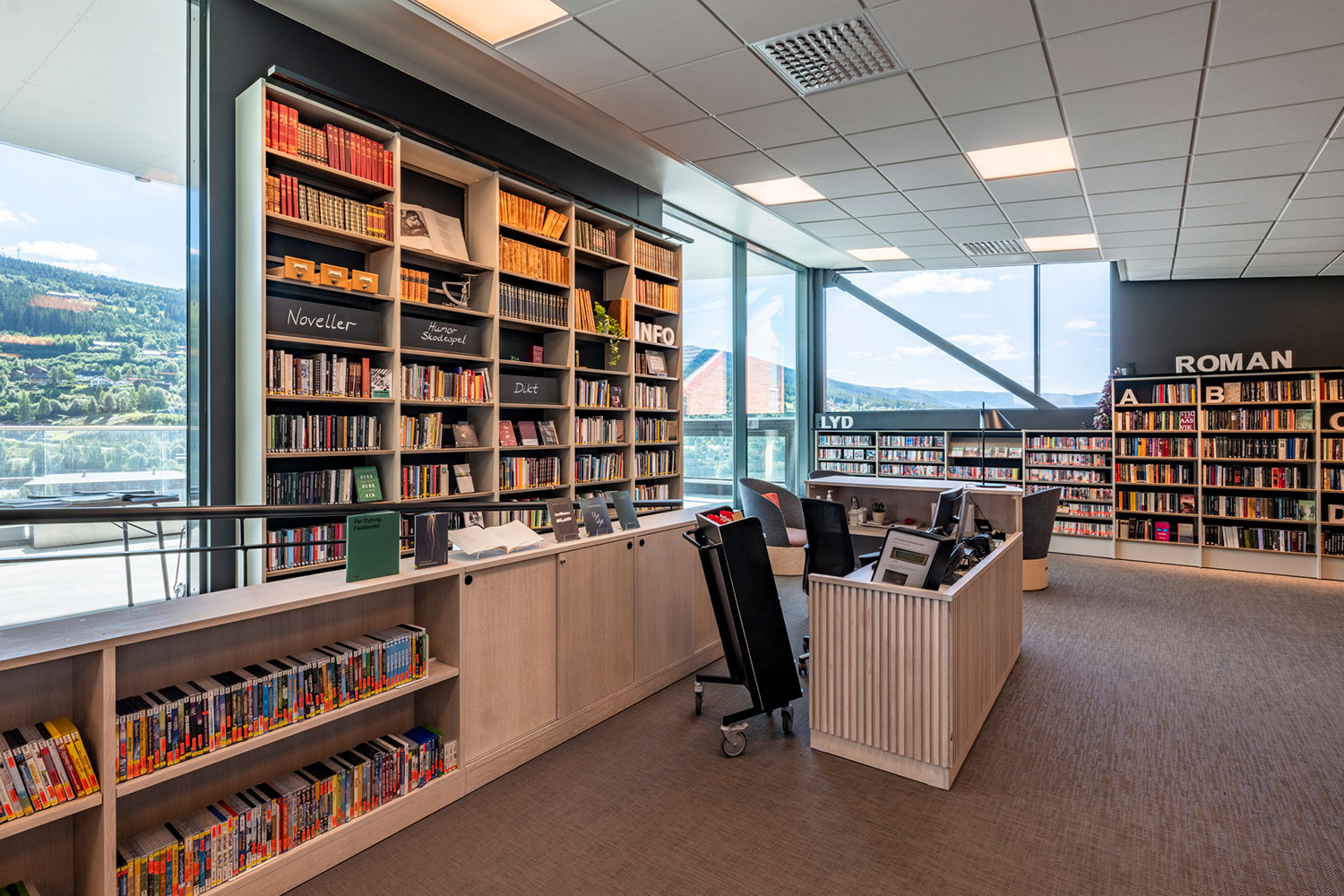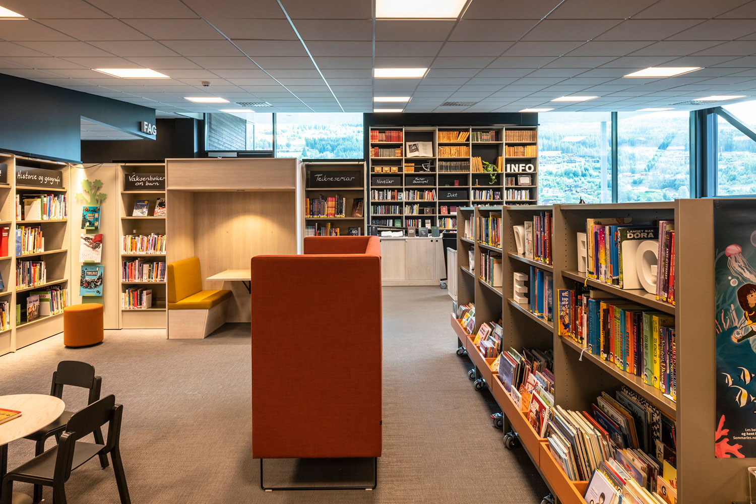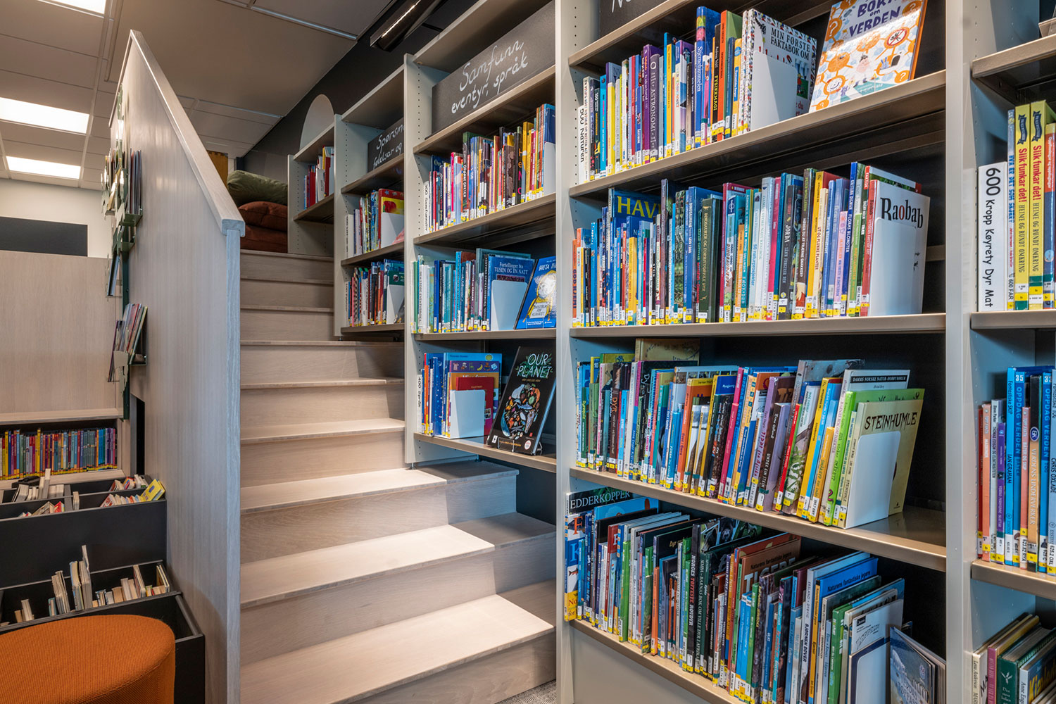 La bibliothèque de Ål a un emplacement exceptionnel au-dessus de la nouvelle extension de la maison de la culture. La conception de la bibliothèque met l’accent sur l’espace, la lumière et un ameublement adaptable et mobile. Une conception intérieure flexible permet aux locaux de s’adapter aux saisons, événements et activités, et les couleurs choisies sont inspirées par la tradition locale de peinture rosée.