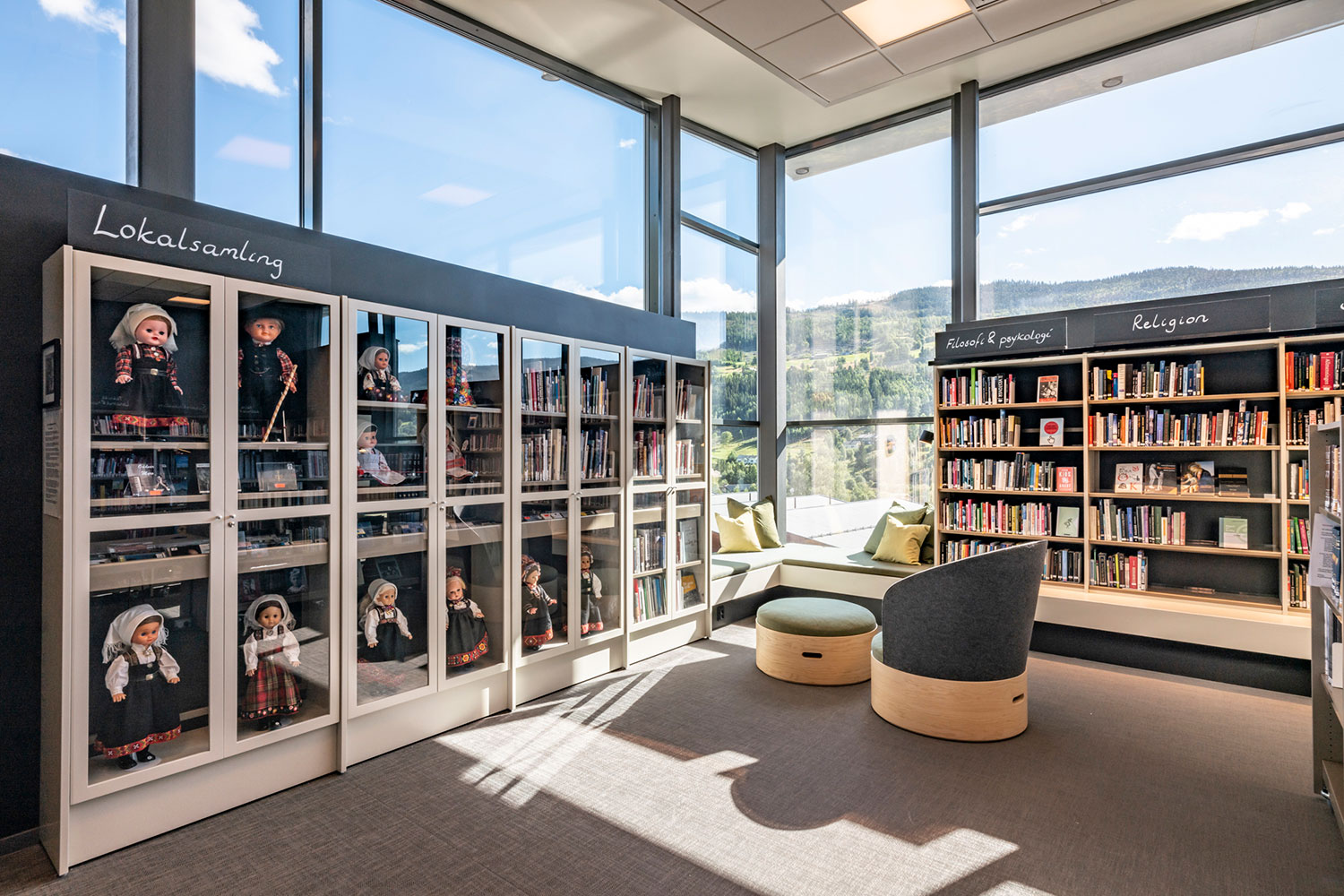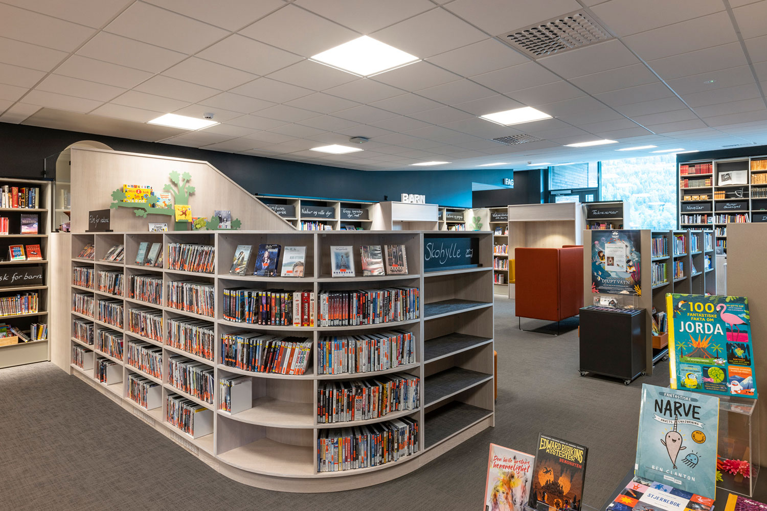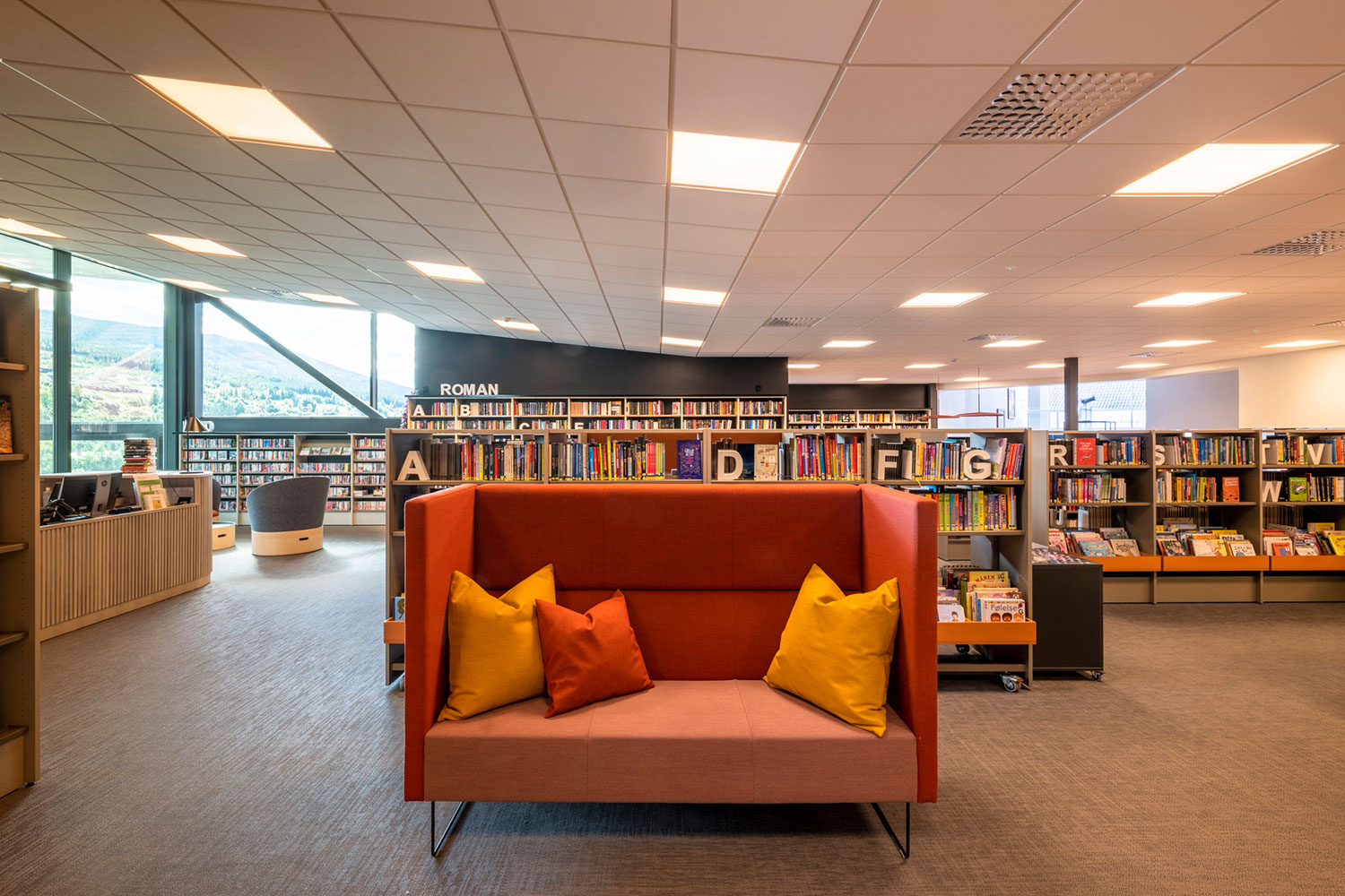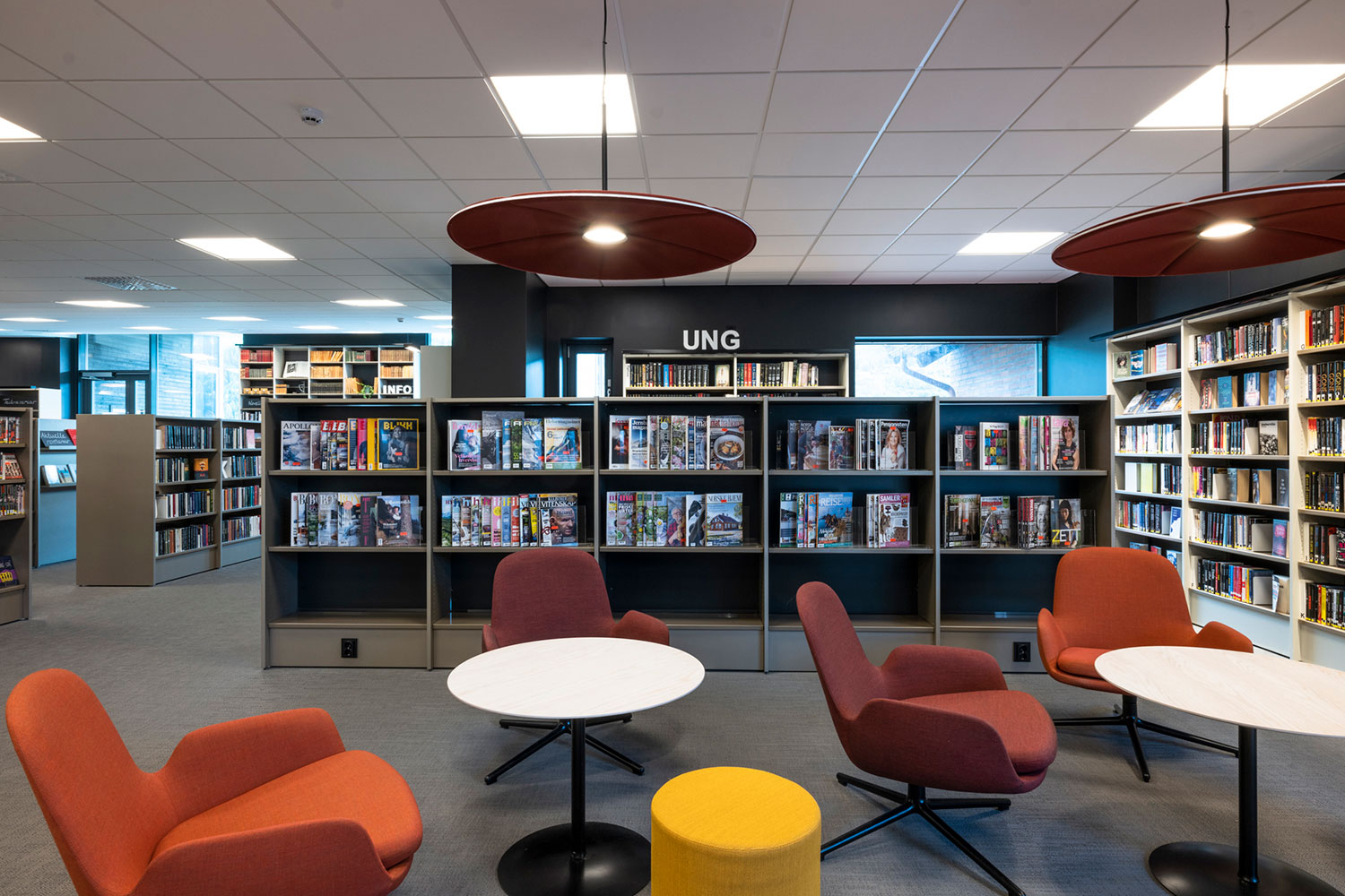 La bibliothèque de Ål a un emplacement exceptionnel au-dessus de la nouvelle extension de la maison de la culture. La conception de la bibliothèque met l’accent sur l’espace, la lumière et un ameublement adaptable et mobile. Une conception intérieure flexible permet aux locaux de s’adapter aux saisons, événements et activités, et les couleurs choisies sont inspirées par la tradition locale de peinture rosée.