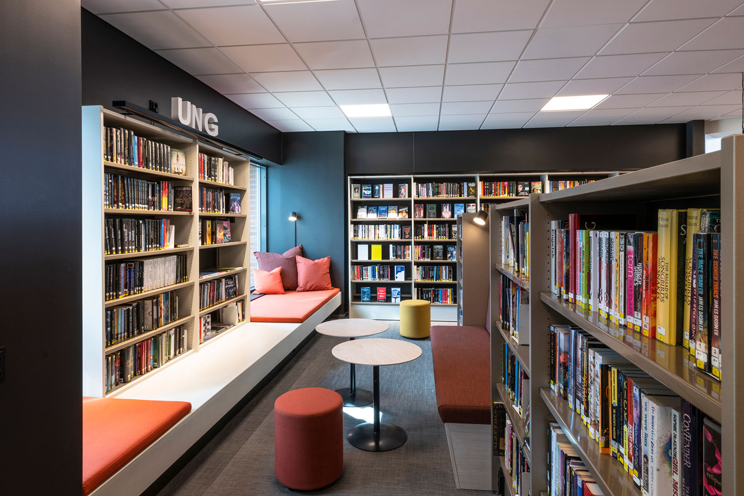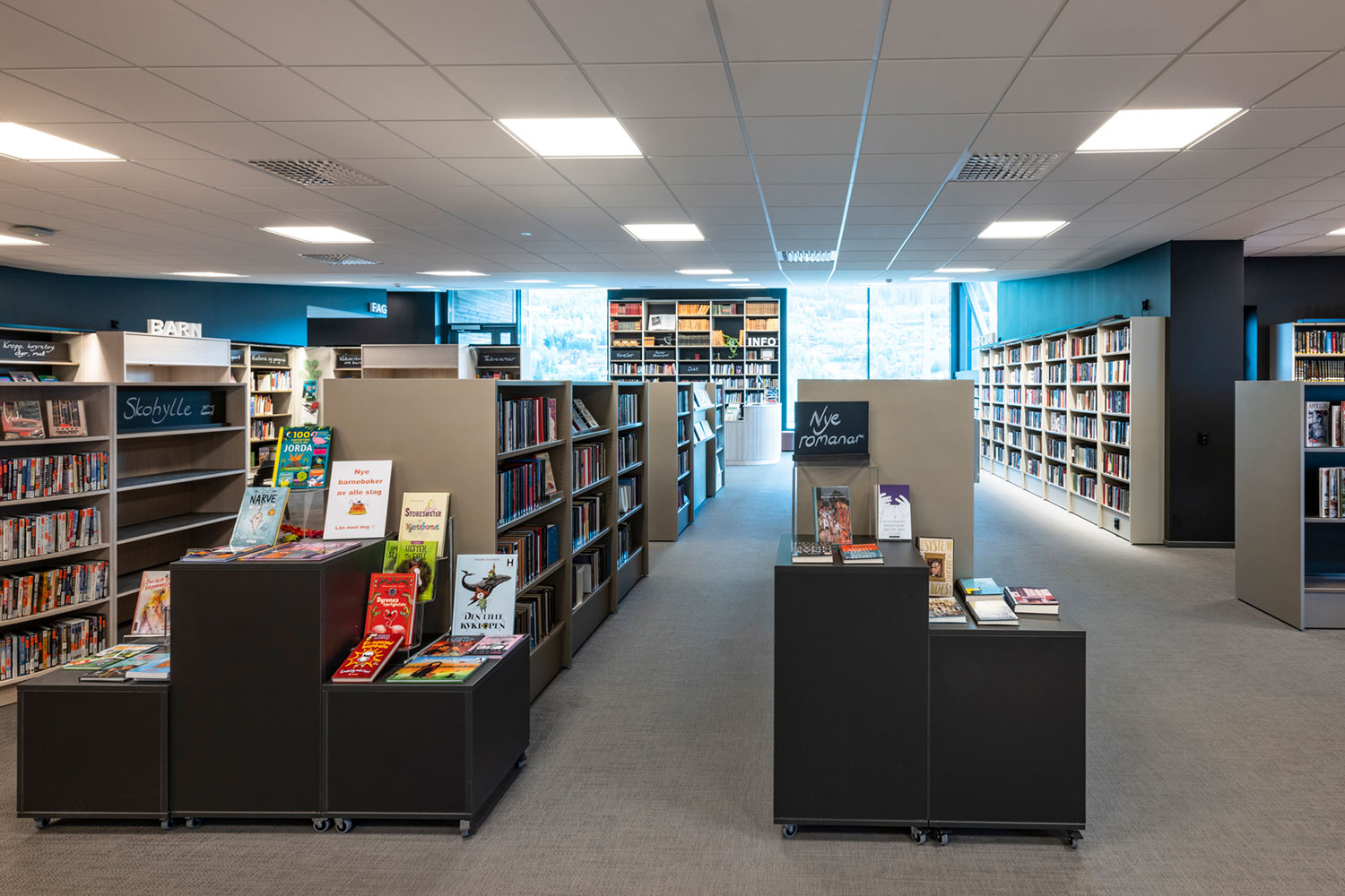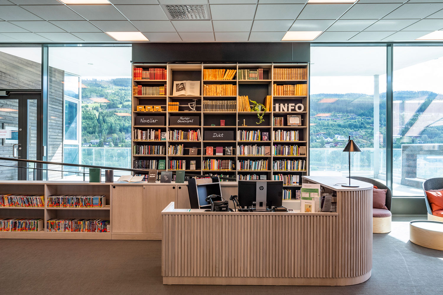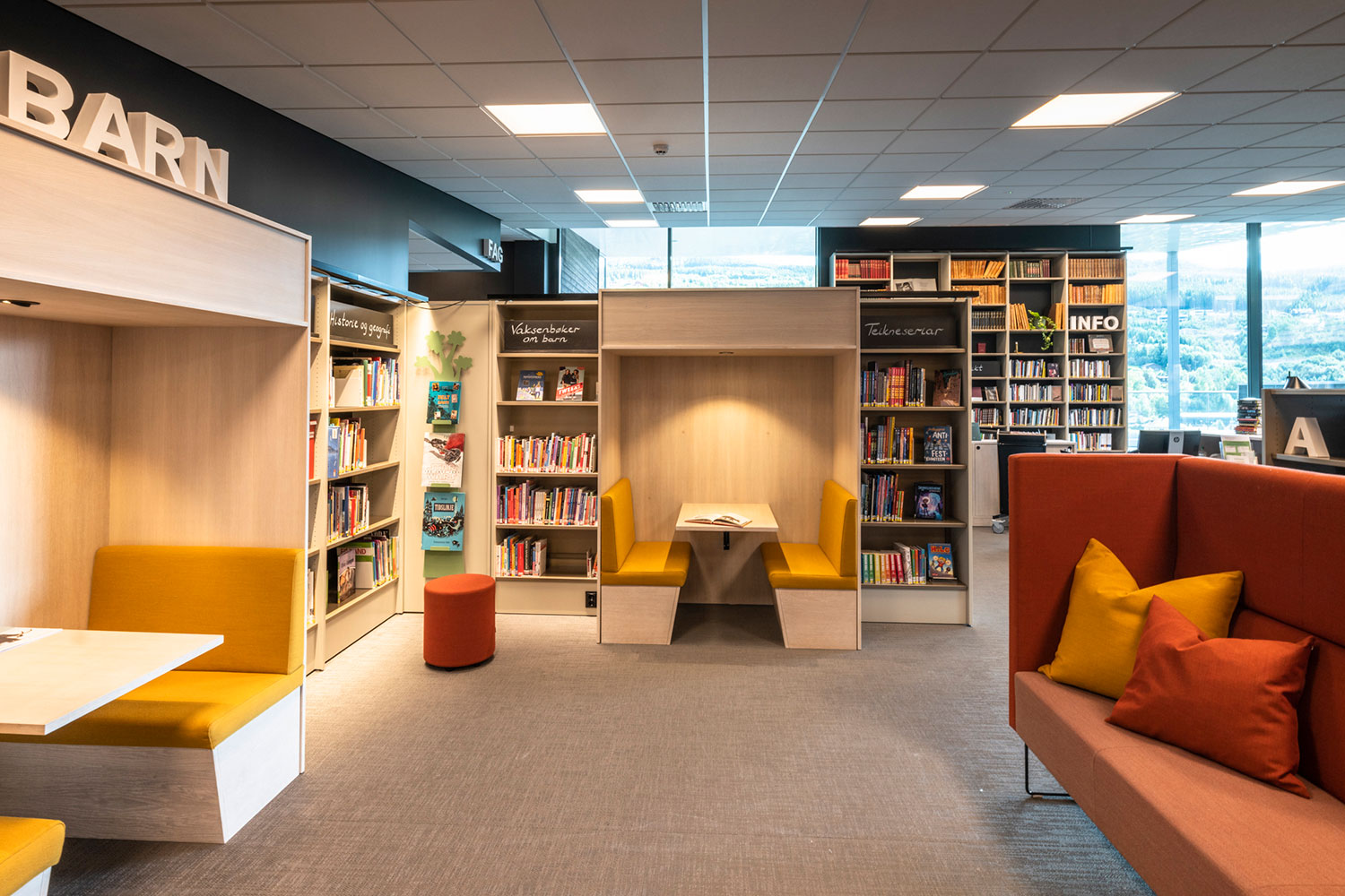 La bibliothèque de Ål a un emplacement exceptionnel au-dessus de la nouvelle extension de la maison de la culture. La conception de la bibliothèque met l’accent sur l’espace, la lumière et un ameublement adaptable et mobile. Une conception intérieure flexible permet aux locaux de s’adapter aux saisons, événements et activités, et les couleurs choisies sont inspirées par la tradition locale de peinture rosée.