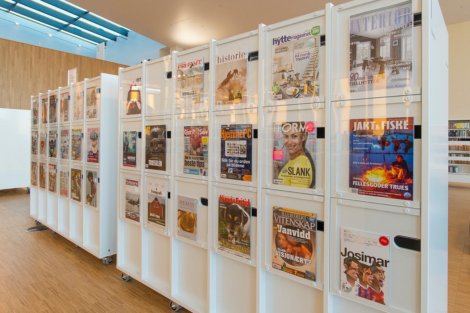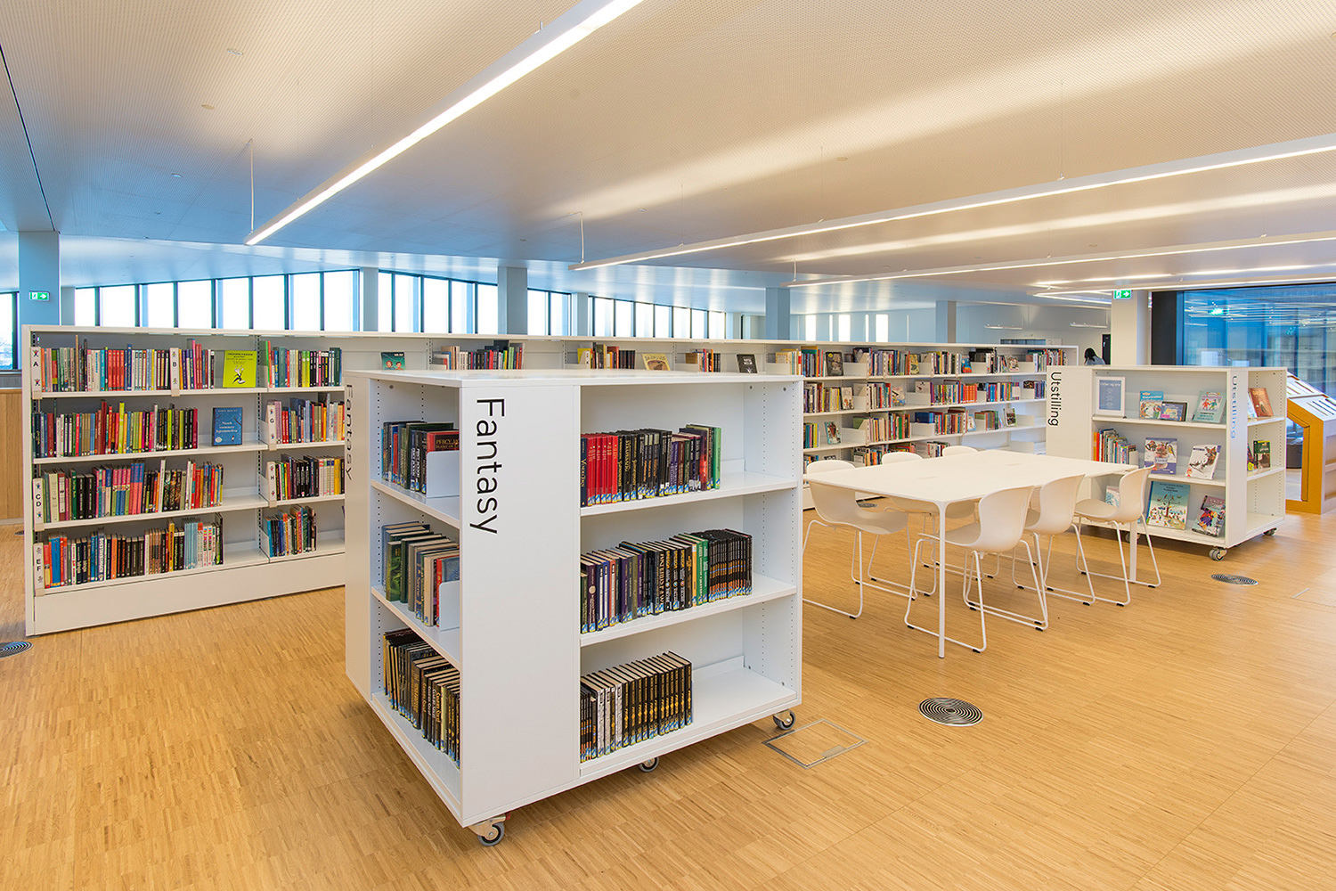 La bibliothèque a été conçue de manière aérée et spacieuse. Son mobilier a été soigneusement sélectionné pour créer une harmonie parfaite avec cet environnement à la fois vaste et lumineux. Une particularité : le même mobilier se décline sous de nombreuses variantes au sein de la bibliothèque. La zone enfants, par exemple, a été aménagée avec des systèmes de rayonnage spécialement adaptés à leur taille et la zone adultes a été décorée avec le même mobilier – adapté à la taille des adultes, bien sûr. Ce principe s’applique à l’ensemble de la bibliothèque.
